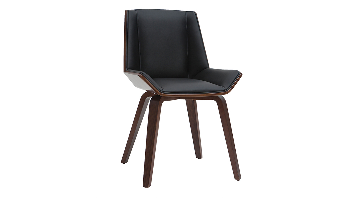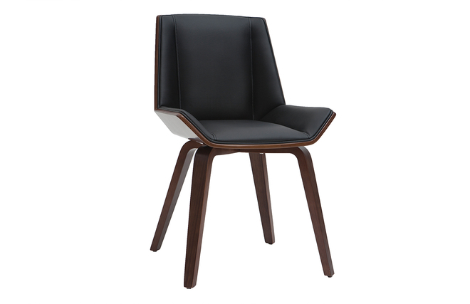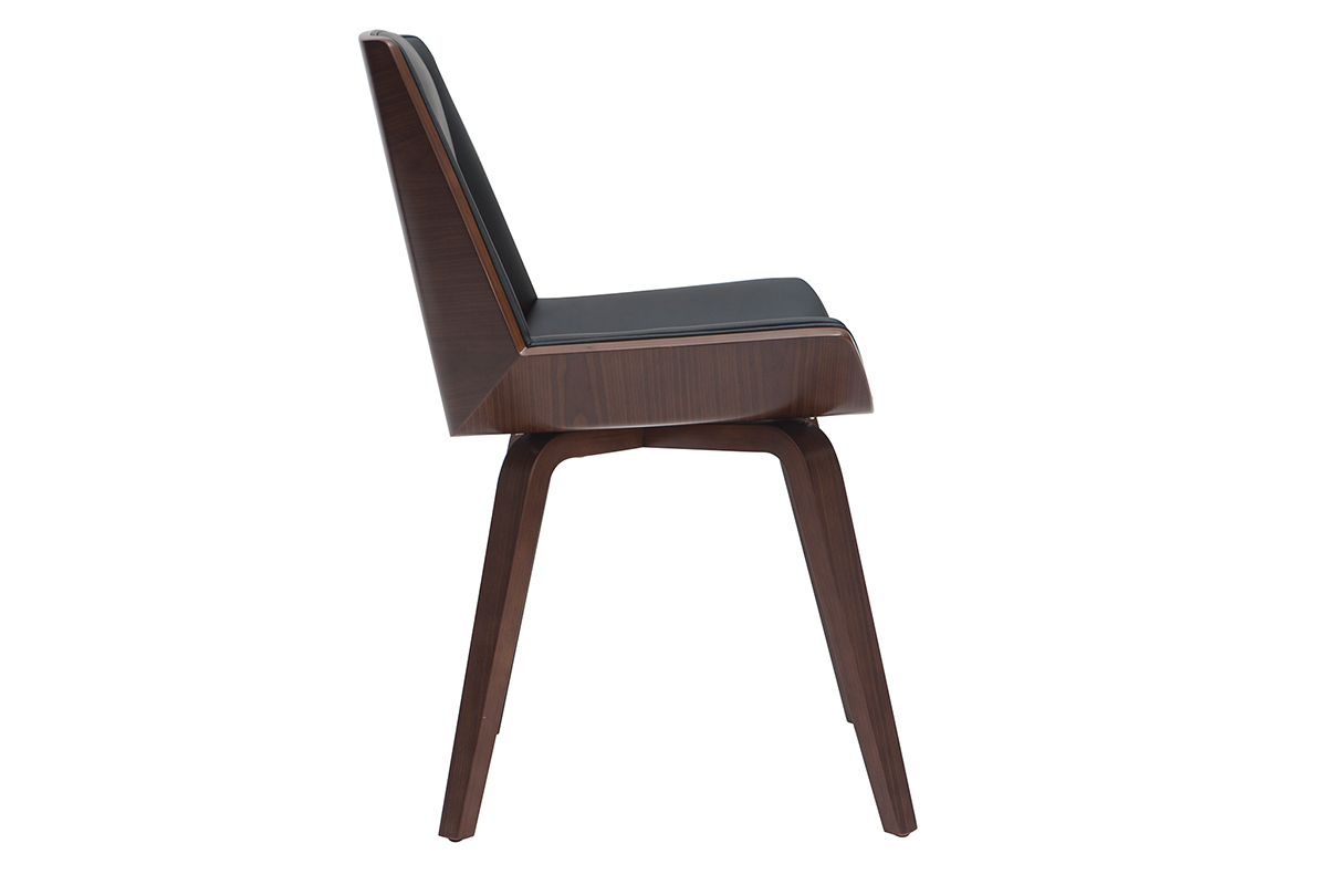 Cette chaise de salle à manger joue la carte des contrastes et des mélanges avec brio. On aime l'association du polyuréthane noir et du placage noyer, à la fois moderne et élégante. Le mariage entre un piètement aux lignes arrondies et une assise au découpage géométrique font de cette chaise design un élément clé autour d'une table à manger. Parfait pour créer un espace repas à la fois tendance et chaleureux !
