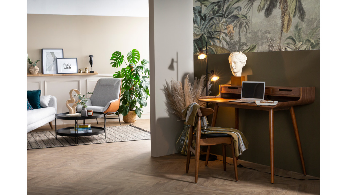 Matière : panneaux de fibres de bois placage noyer et pieds en hévéa massif
