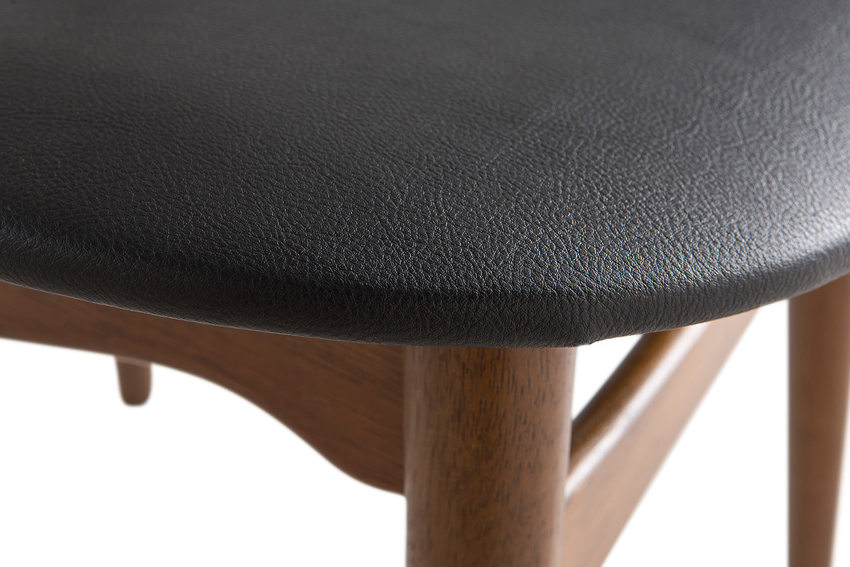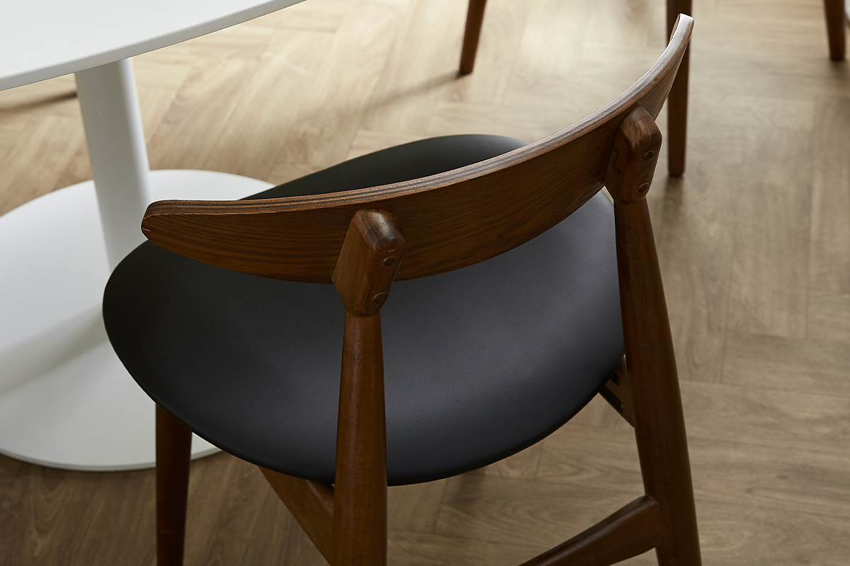 Disposées autour d'une table en bois, ces chaises en bois foncé et assises noires apporteront à la fois de la lumière à votre salle à manger et une touche tendance grâce à l'originalité du contraste entre une structure et un piètement en hévéa massif teinté bois foncé et une assise habillée d'un revêtement en polyuréthane noire.