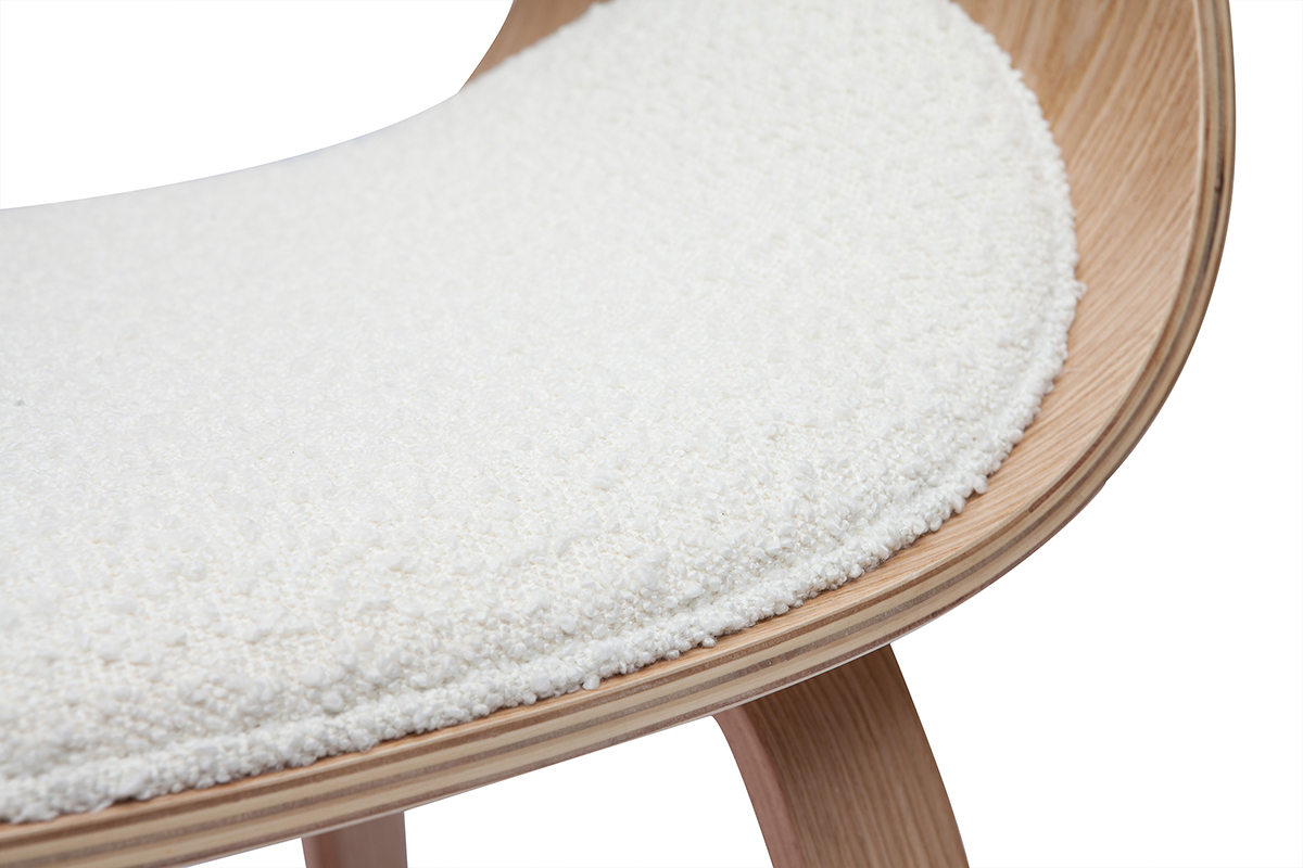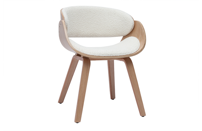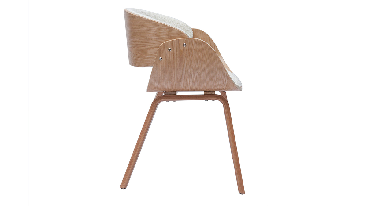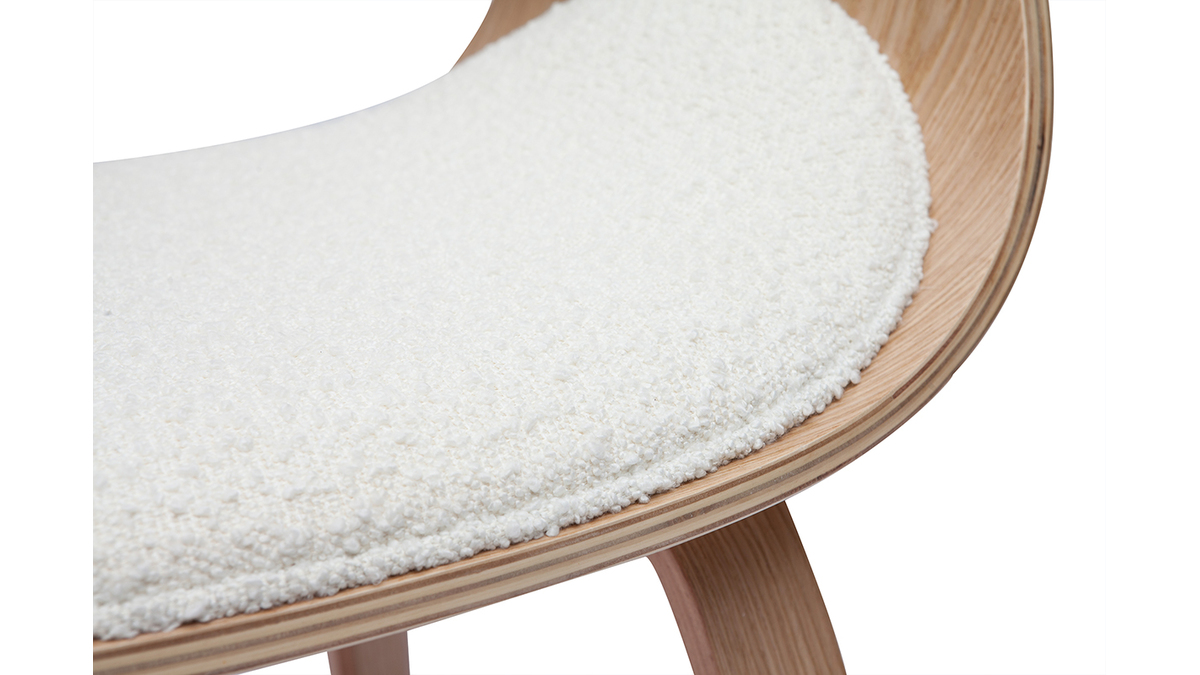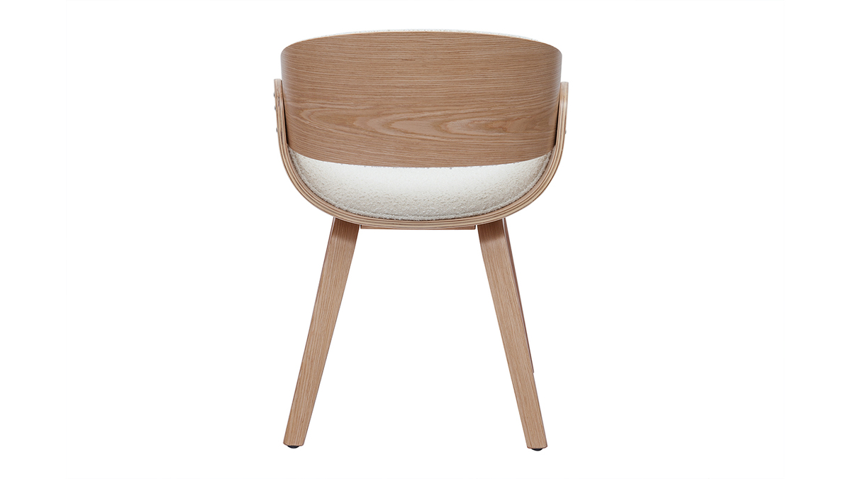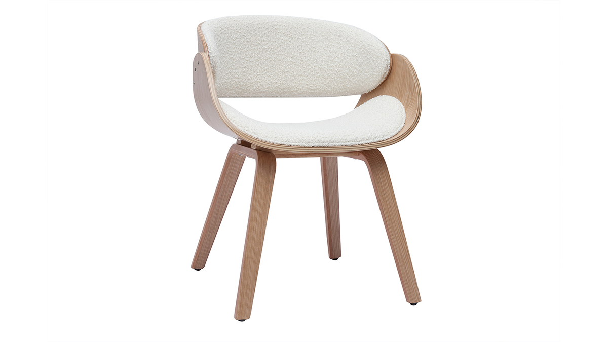 Le modèle BENT se renouvelle dans une version chaise design au look scandi-rétro, ultra tendance ! Tout aussi confortable que le fauteuil de bureau ou la chaise de bar de la même collection, la chaise BENT est composée d'un piètement et d'un dossier en contreplaqué érable laissant apparaître les veines du bois clair. Rendu authentique garanti dans votre pièce de vie. Si le revêtement en tissu effet laine bouclée blanc (100% polyester) apportera une touche chaleureuse et sobre à votre intérieur, cette chaise scandinave saura également vous séduire par sa silhouette unique - savoureux mélange d'inspirations scandinave et vintage. Voilà une chaise design en bois moderne qui sera à l'aise dans de nombreux styles de décoration d'intérieur !
