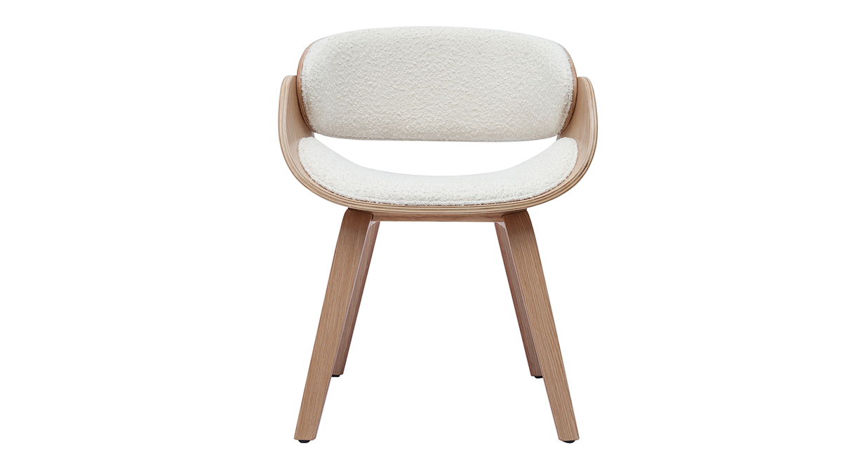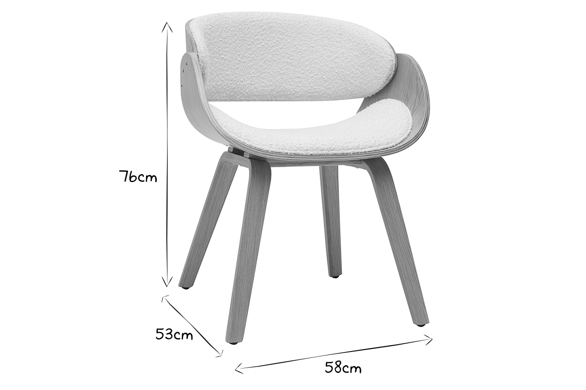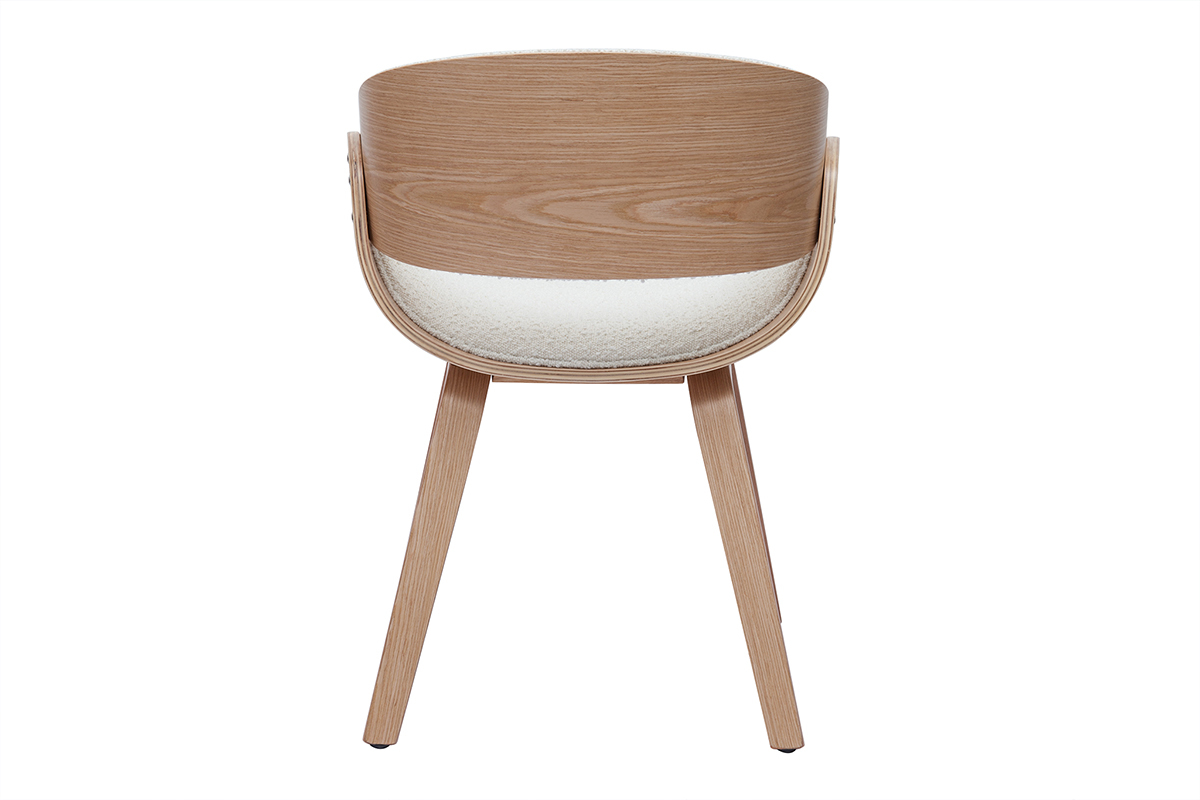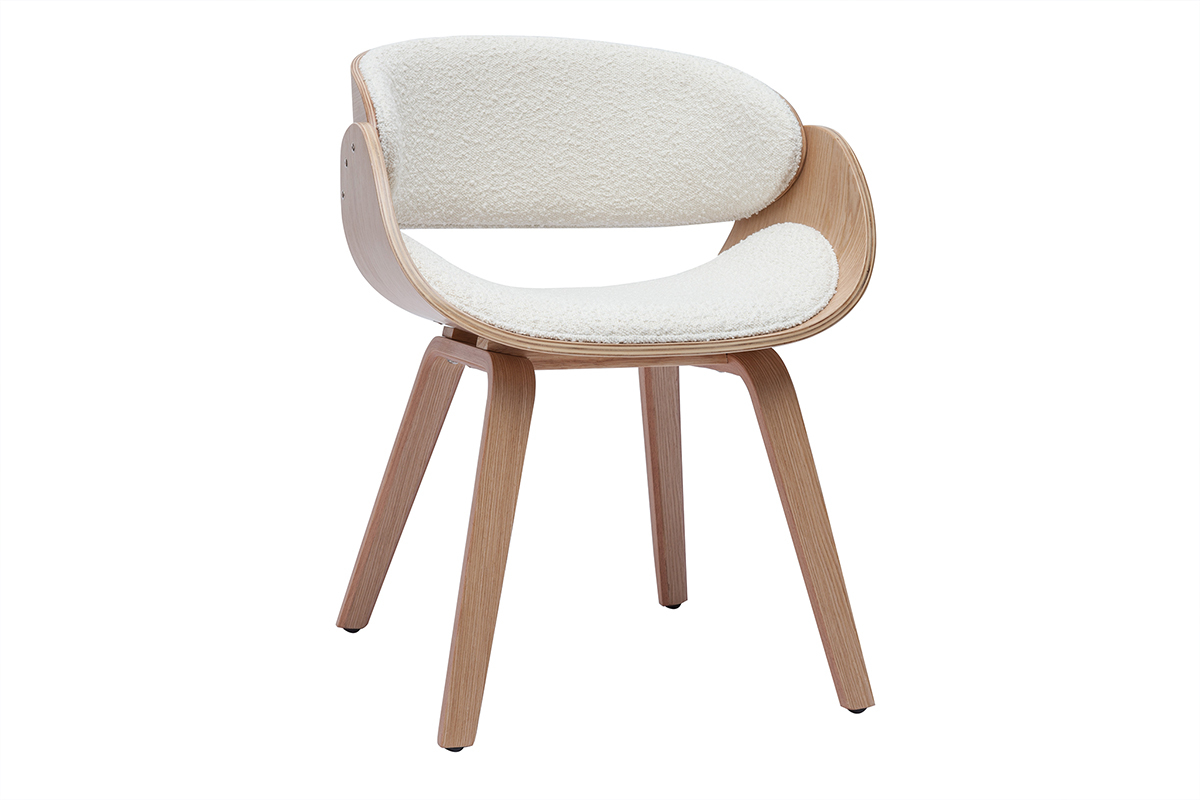 Le modèle BENT se renouvelle dans une version chaise design au look scandi-rétro, ultra tendance ! Tout aussi confortable que le fauteuil de bureau ou la chaise de bar de la même collection, la chaise BENT est composée d'un piètement et d'un dossier en contreplaqué érable laissant apparaître les veines du bois clair. Rendu authentique garanti dans votre pièce de vie. Si le revêtement en tissu effet laine bouclée blanc (100% polyester) apportera une touche chaleureuse et sobre à votre intérieur, cette chaise scandinave saura également vous séduire par sa silhouette unique - savoureux mélange d'inspirations scandinave et vintage. Voilà une chaise design en bois moderne qui sera à l'aise dans de nombreux styles de décoration d'intérieur !
