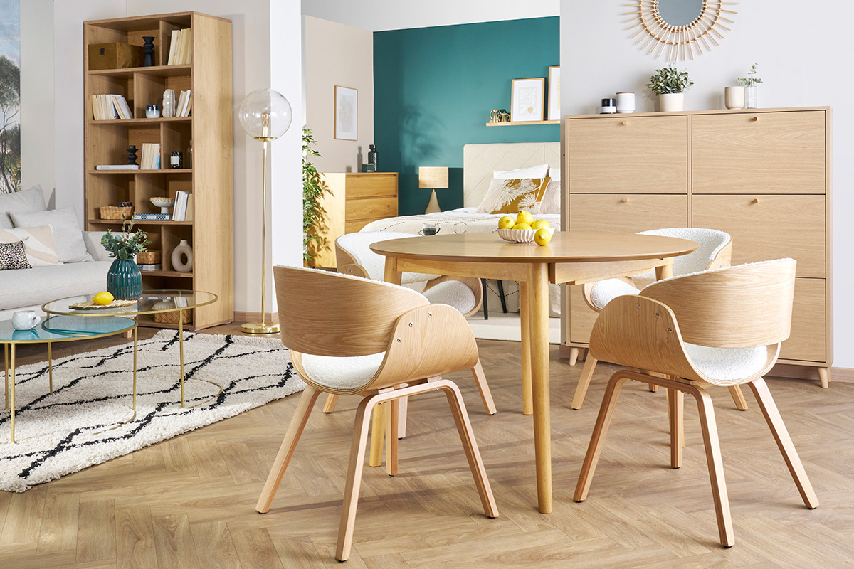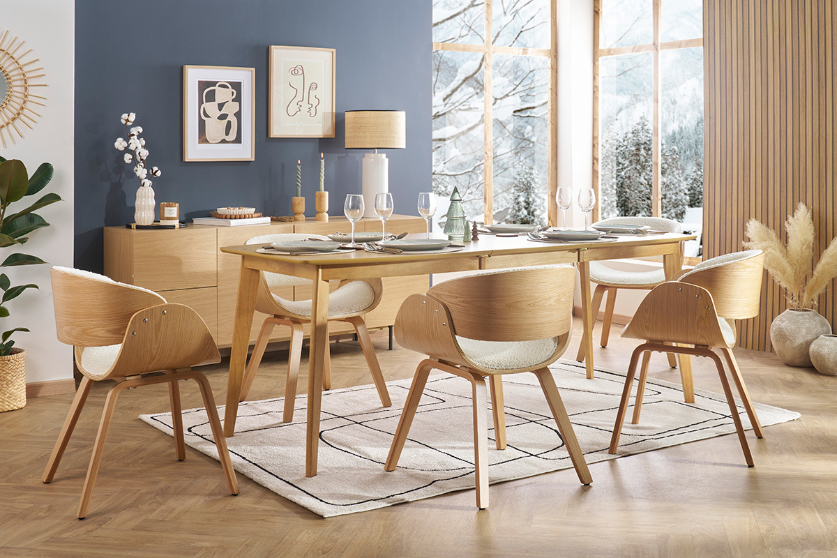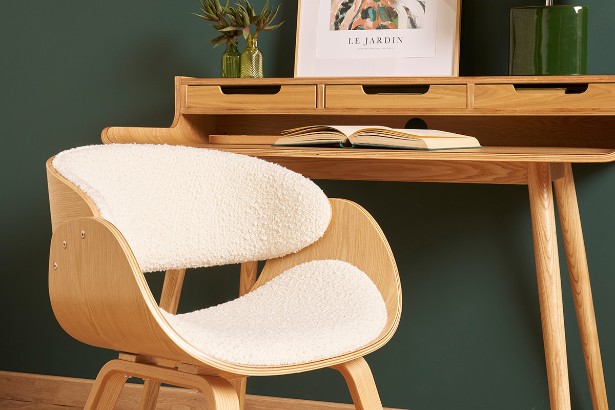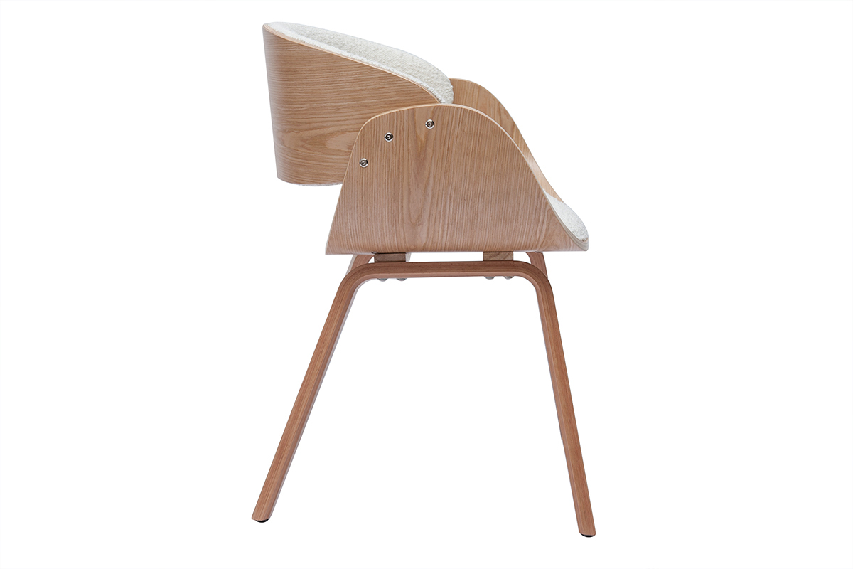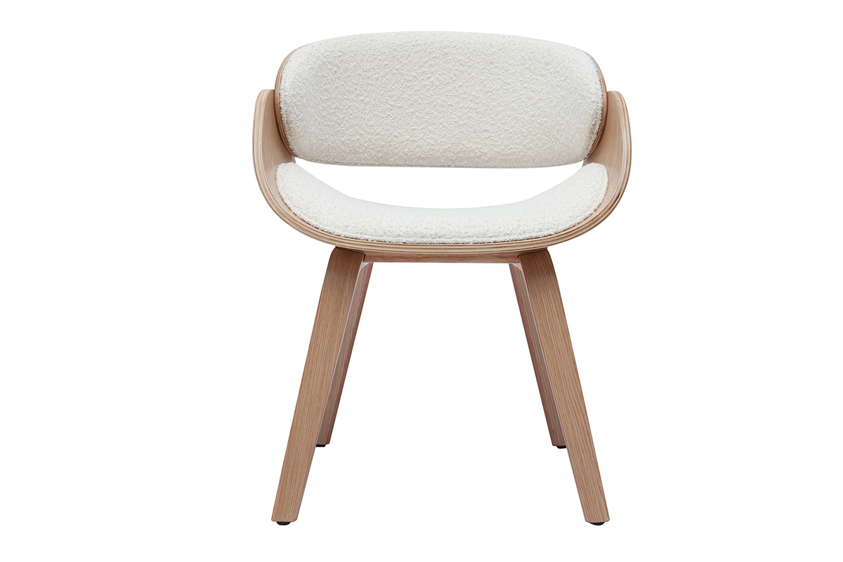 Le modèle BENT se renouvelle dans une version chaise design au look scandi-rétro, ultra tendance ! Tout aussi confortable que le fauteuil de bureau ou la chaise de bar de la même collection, la chaise BENT est composée d'un piètement et d'un dossier en contreplaqué érable laissant apparaître les veines du bois clair. Rendu authentique garanti dans votre pièce de vie. Si le revêtement en tissu effet laine bouclée blanc (100% polyester) apportera une touche chaleureuse et sobre à votre intérieur, cette chaise scandinave saura également vous séduire par sa silhouette unique - savoureux mélange d'inspirations scandinave et vintage. Voilà une chaise design en bois moderne qui sera à l'aise dans de nombreux styles de décoration d'intérieur !