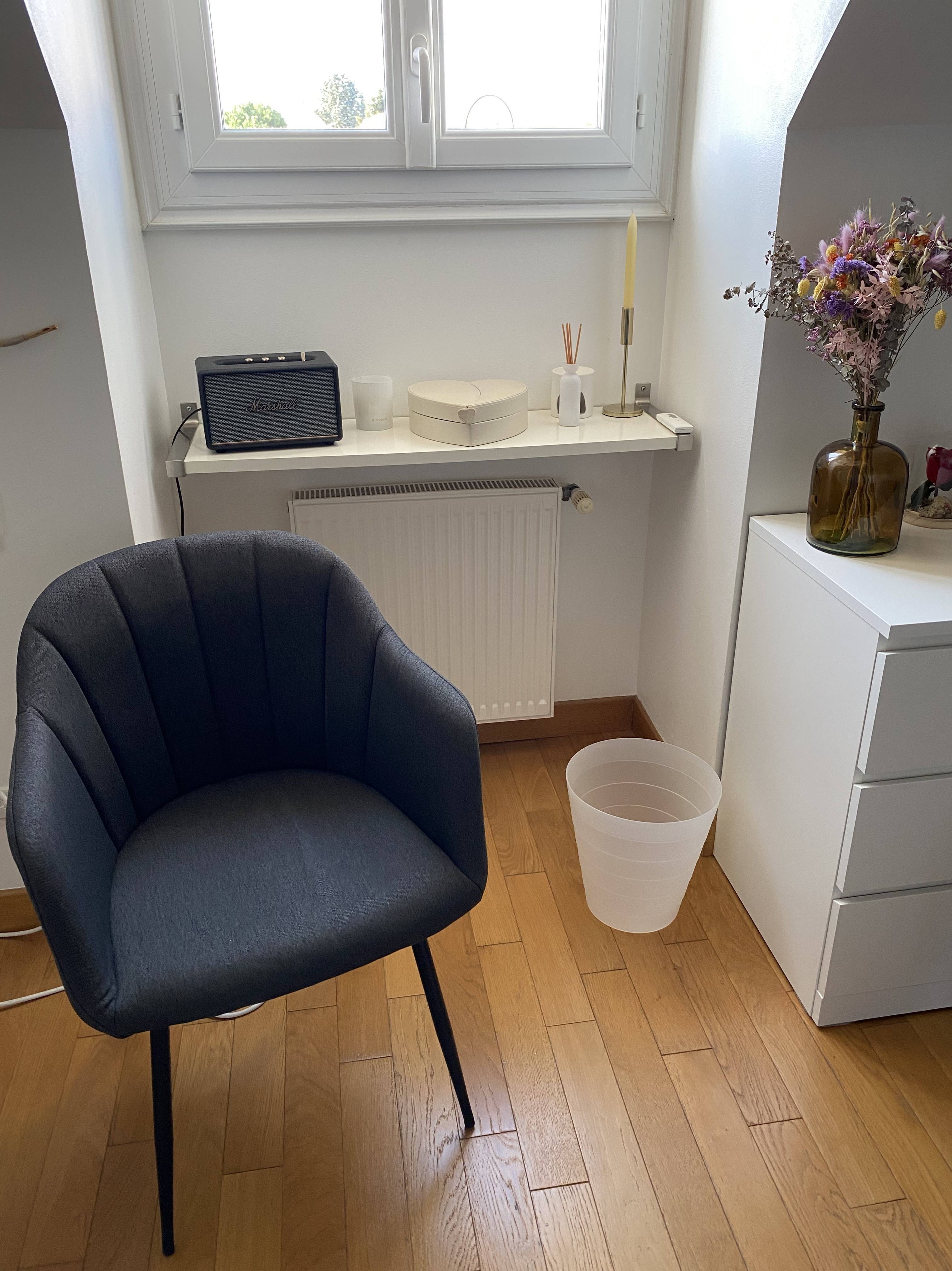 Élégante et raffinée, elle marie avec aisance son assise en tissu gris foncé à des pieds fuselés en métal noir. Ce piètement aérien vient parfaire son look et signe son style ultra contemporain.