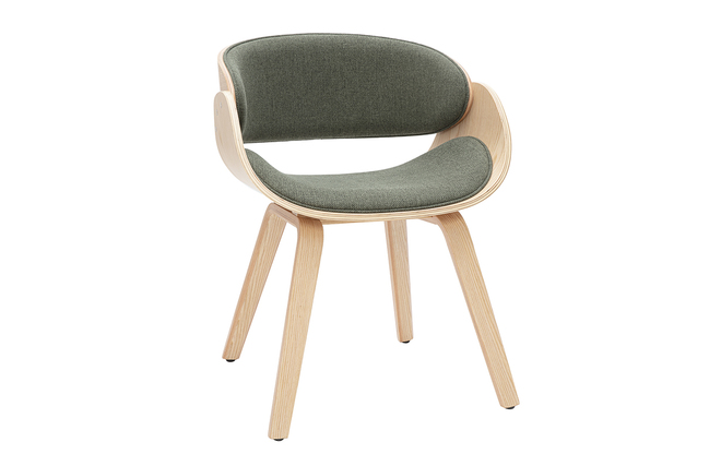 Les courbes atypiques de cette chaise en bois clair et kaki se tiennent prêtes à vous combler de confort !