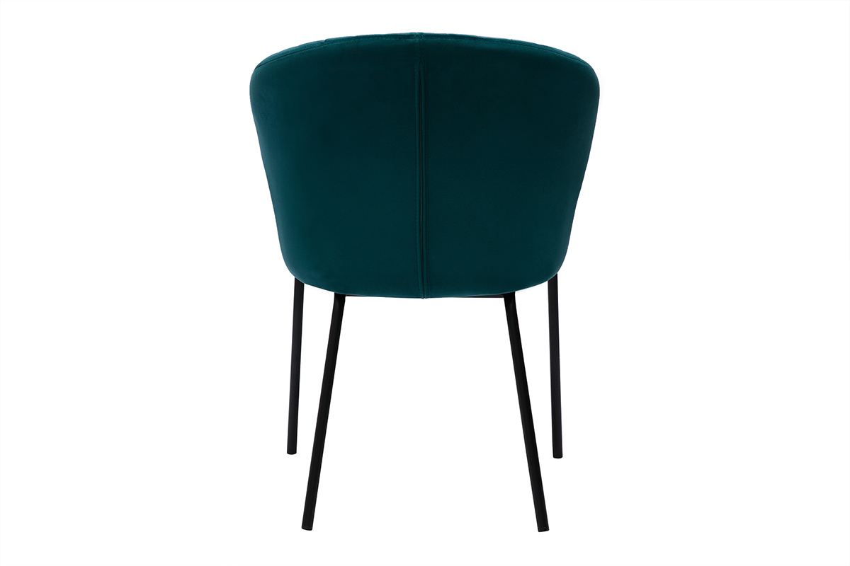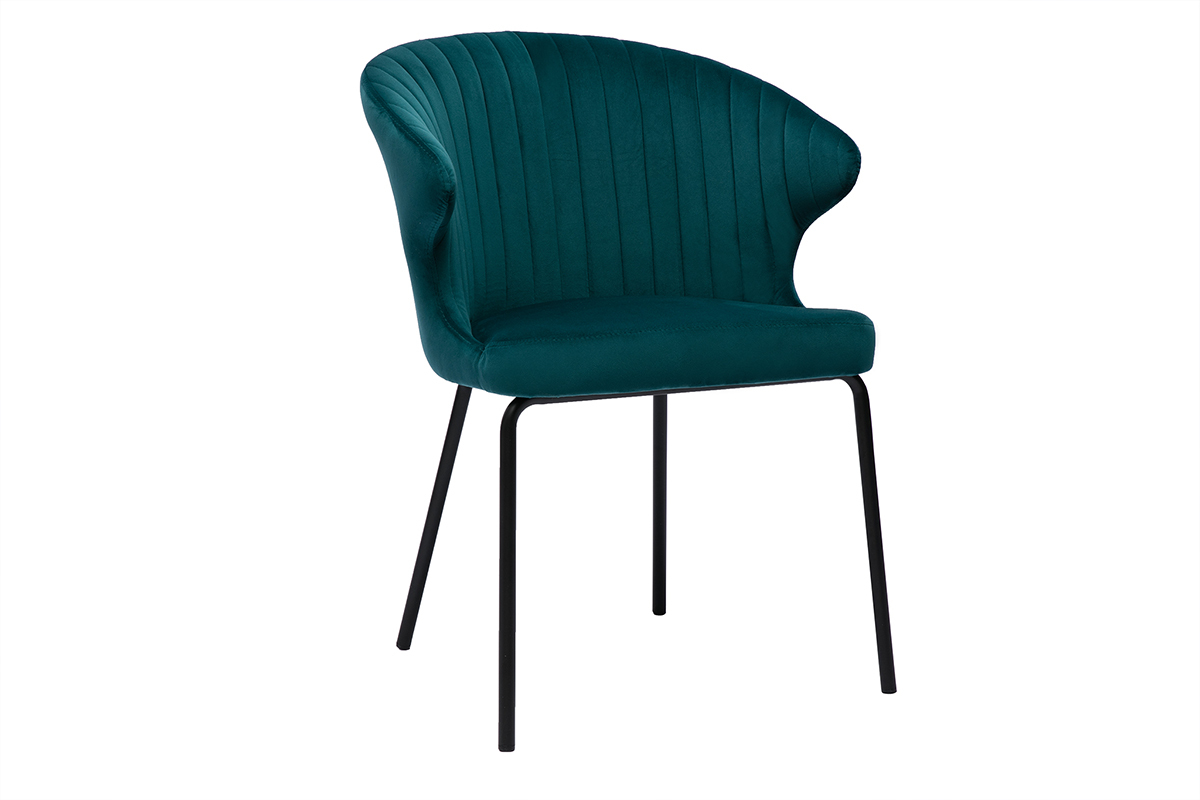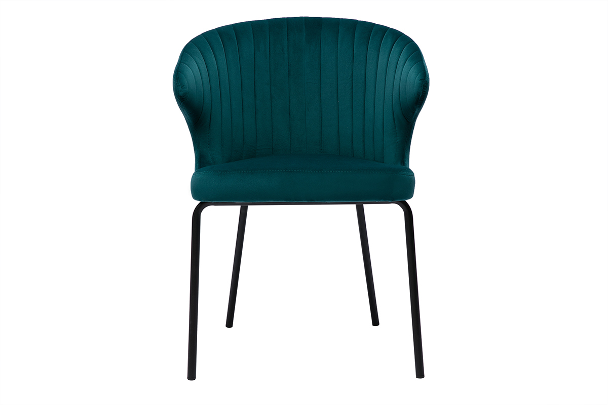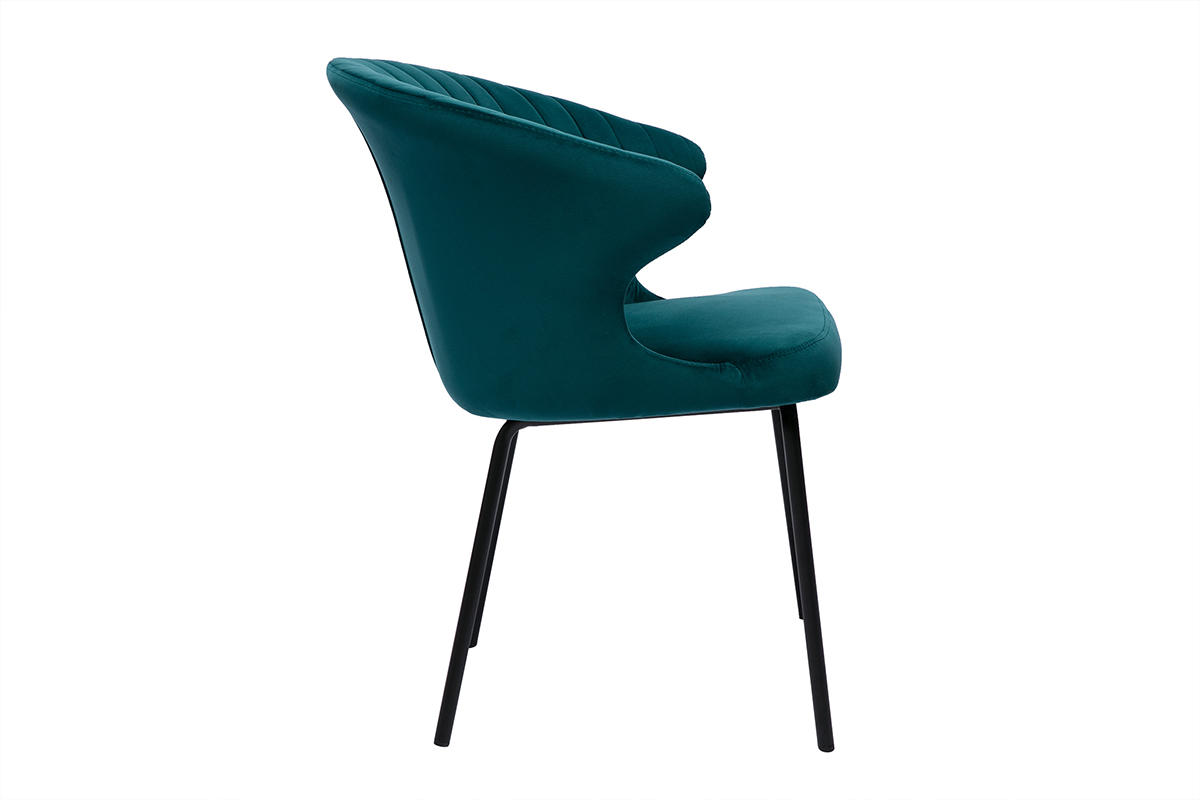 Cette chaise fauteuil bleu canard et métal noir intégrera aussi bien un salon comme siège d'appoint qu'une salle à manger en fauteuil de table. Le siège est intégralement garni de mousse pour un effet rembourré qui garantit un bon confort d'assise.