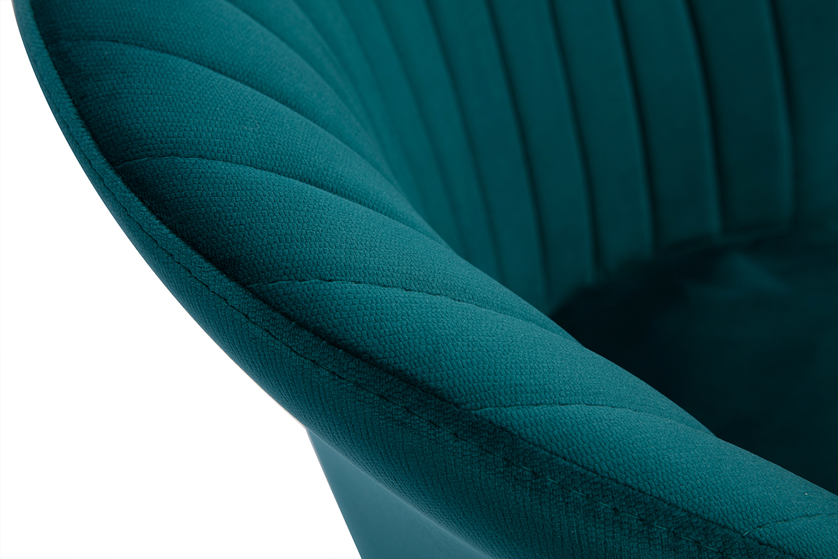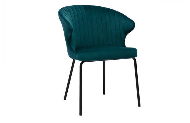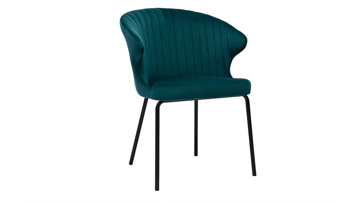Ses lignes rétro et la délicatesse de ses matériaux font de cette chaise design de salle à manger une assise chic et glamour. Composée d'une structure en métal noir et d'un siège en tissu velours gaufré, cette chaise bleu canard fera de la pièce de vie un espace raffiné et chaleureux. Son dossier incurvé strié épouse la forme du corps et met l'accent sur son élégant style vintage. Le revêtement en velours, matériau indémodable, est idéal pour se créer un intérieur cosy invitant à la détente. Quant au piétement métallique et au coloris bleu pétrole de l'assise, ils ont été choisis pour leur côté intemporel et leur noblesse.