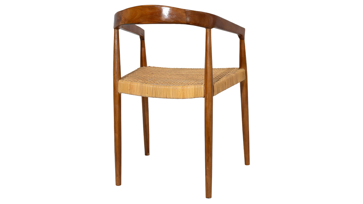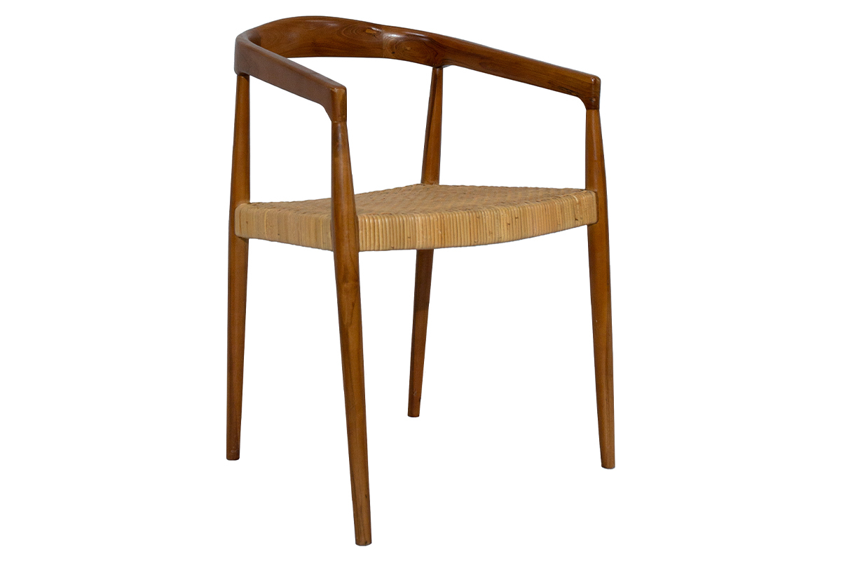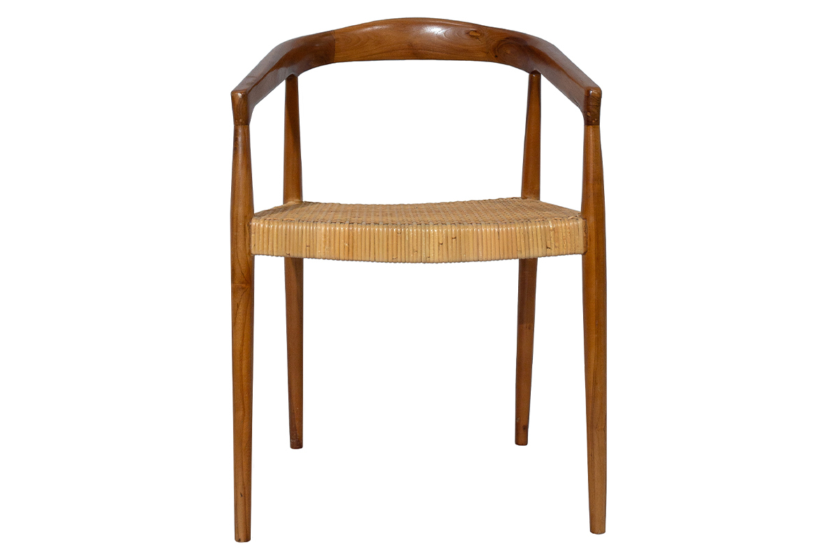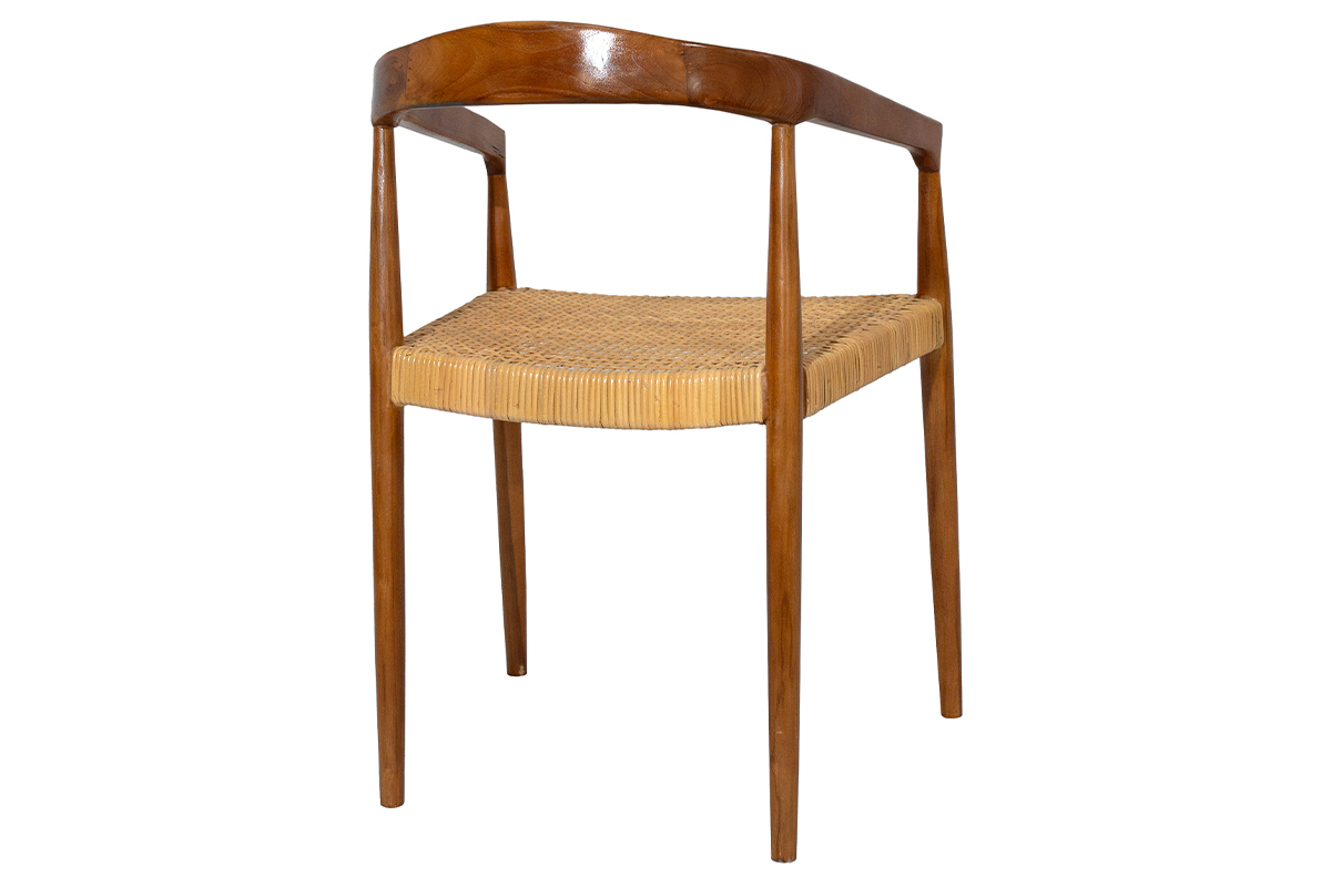 Le large dossier galbé et ajouré prolonge ses lignes vers un stable et solide piètement. Ce sculptural ensemble en bois massif est complété par une accueillante assise formée par un résistant cannage de rotin. À la fois robuste et tout en légèreté, facile à déplacer et à entretenir, loin des standards et des phénomènes de mode, cette chaise avec accoudoirs est faite pour durer !
