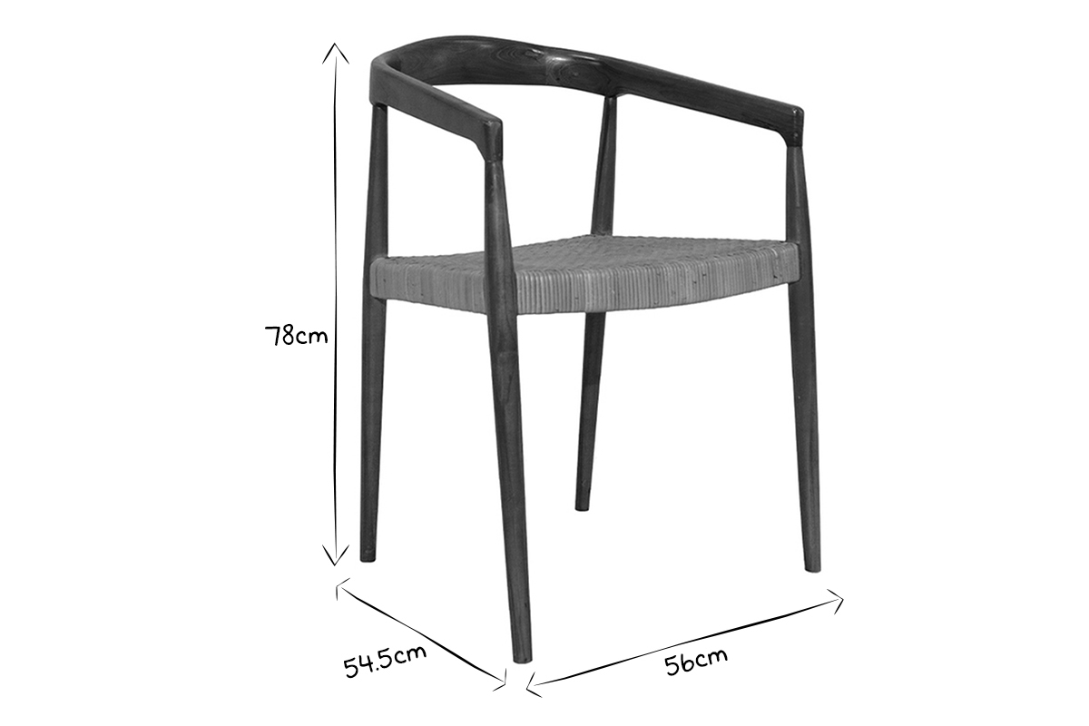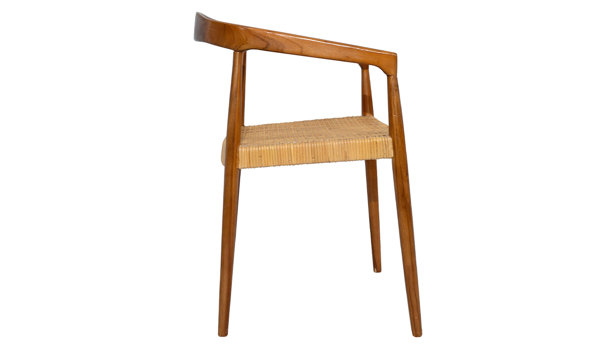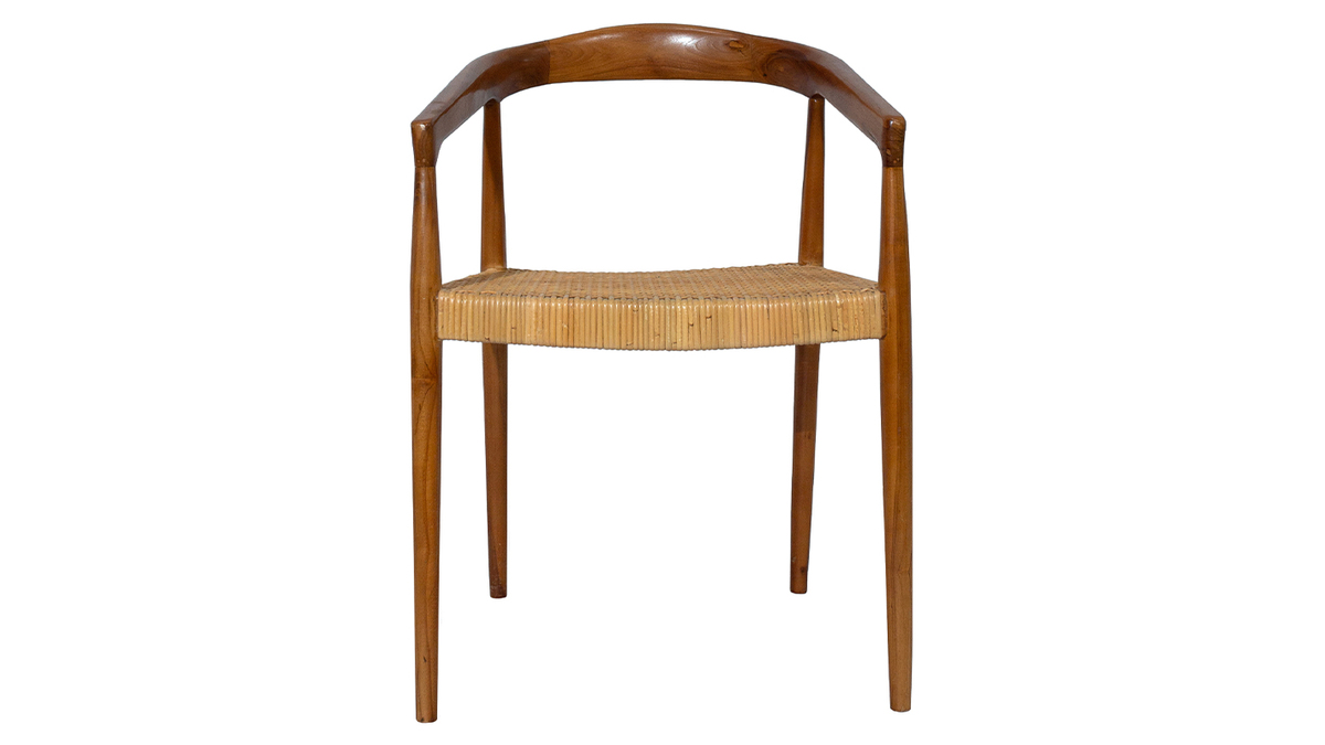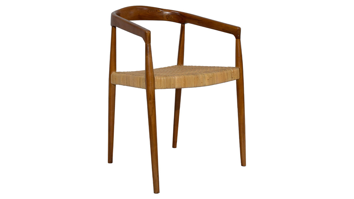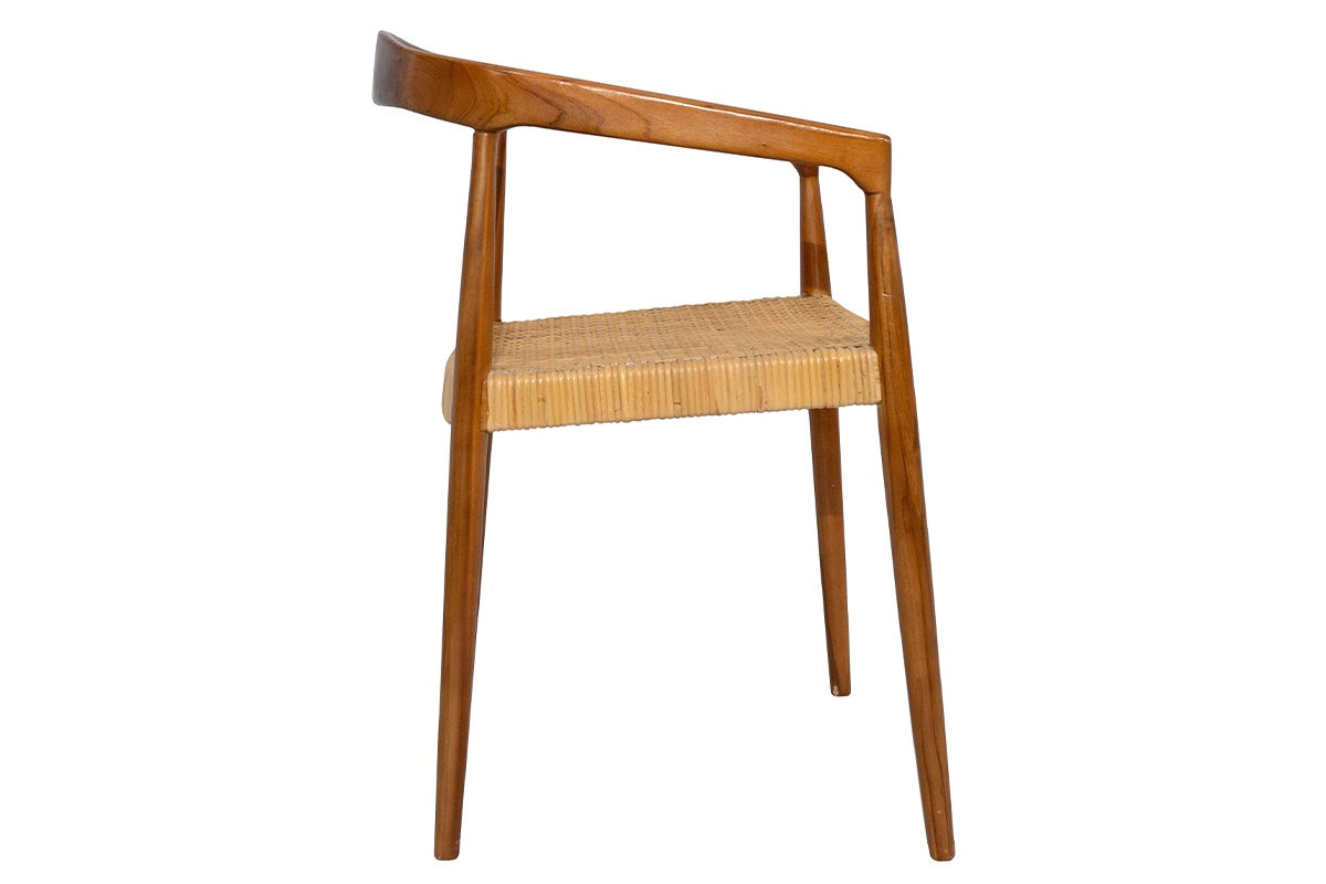 Le large dossier galbé et ajouré prolonge ses lignes vers un stable et solide piètement. Ce sculptural ensemble en bois massif est complété par une accueillante assise formée par un résistant cannage de rotin. À la fois robuste et tout en légèreté, facile à déplacer et à entretenir, loin des standards et des phénomènes de mode, cette chaise avec accoudoirs est faite pour durer !