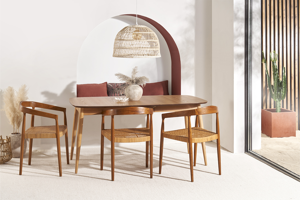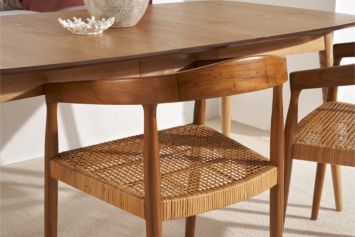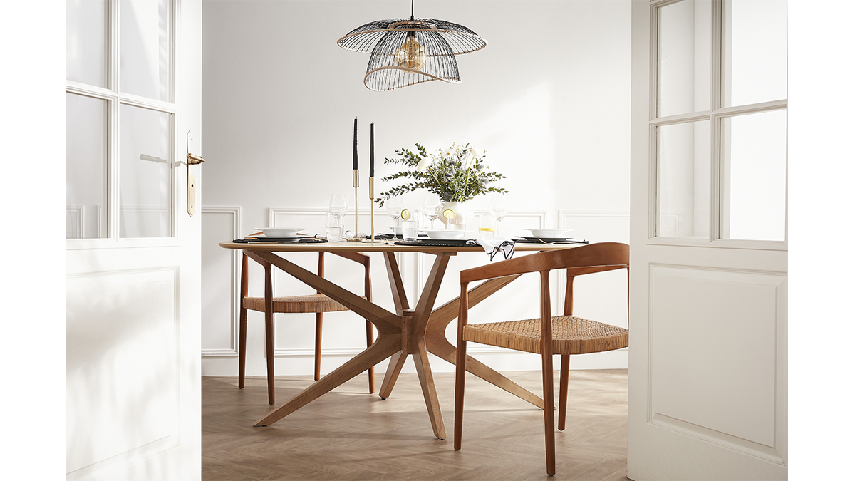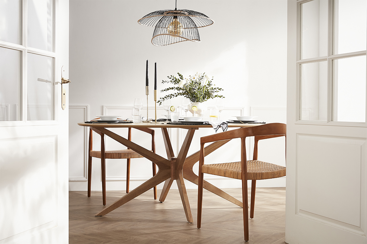 En solo dans une entrée, une chambre ou un bureau, multipliée ou dépareillée autour d'une table à manger, la silhouette aérienne de cette chaise en bois massif s'envisage dans de nombreuses pièces de vie.