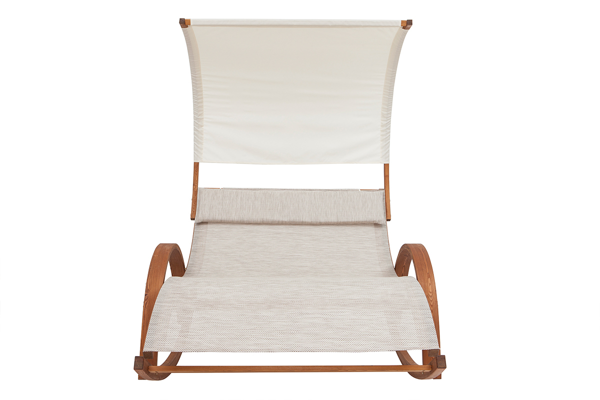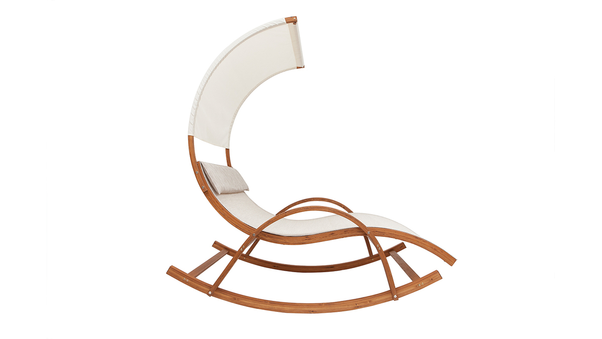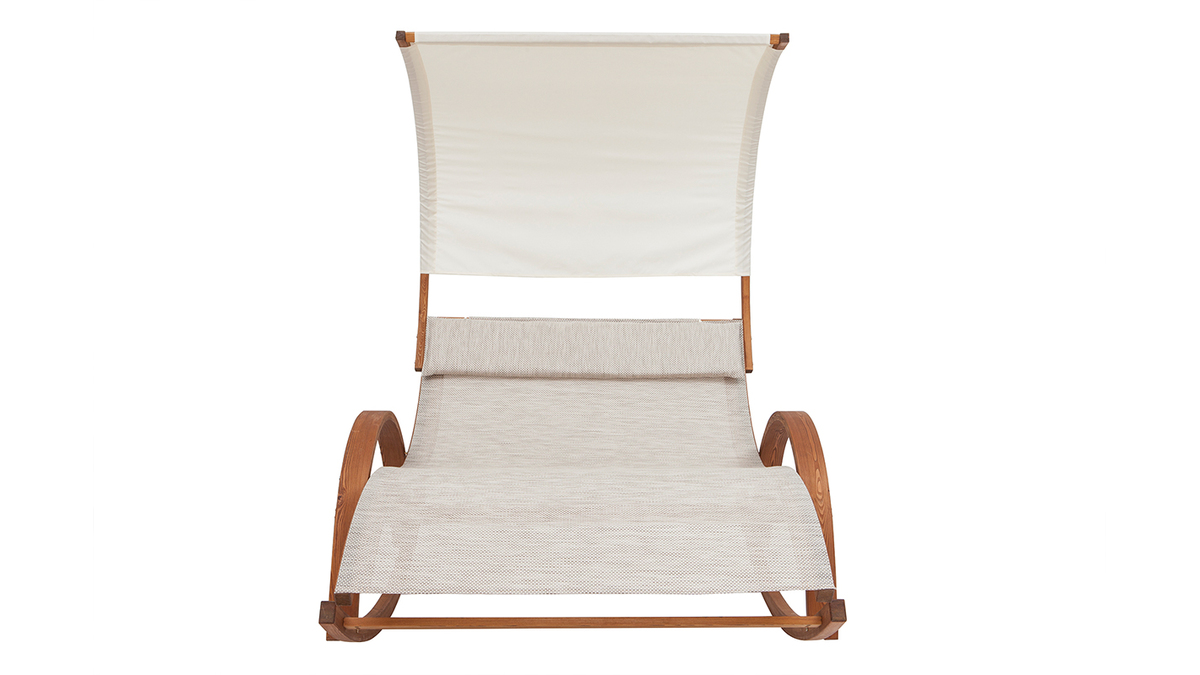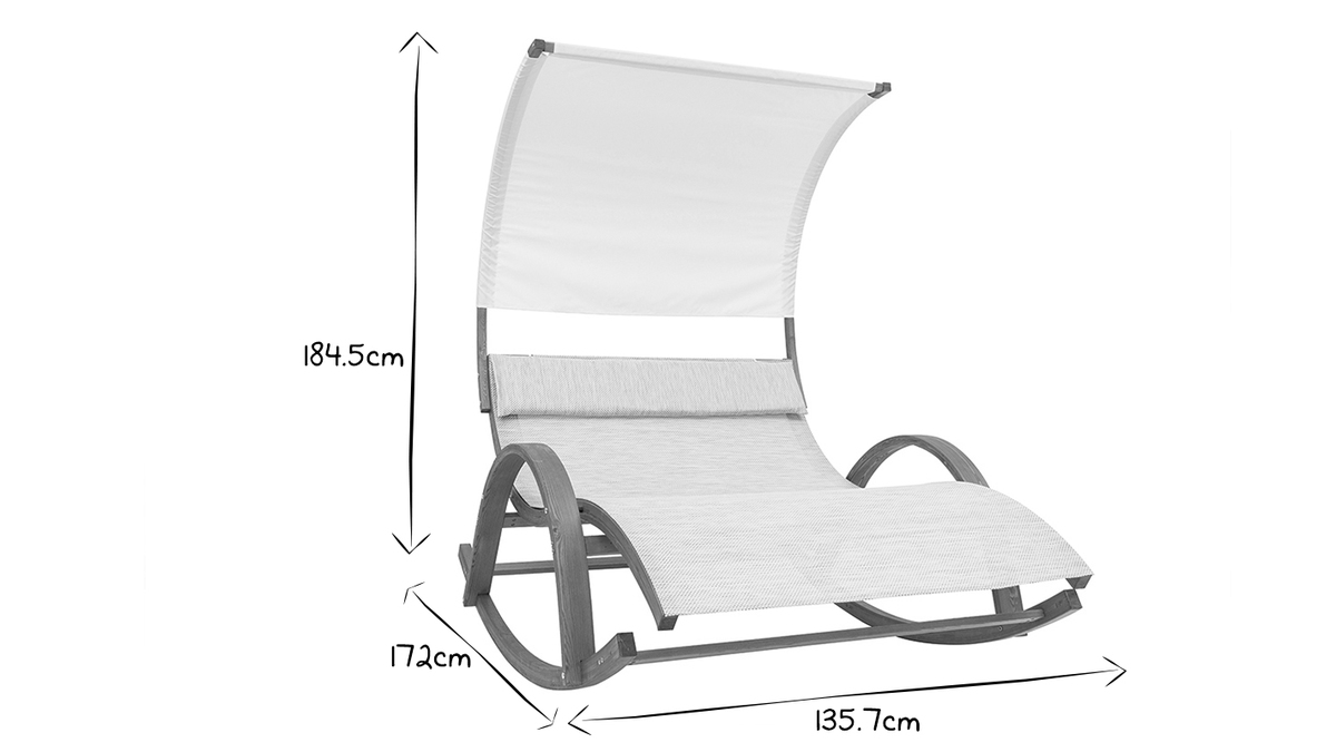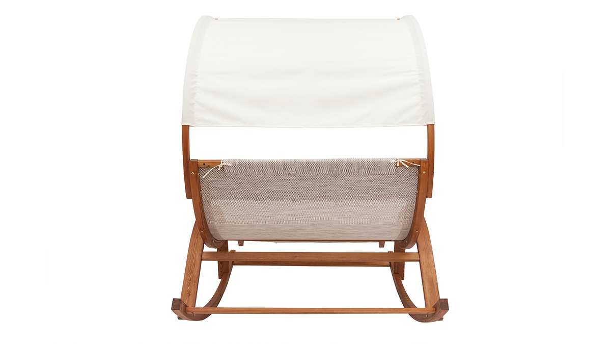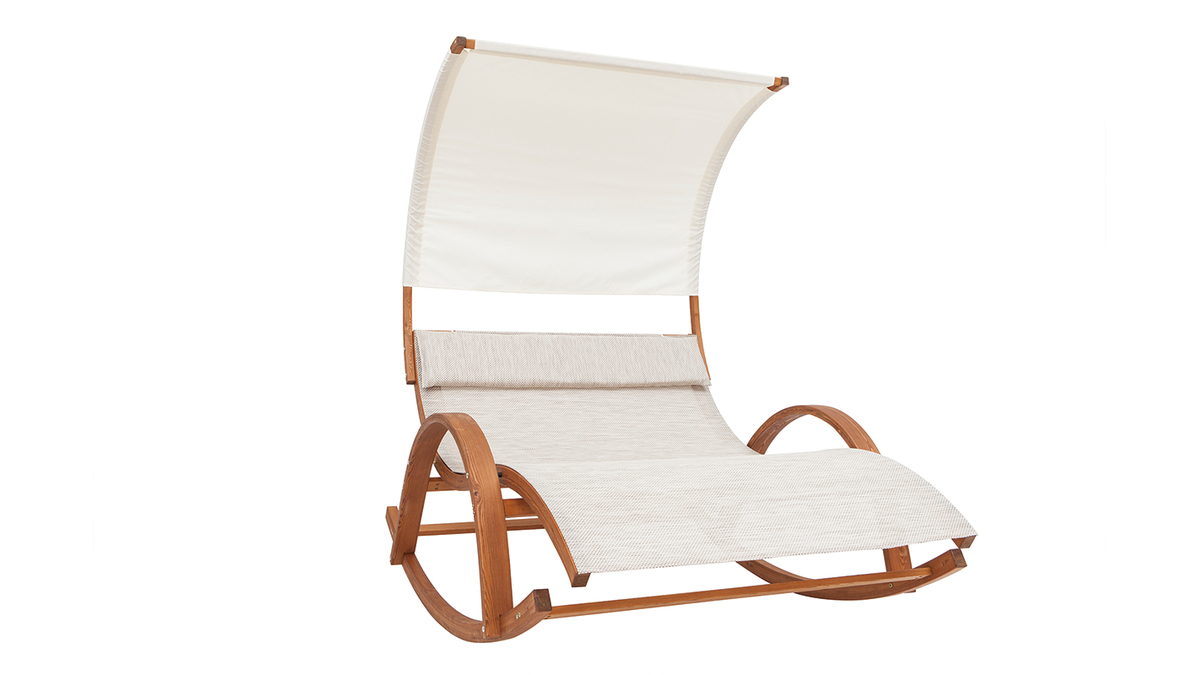 Son assise à la taille généreuse vous accueille à deux confortablement pour un moment farniente en extérieur. Cette chaise longue double reprend le piètement caractéristique du rocking chair, parfait pour se prélasser sans modération dans son jardin. Pour un maximum de confort, ce rocking-chair blanc et bois 2 places d'extérieur dispose d'un abri, idéal pour s'accorder une pause relaxante à l'ombre.