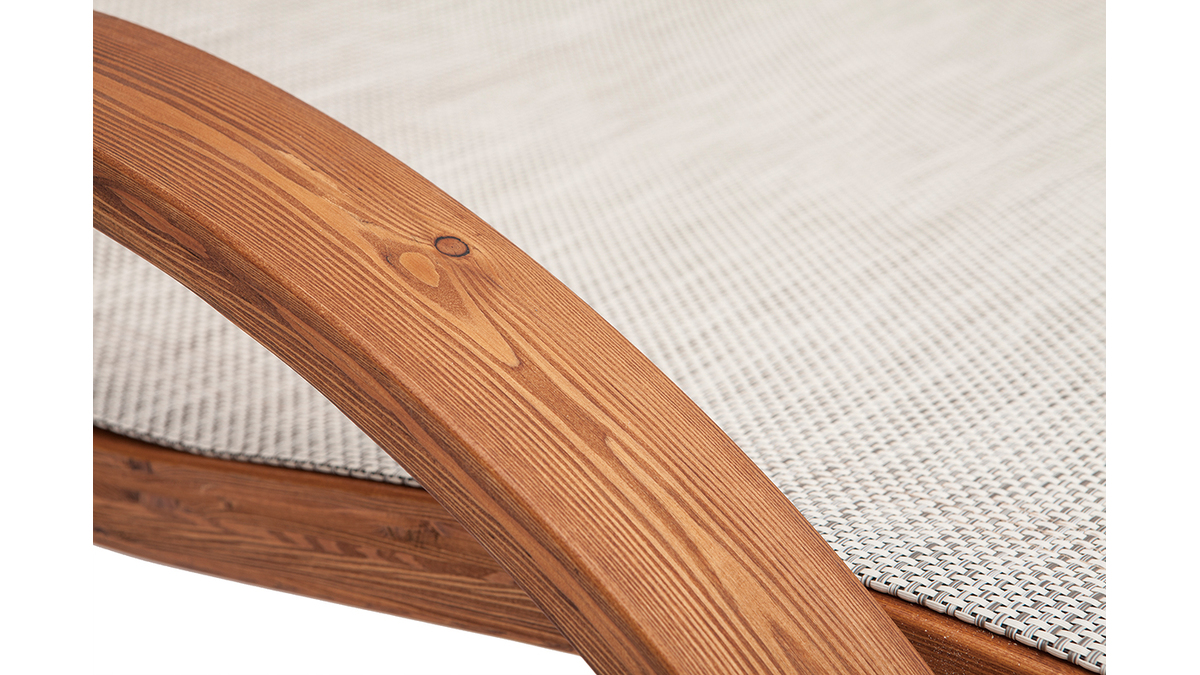 Le mélèze de la structure est enduit d'huile de tung qui permet au bois d'être résistant à l'eau. L'assise est constituée de toile textilène, un matériau résistant aux UV et parfaitement adapté à un usage extérieur.