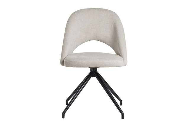 Touche originale et exclusive, le piètement central 4 branches en métal noir fait tourner les têtes et twiste avec style le siège en tissu effet texturé beige (95% polyester et 5% nylon). Un grain de folie appréciable pour les intérieurs trop sages qui mettent un bémol sur la couleur, mais pas sur le style ! Avec son dossier ajouré aux lignes enveloppantes et sa large assise - tous deux garnis d'une mousse densité 25 kg/m³ - cette jolie chaise rotative beige et métal noir (dimensions L50.5 x P53.5 x H82 cm) invitera naturellement ses hôtes à adopter la bonne posture et à lâcher-prise !