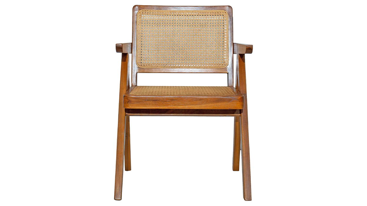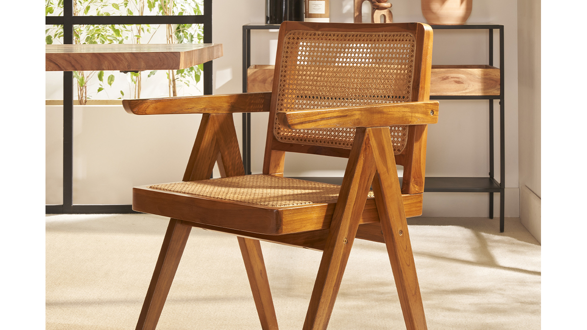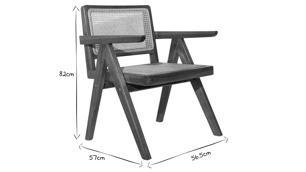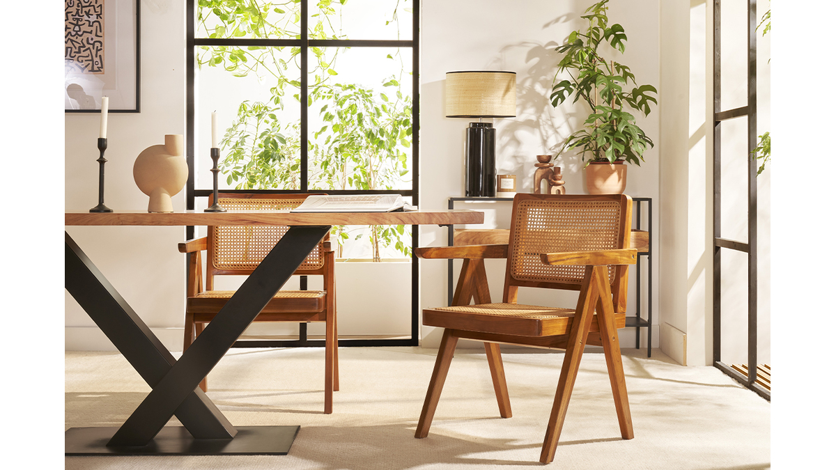 On aime les lignes géométriques claires et rigoureuses de cette chaise avec accoudoirs ainsi que la légèreté visuelle apportée par la trame de rotin tissé. Elle offre un bon confort d'assise grâce à la souplesse du cannage.