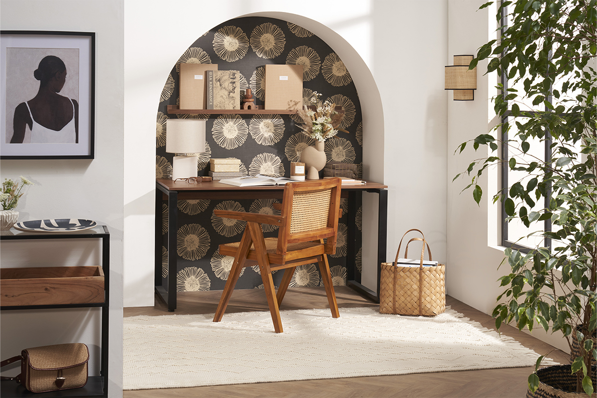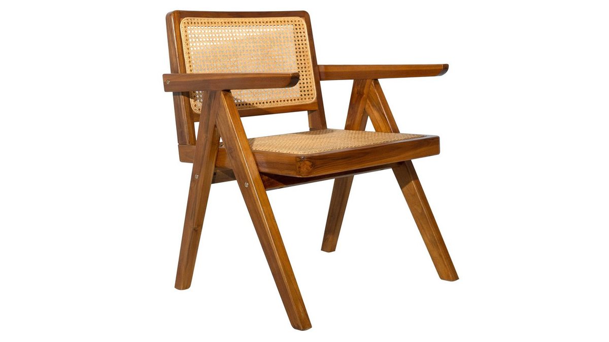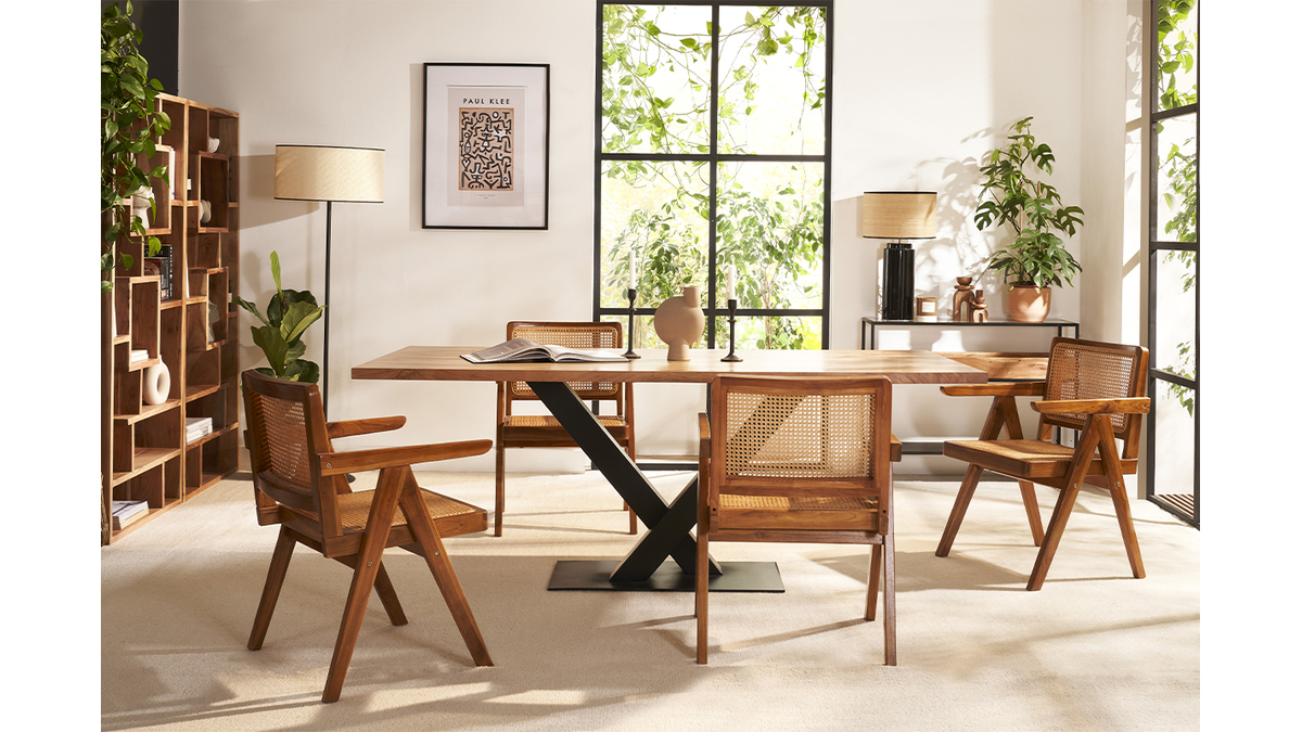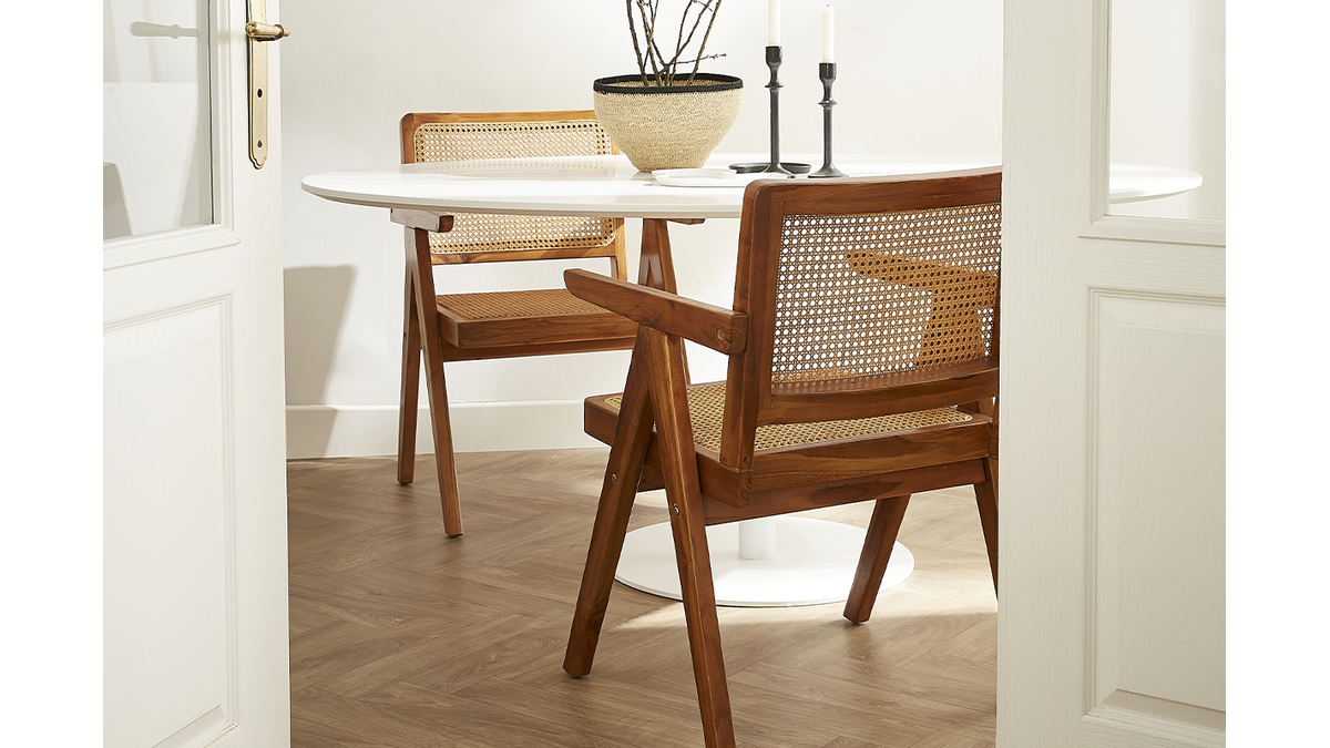 On aime les lignes géométriques claires et rigoureuses de cette chaise avec accoudoirs ainsi que la légèreté visuelle apportée par la trame de rotin tissé. Elle offre un bon confort d'assise grâce à la souplesse du cannage.