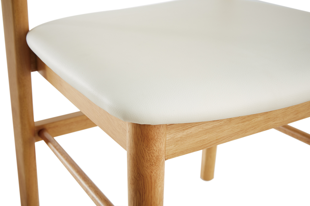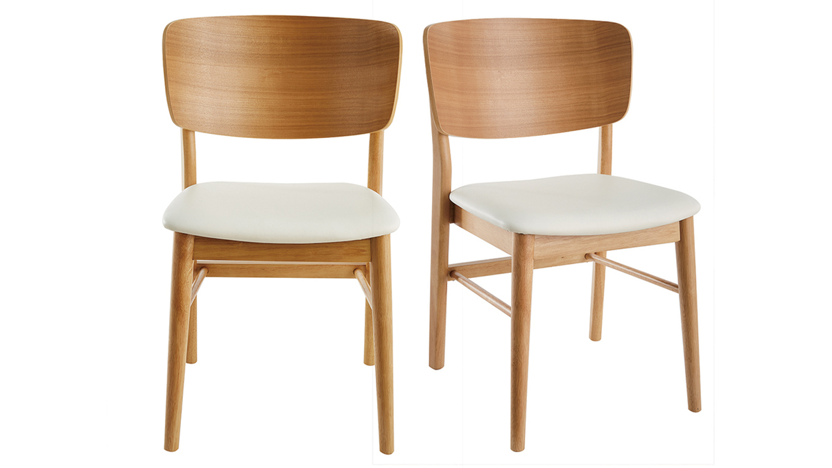 Faciles à vivre, ces chaises qui associent une structure en panneaux de fibres de bois placage frêne à un piètement en hévéa massif se distinguent par leur grande légèreté. On aime particulièrement les tons sobres de l'assise qui renvoient à un univers chic tout en étant chaleureux . L'assise est habillée d'un revêtement en polyuréthane blanc souple et doux au toucher qui contraste à merveille avec le bois clair.