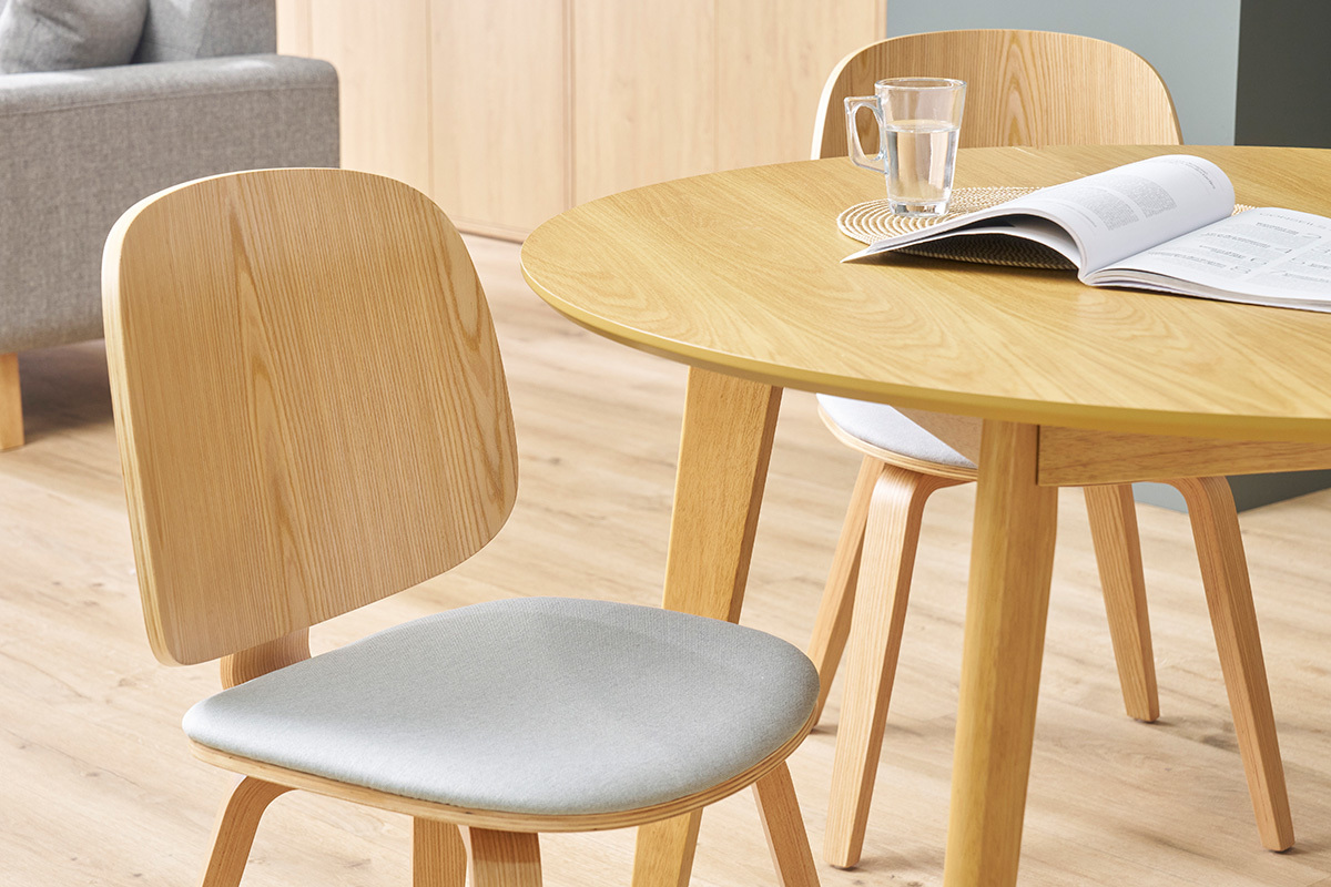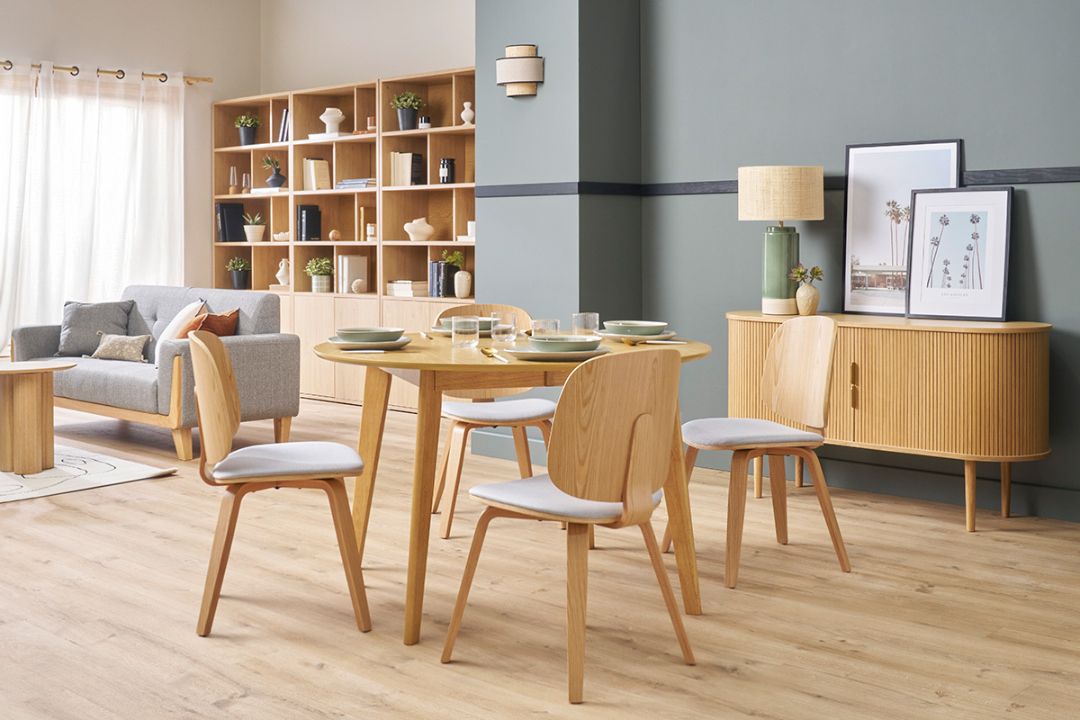 Si ce mélange de matières et couleurs nous séduit, il en est de même pour les belles formes courbées de ces assises : ces chaises en bois clair sont piles dans la tendance organique !
