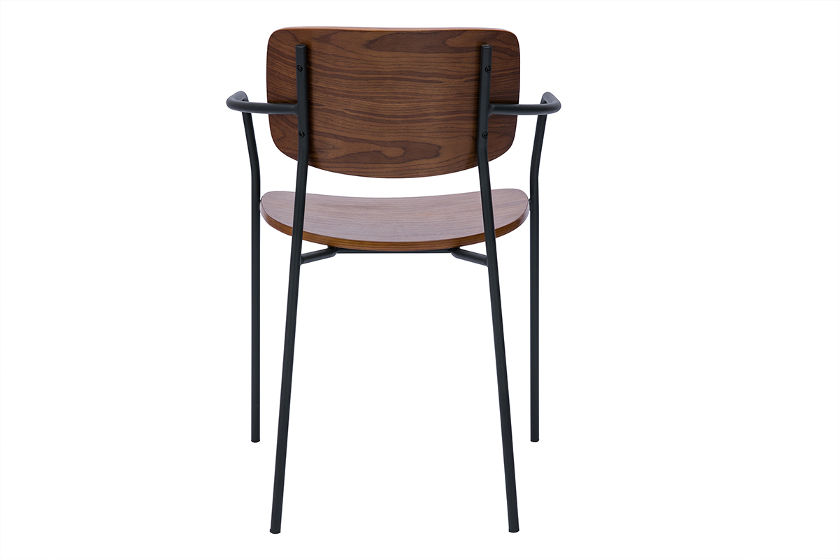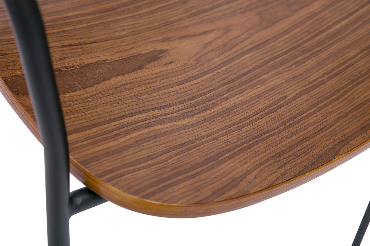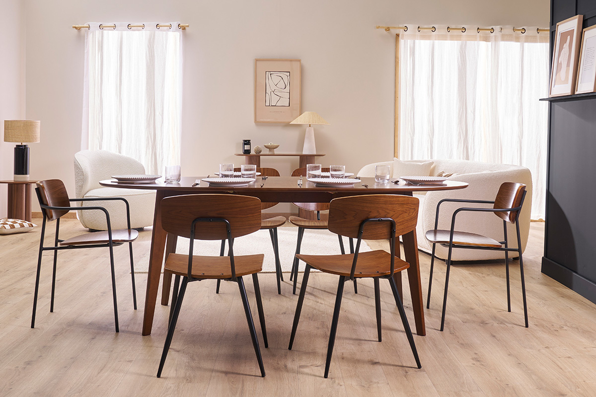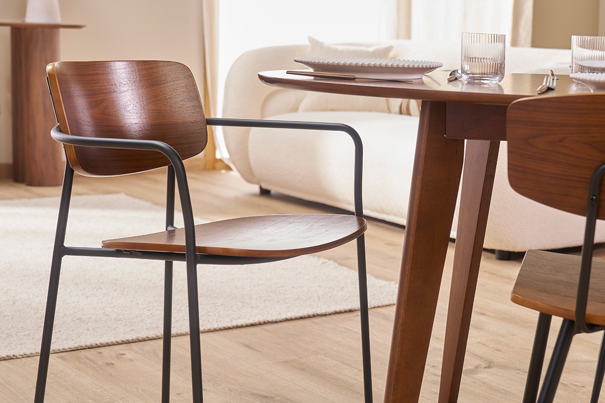 Dotées d’une structure légère et élégante, les chaises SUSAN se distinguent par leurs lignes sobres et raffinées. Leur dossier et leur assise sont conçus en bois foncé, offrant un contraste harmonieux avec le piètement en métal noir mat. Ce mariage de matériaux souligne l’équilibre entre naturel et modernité, faisant de ces chaises un véritable atout déco. Le bois foncé met également en valeur le veinage, apportant chaleur et authenticité à votre intérieur, tandis que le métal noir renforce leur côté industriel et contemporain.