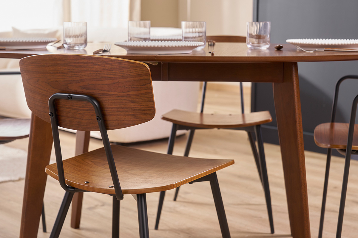 Les pieds en métal noir sont non seulement esthétiques, mais également très résistants. Ils assurent une excellente stabilité et confèrent à ces chaises une durabilité à toute épreuve. Par ailleurs, la finition soignée du bois de noyer garantit une longévité optimale, tout en facilitant leur intégration dans votre espace de vie. Ces chaises ont été conçues pour résister aux usages quotidiens tout en conservant leur aspect neuf au fil du temps.