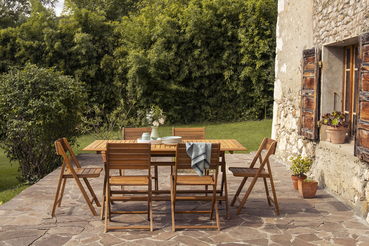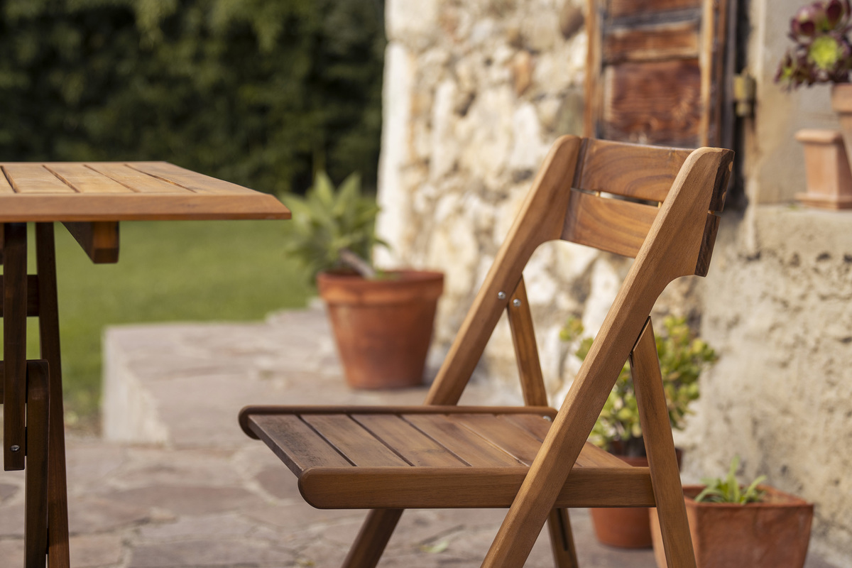 Gain de place assuré avec les chaises de jardin pliantes DIEGO fabriquées en bois d'acacia.