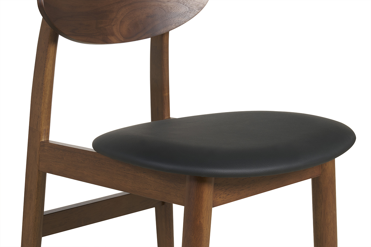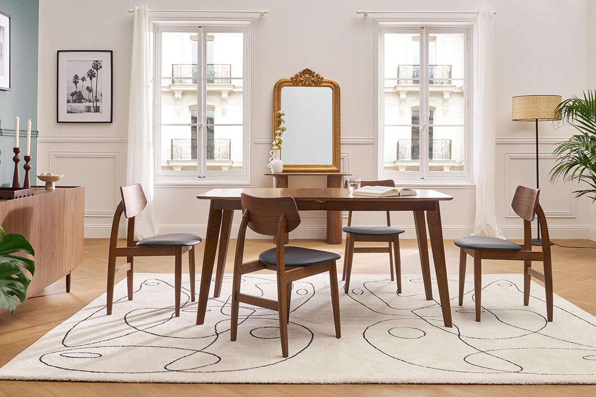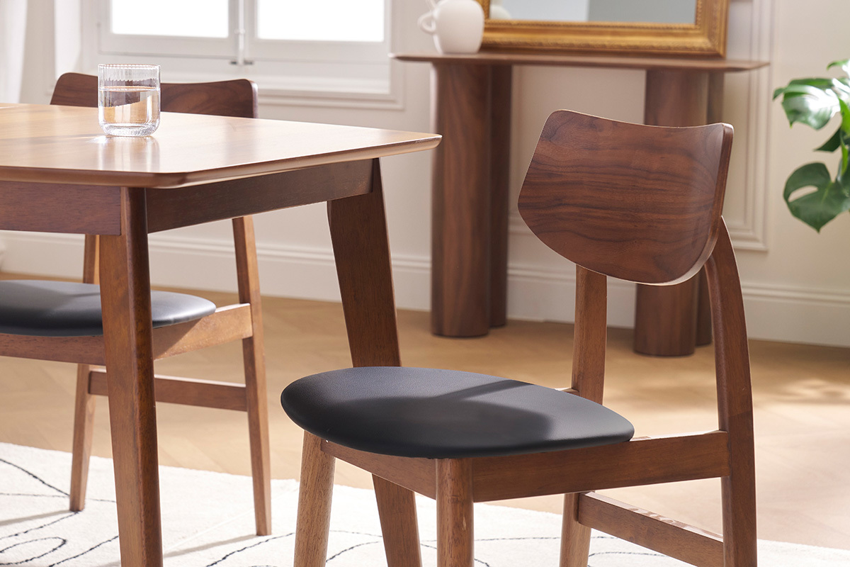Ces chaises de salle à manger maîtrisent parfaitement l'art d'associer les matières ! Avec allure, les ELION conjuguent une structure naturelle en bois teinté noyer à une assise noire très moderne.