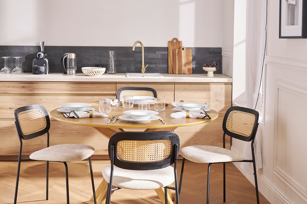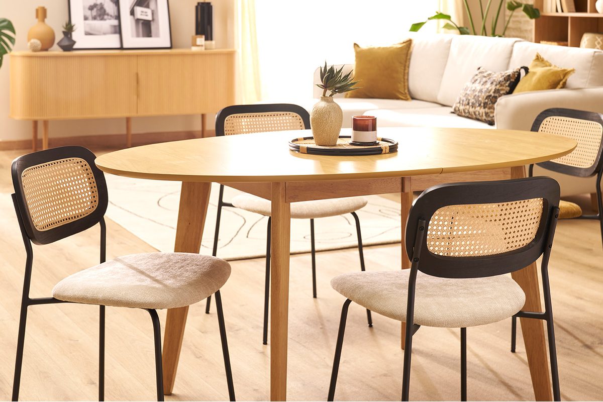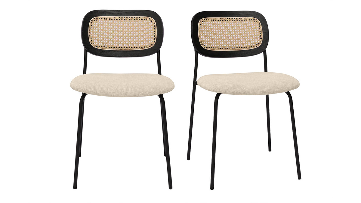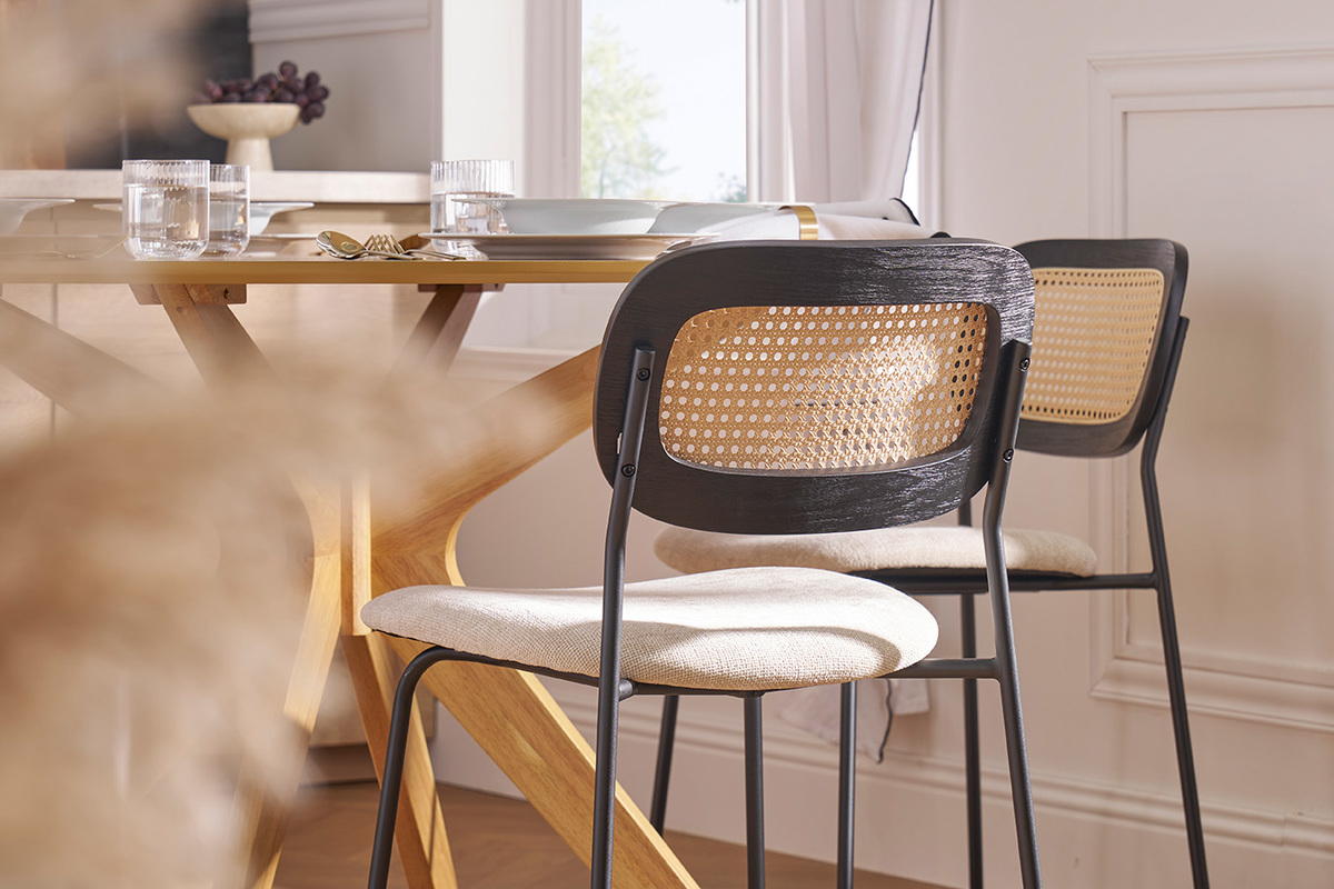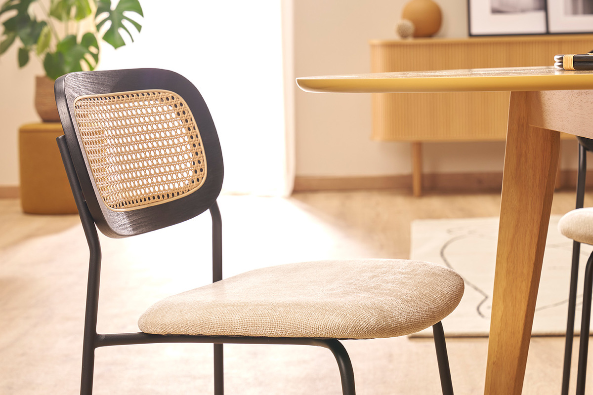 Les chaises MIRANDA, avec leur design soigné et leurs assises en tissu effet velours texturé beige, incarnent l'élégance et le confort pour sublimer n'importe quel espace de vie. Idéales pour la salle à manger, elles allient style contemporain et inspirations naturelles, créant une ambiance chaleureuse et accueillante. Le dossier en cannage rotin synthétique ajoute une touche artisanale et authentique, rappelant les tendances modernes tout en apportant une note rétro chic. Cette combinaison unique de matières en fait un choix idéal pour les intérieurs à la recherche d'originalité et de caractère.