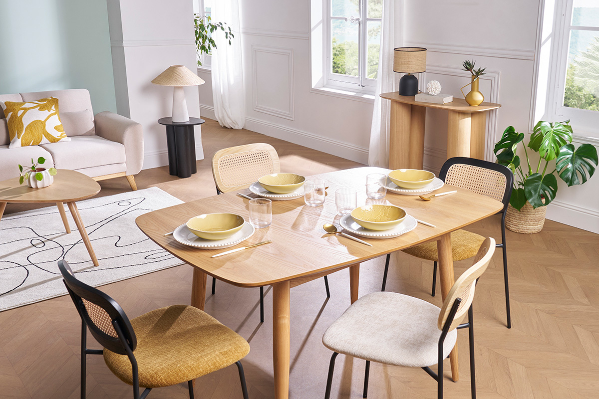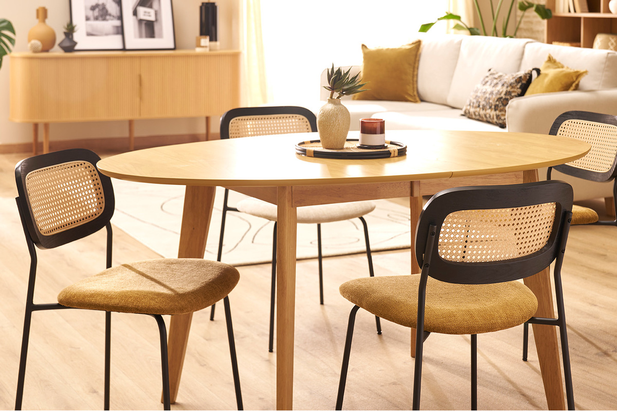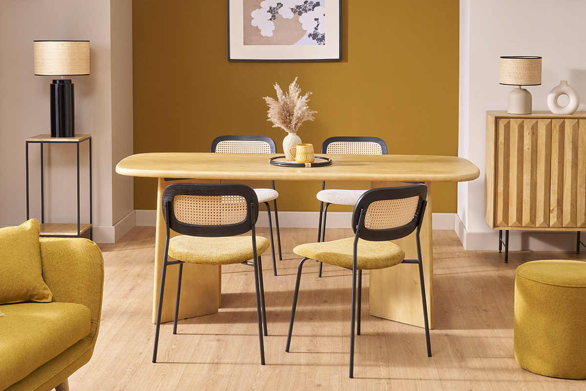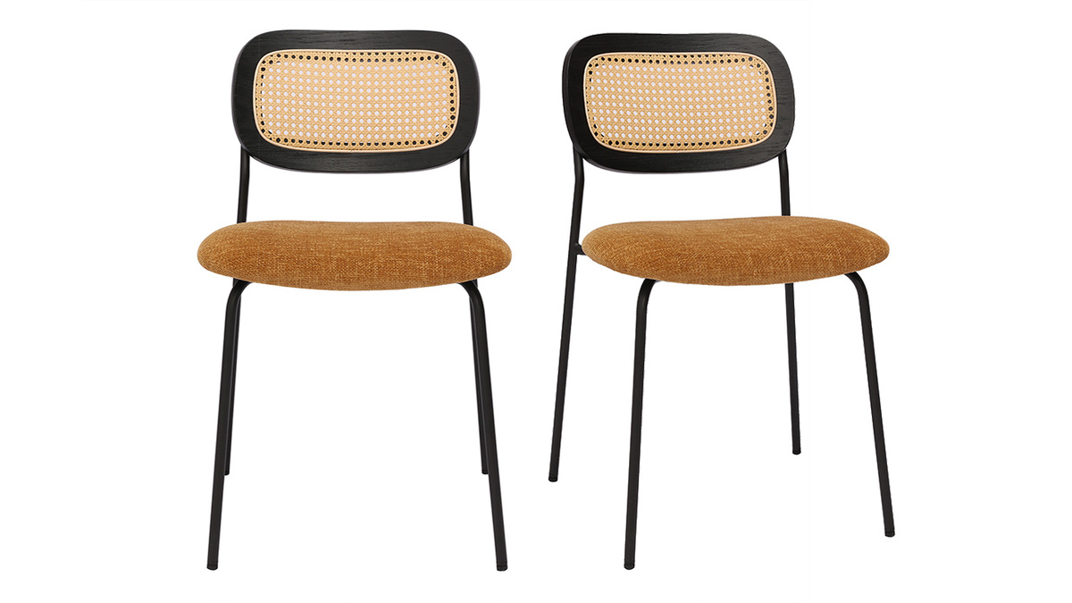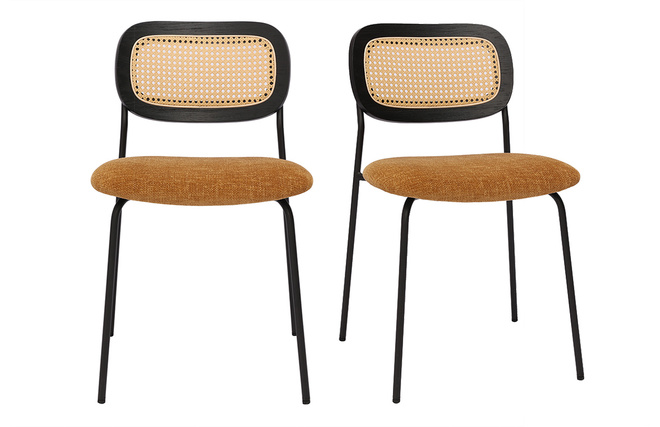 Les chaises MIRANDA, avec leur design soigné et leurs assises en tissu effet velours texturé bronze, incarnent l'élégance et le confort pour sublimer n'importe quel espace de vie. Idéales pour la salle à manger, elles allient style contemporain et inspirations naturelles, créant une ambiance chaleureuse et accueillante. Le dossier en cannage rotin synthétique ajoute une touche artisanale et authentique, rappelant les tendances modernes tout en apportant une note rétro chic. Cette combinaison unique de matières en fait un choix idéal pour les intérieurs à la recherche d'originalité et de caractère.