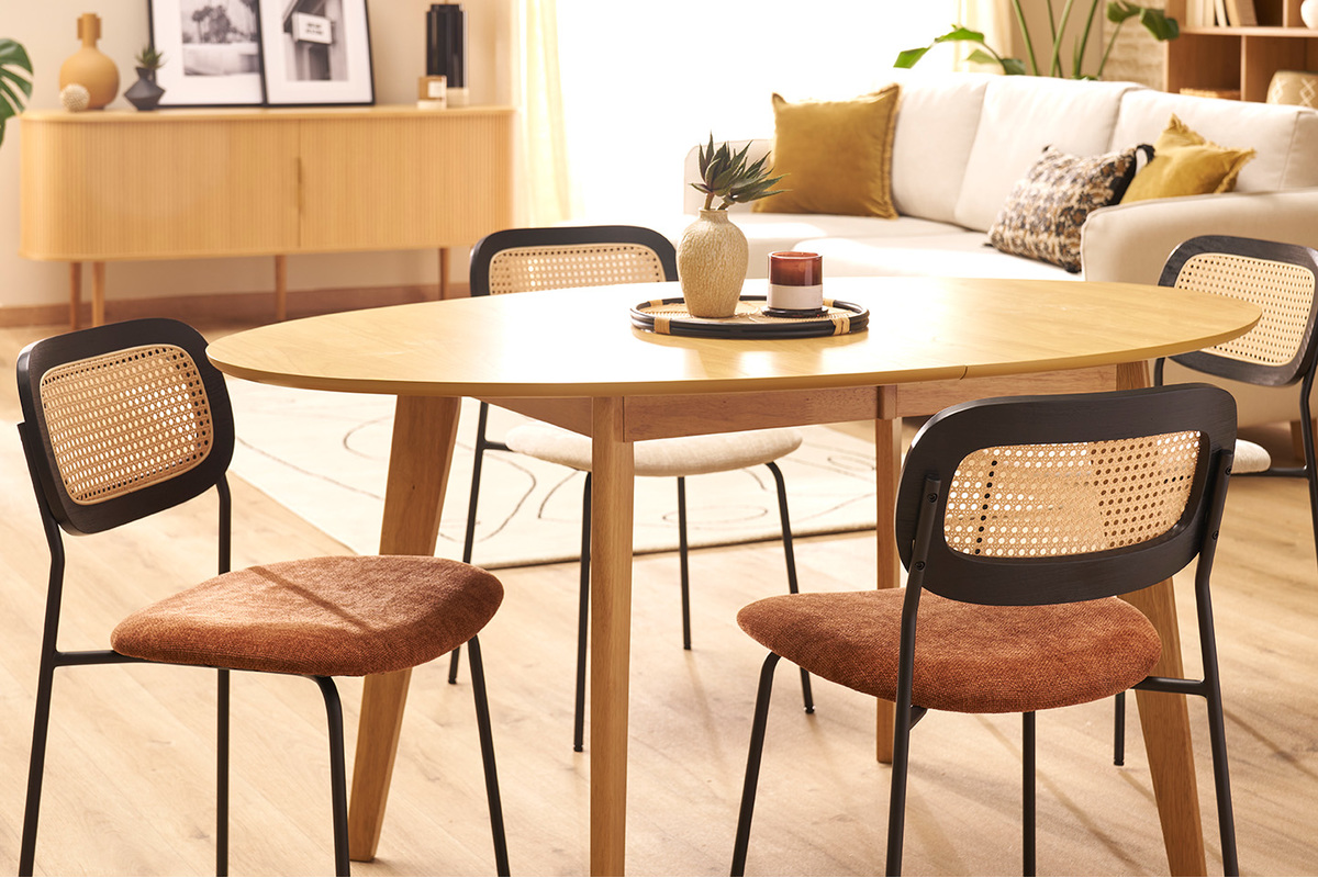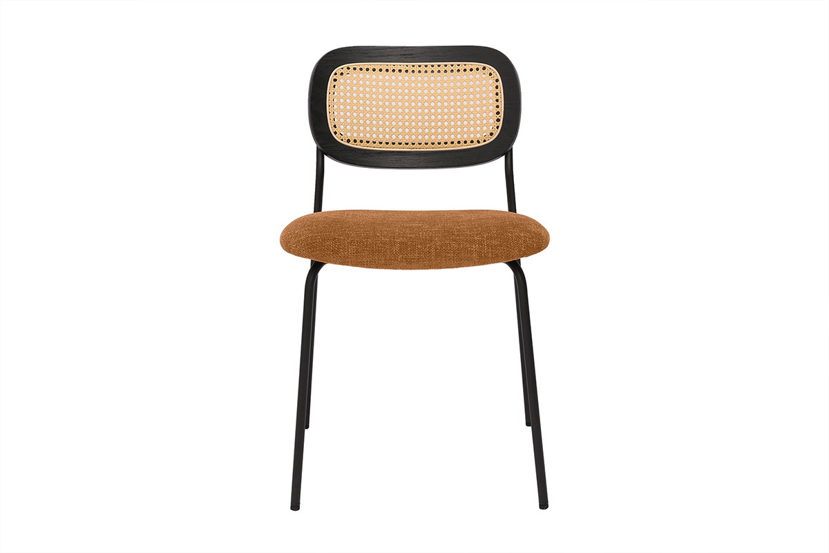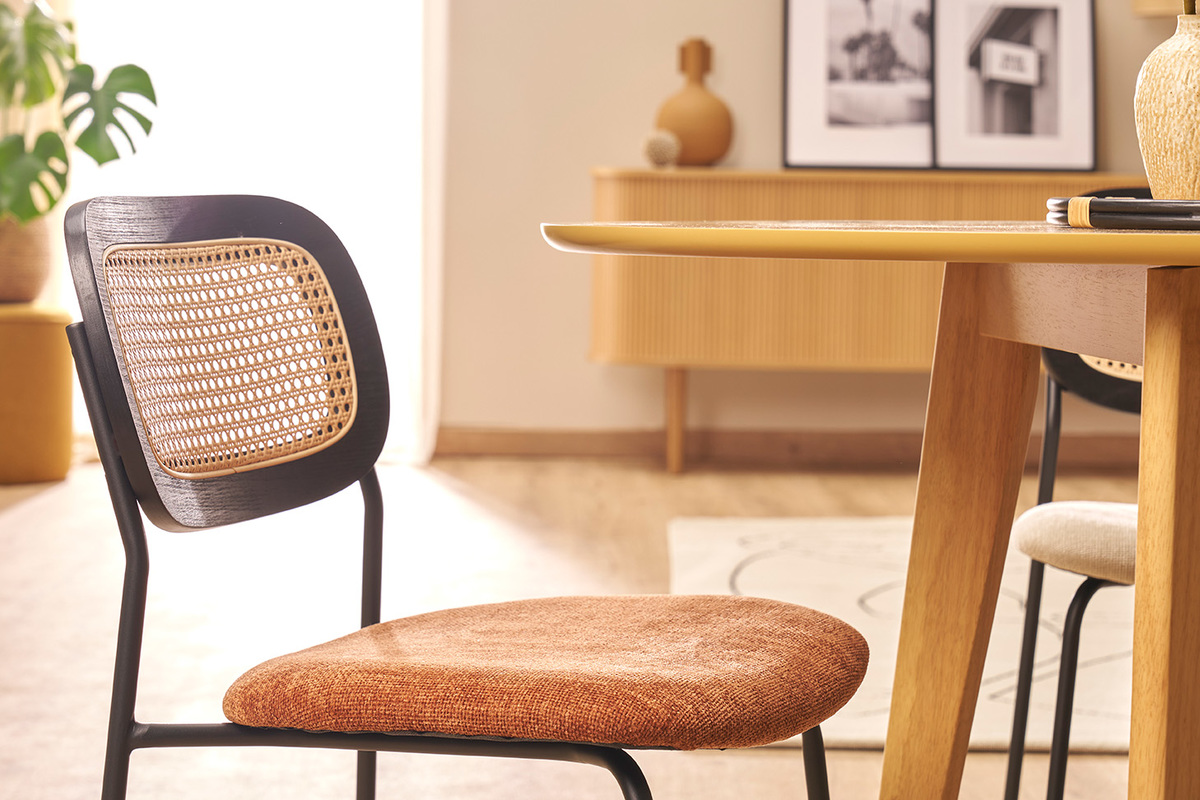 Les chaises MIRANDA, avec leur design soigné et leurs assises en tissu effet velours texturé terre brulée, incarnent l'élégance et le confort pour sublimer n'importe quel espace de vie. Idéales pour la salle à manger, elles allient style contemporain et inspirations naturelles, créant une ambiance chaleureuse et accueillante. Le dossier en cannage rotin synthétique ajoute une touche artisanale et authentique, rappelant les tendances modernes tout en apportant une note rétro chic. Cette combinaison unique de matières en fait un choix idéal pour les intérieurs à la recherche d'originalité et de caractère.