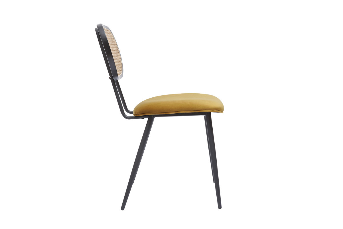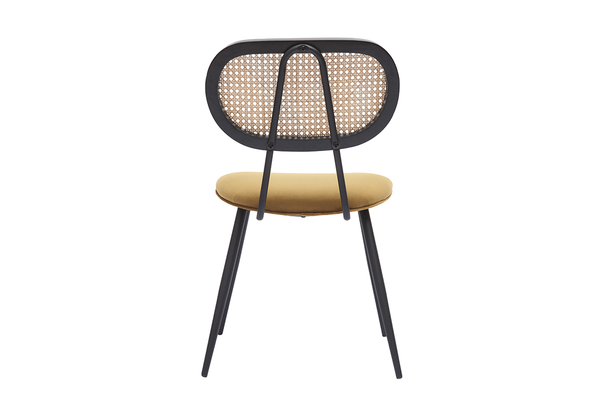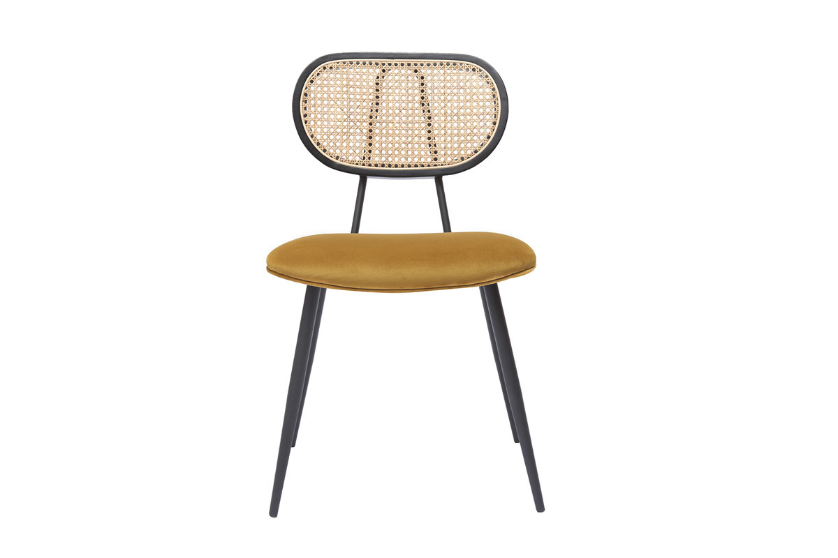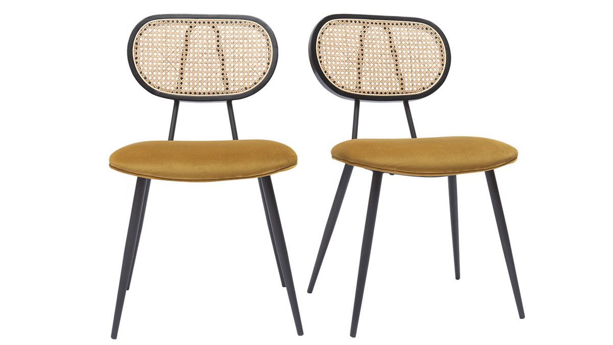 Pour profiter de se retrouver en famille ou entre amis et passer d'agréables moments bien attablés, multipliez ces chaises en cannage, tissu velours bronze et métal noir autour d'une table à manger en bois : rendu final du plus bel effet dans votre coin repas !