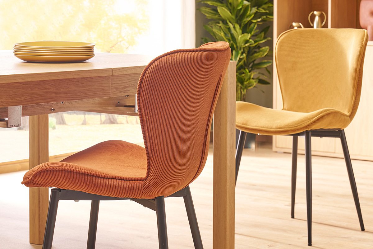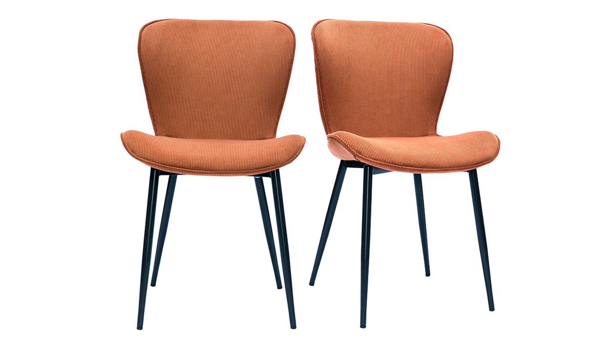 Chaises design en tissu velours côtelé terre brûlée et métal noir ADDICT vendues par lot de 2. Livrées prêtes à assembler. Montage simple, seuls les pieds sont à fixer.