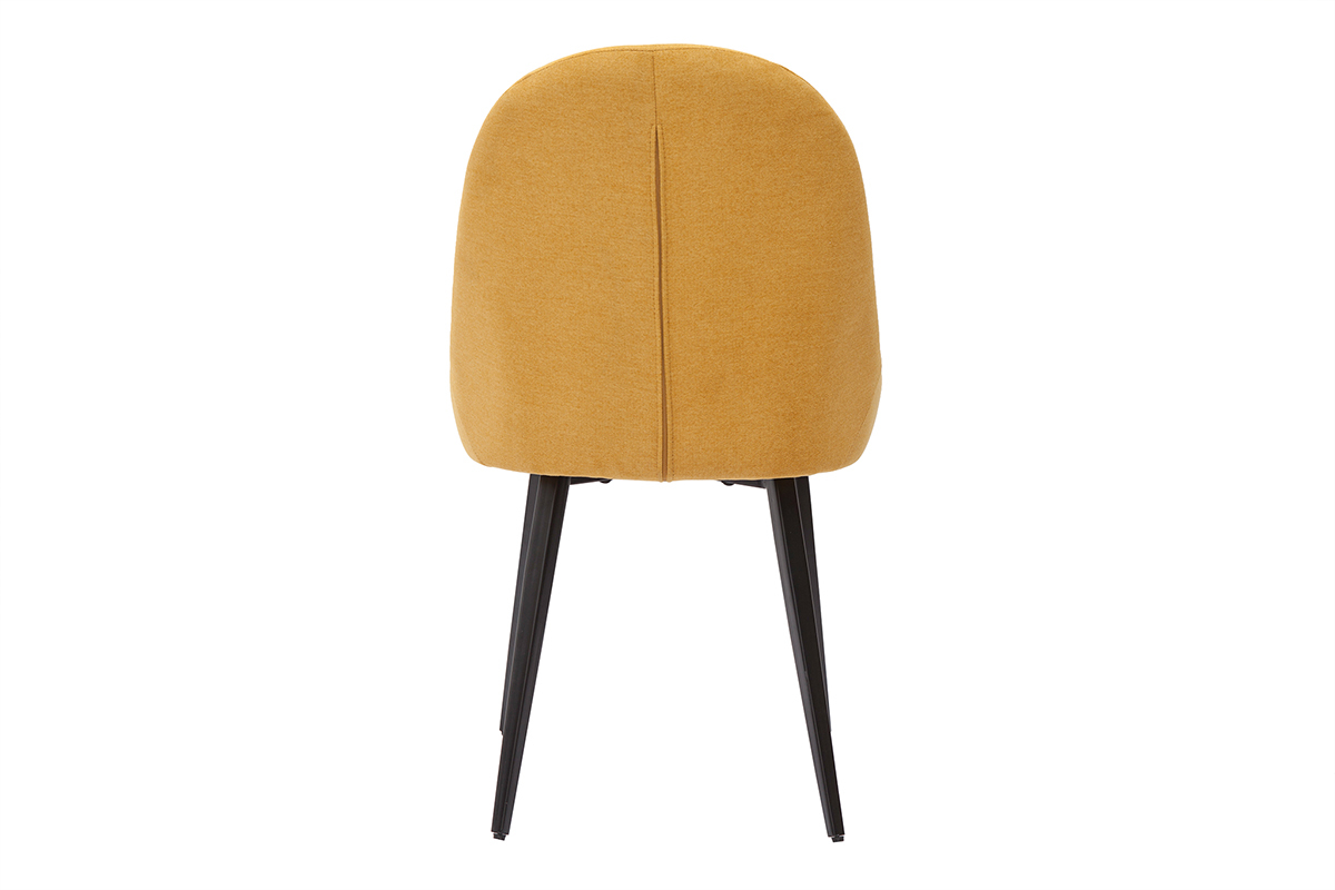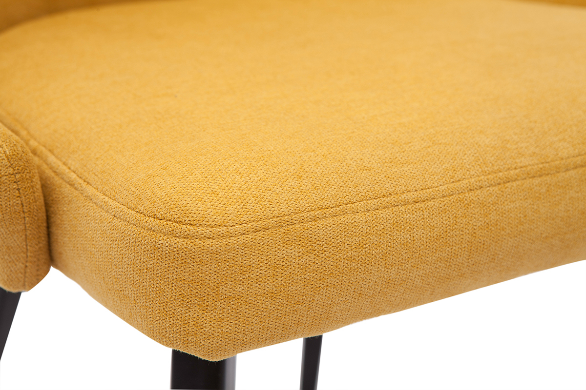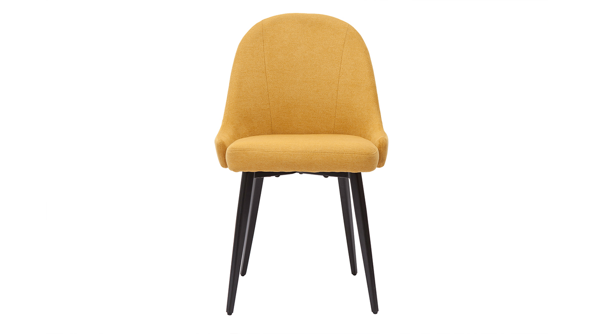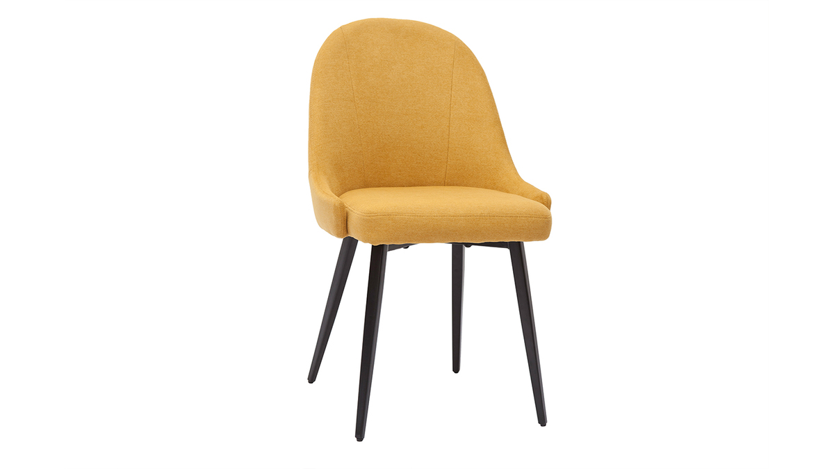 Un revêtement en tissu effet velours à la lumineuse couleur jaune moutarde et au toucher velouté épouse parfaitement les courbes du dossier et de l'assise. Ce siège - délicatement habillé par de fines coutures - repose sur des pieds fuselés en métal noir, créant ainsi une silhouette légère, glamour et résolument tendance.