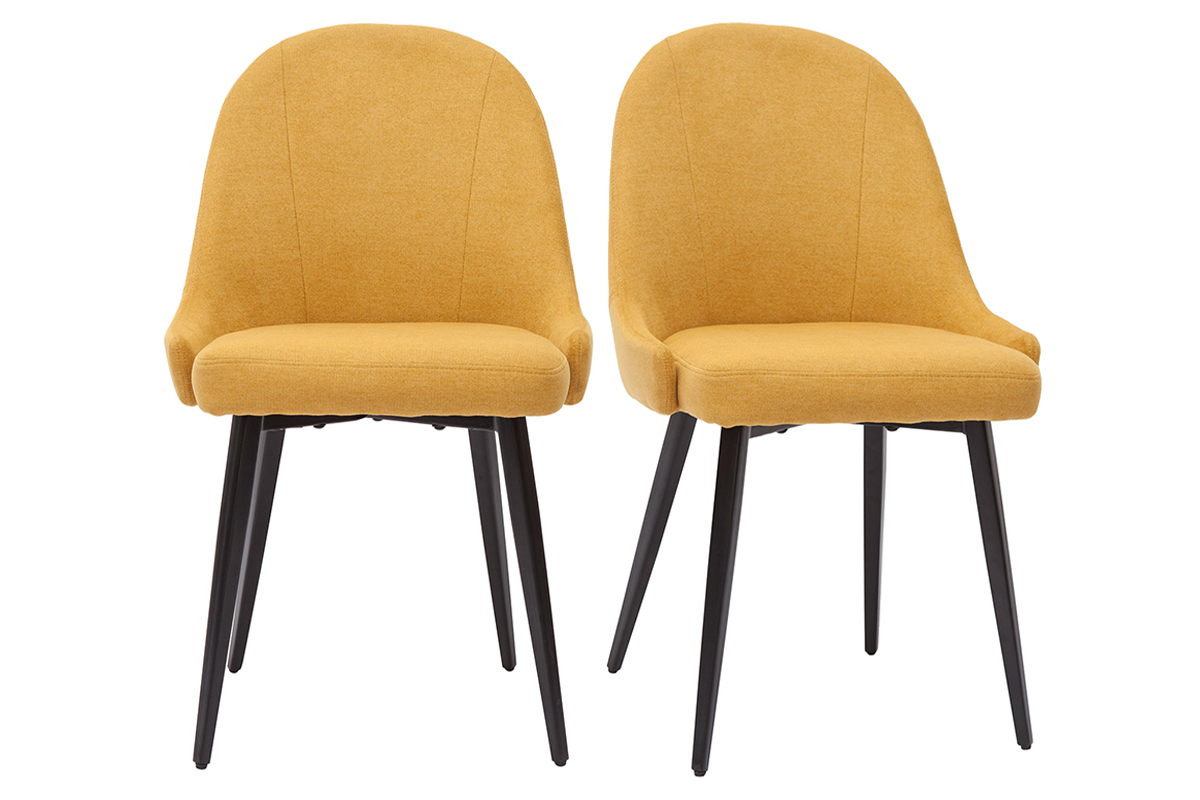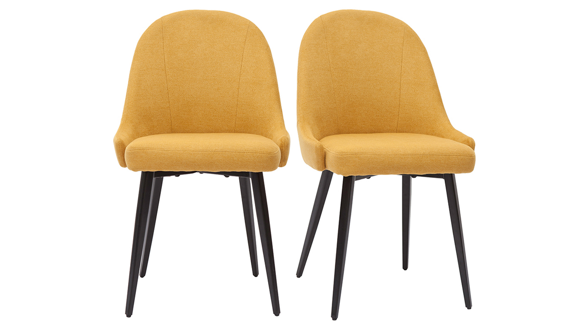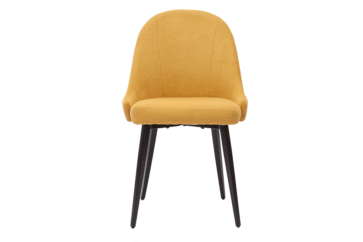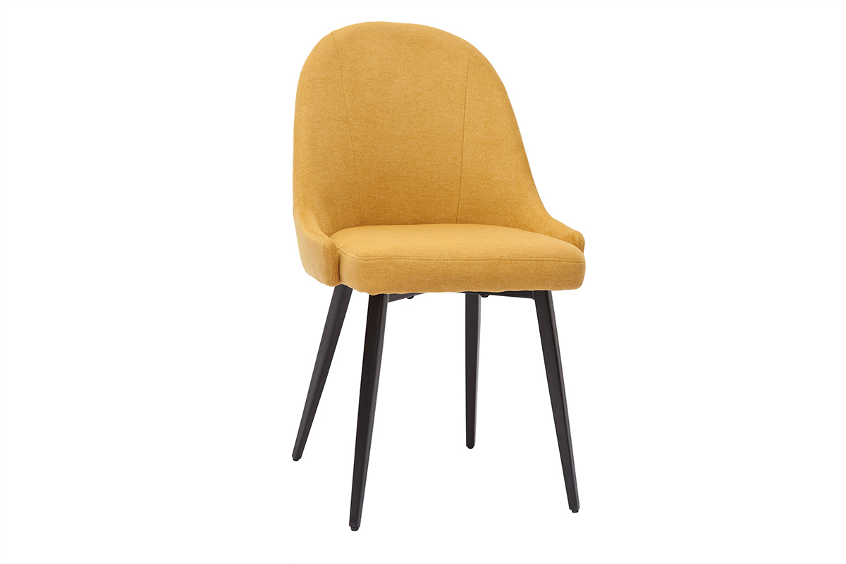 Un revêtement en tissu effet velours à la lumineuse couleur jaune moutarde et au toucher velouté épouse parfaitement les courbes du dossier et de l'assise. Ce siège - délicatement habillé par de fines coutures - repose sur des pieds fuselés en métal noir, créant ainsi une silhouette légère, glamour et résolument tendance.
