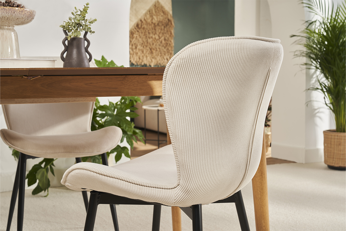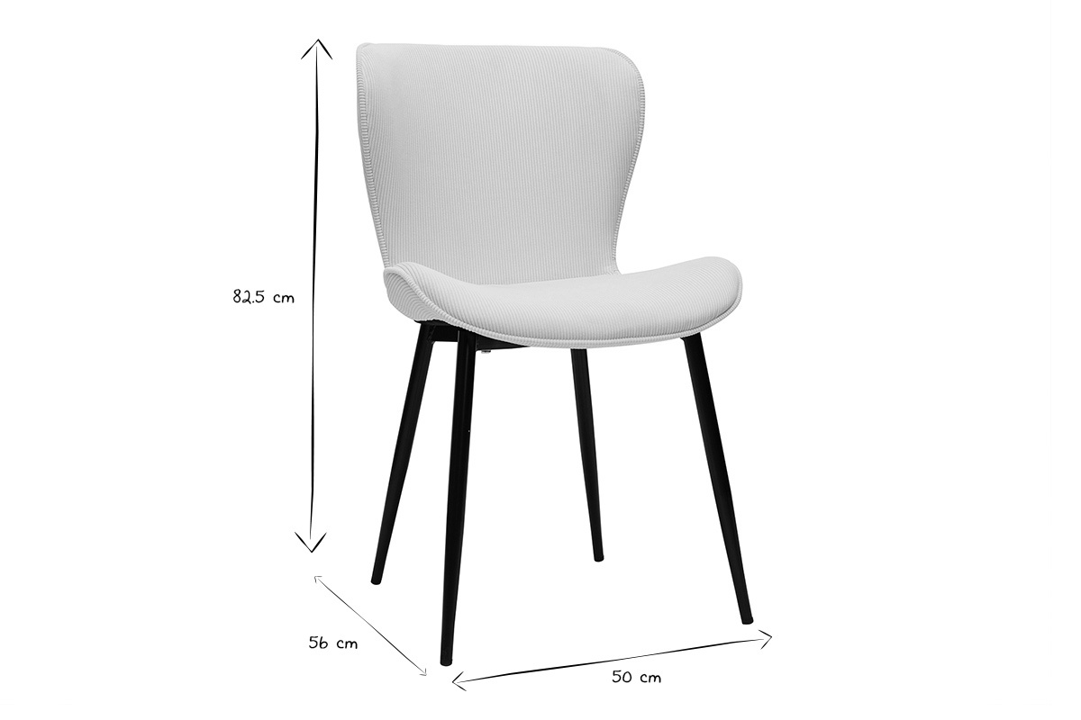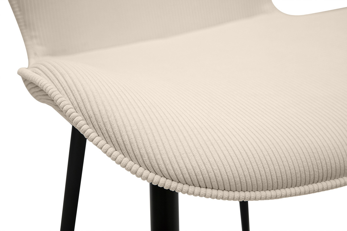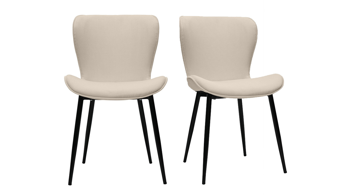 Chaises design en tissu velours côtelé beige et métal noir ADDICT vendues par lot de 2. Livrées prêtes à assembler. Montage simple, seuls les pieds sont à fixer.