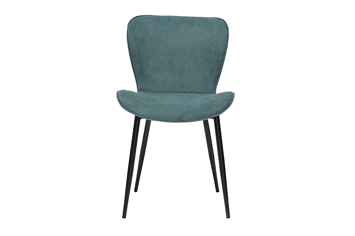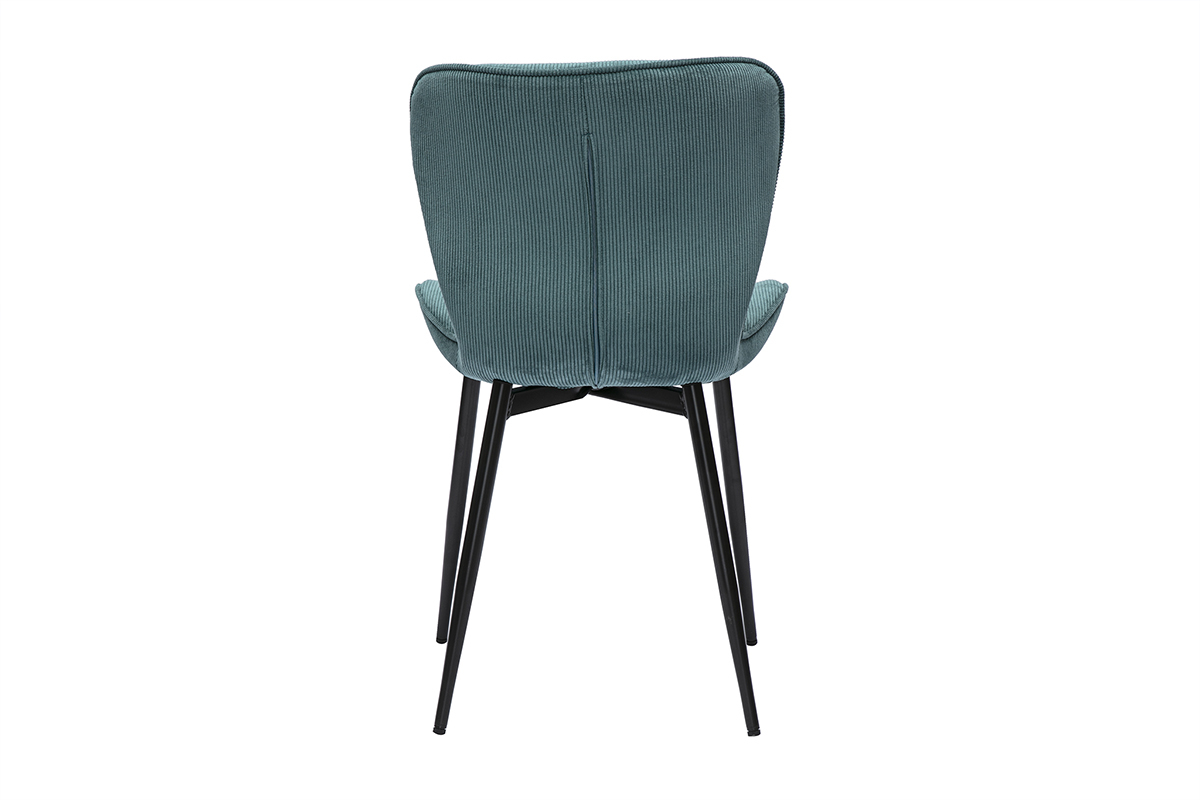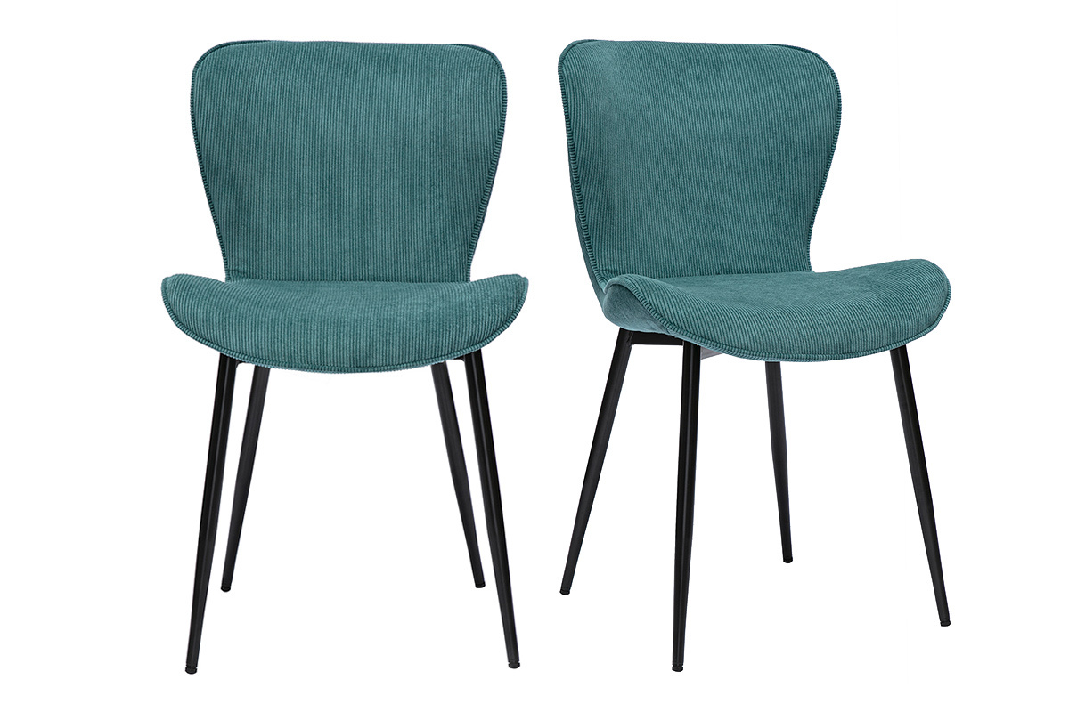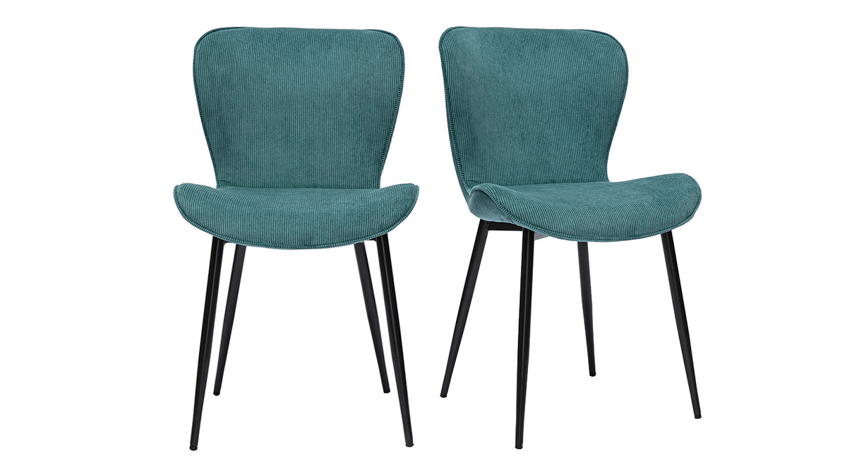 Chaises design en tissu velours côtelé bleu canard et métal noir ADDICT vendues par lot de 2. Livrées prêtes à assembler. Montage simple, seuls les pieds sont à fixer.