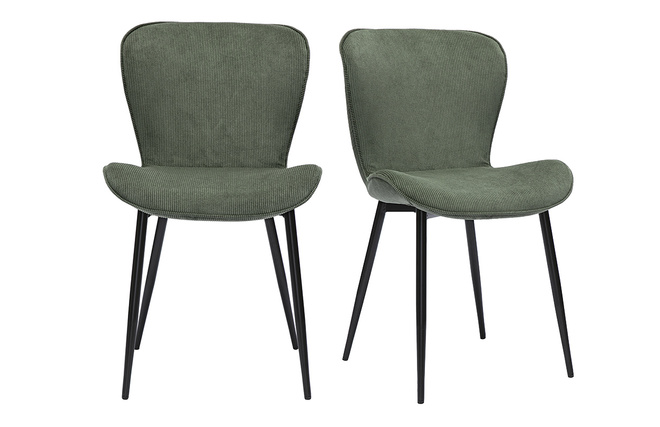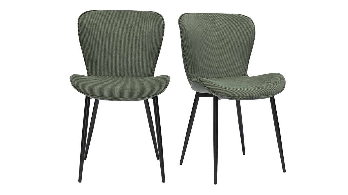 Chaises design en tissu velours côtelé kaki et métal noir ADDICT vendues par lot de 2. Livrées prêtes à assembler. Montage simple, seuls les pieds sont à fixer.