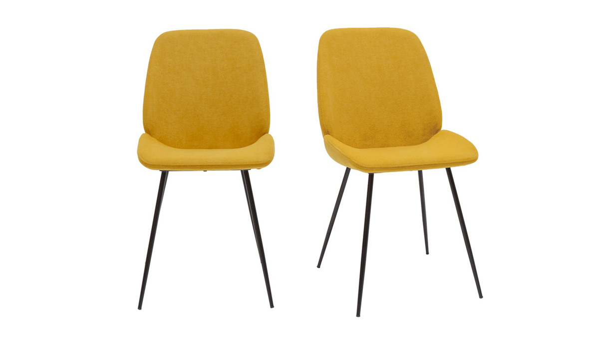 Ces chaises de salle à manger séduisent par leurs lignes épurées et volumes minimalistes, un exercice d'équilibre et de retenu loin de tout superflu. Les assises charment par leurs rondeurs et se parent d'un élégant coloris jaune moutarde. Cette couleur éclatante et tendance dynamisera sans nul doute votre intérieur. Le revêtement en tissu effet velours à l'inspiration vintage contraste avec la modernité de l'élancé piètement noir. Un juste compromis à la fois graphique et sophistiqué qui trouvera autant sa place dans une ambiance rétro que contemporaine.