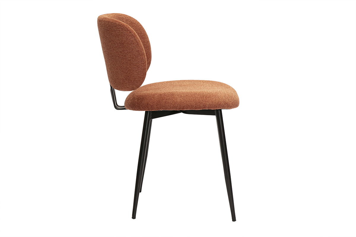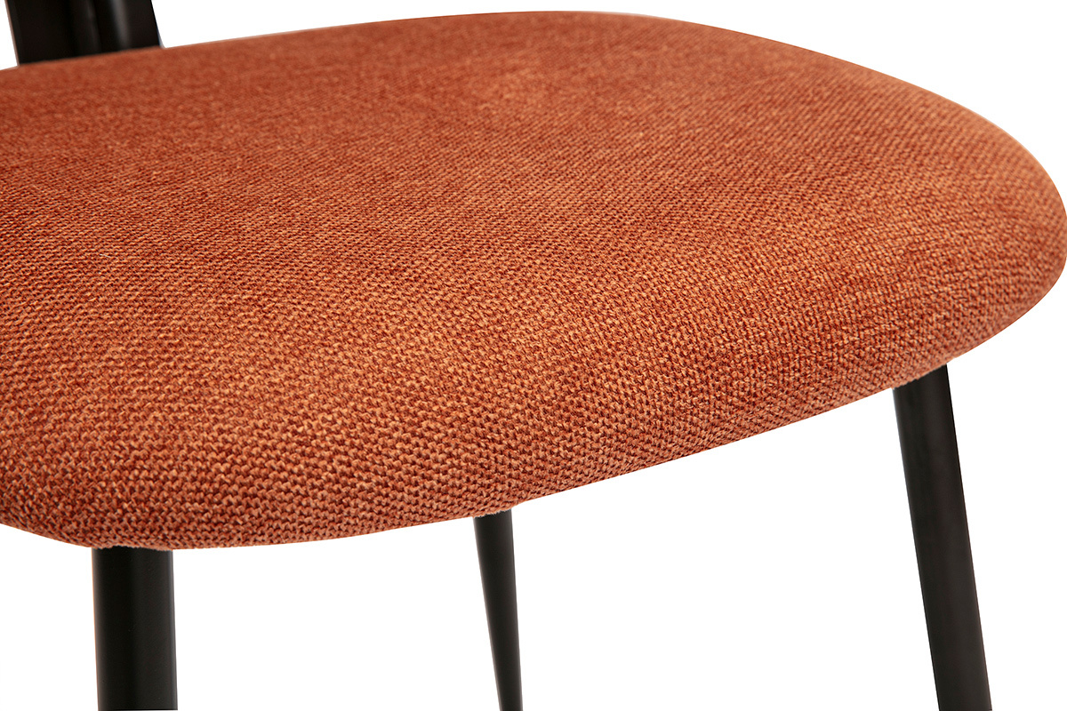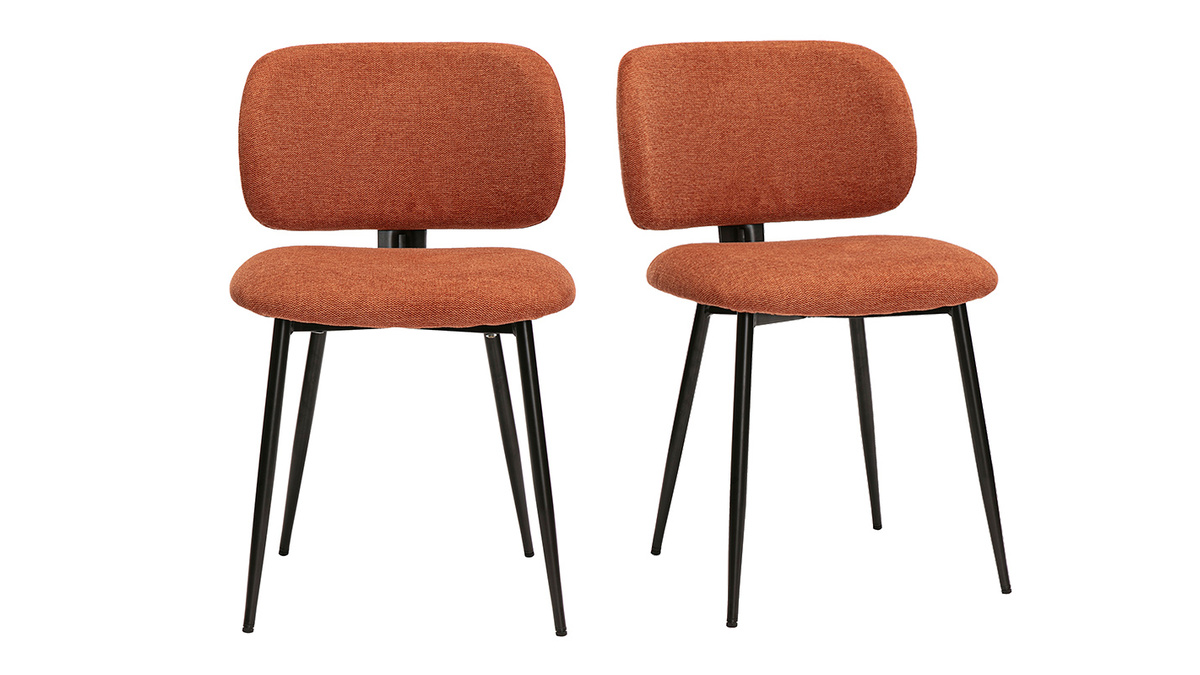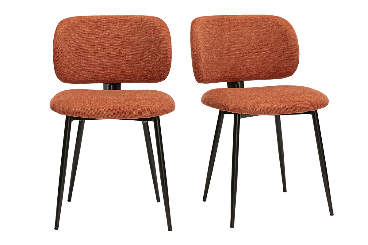 Chaises en tissu effet velours texturé terre brûlée et métal noir vendues par lot de 2 et livrées prêtes à monter. Montage simple, seuls les pieds sont à fixer.