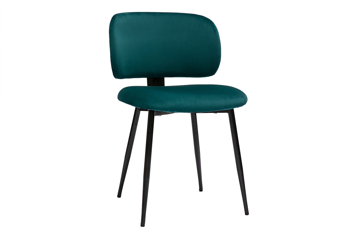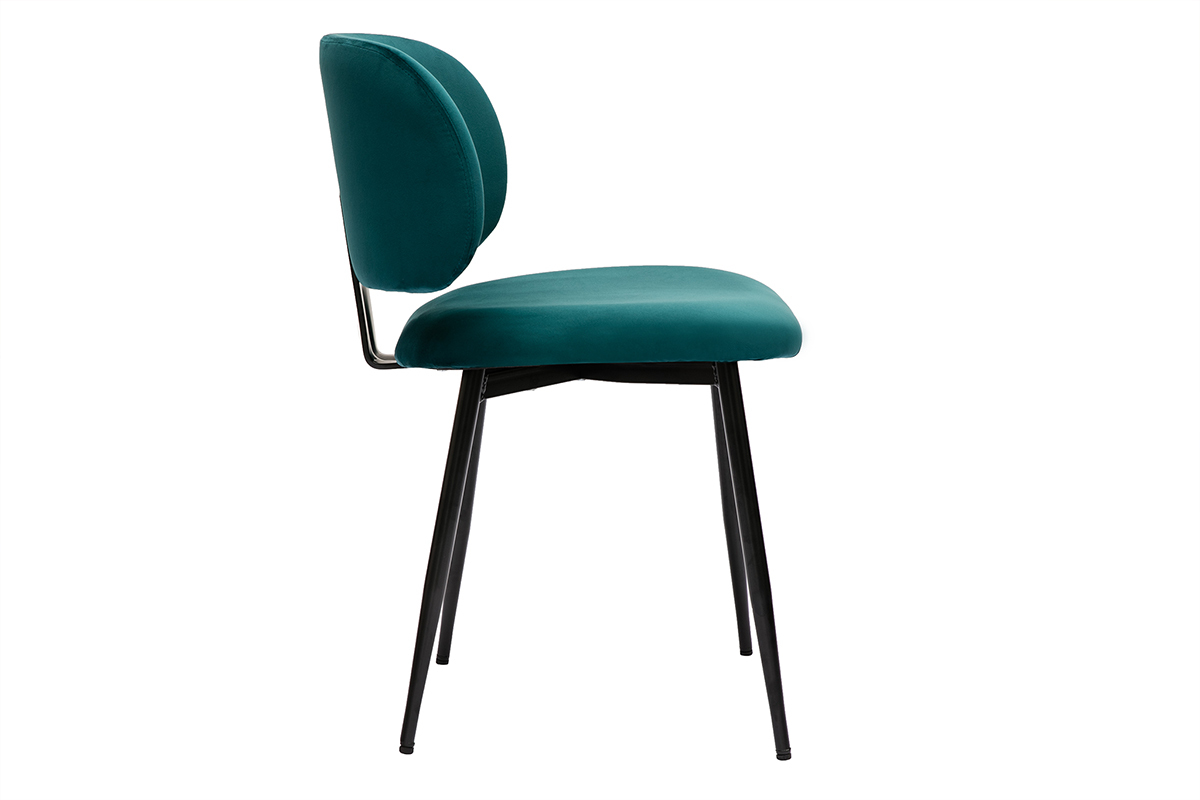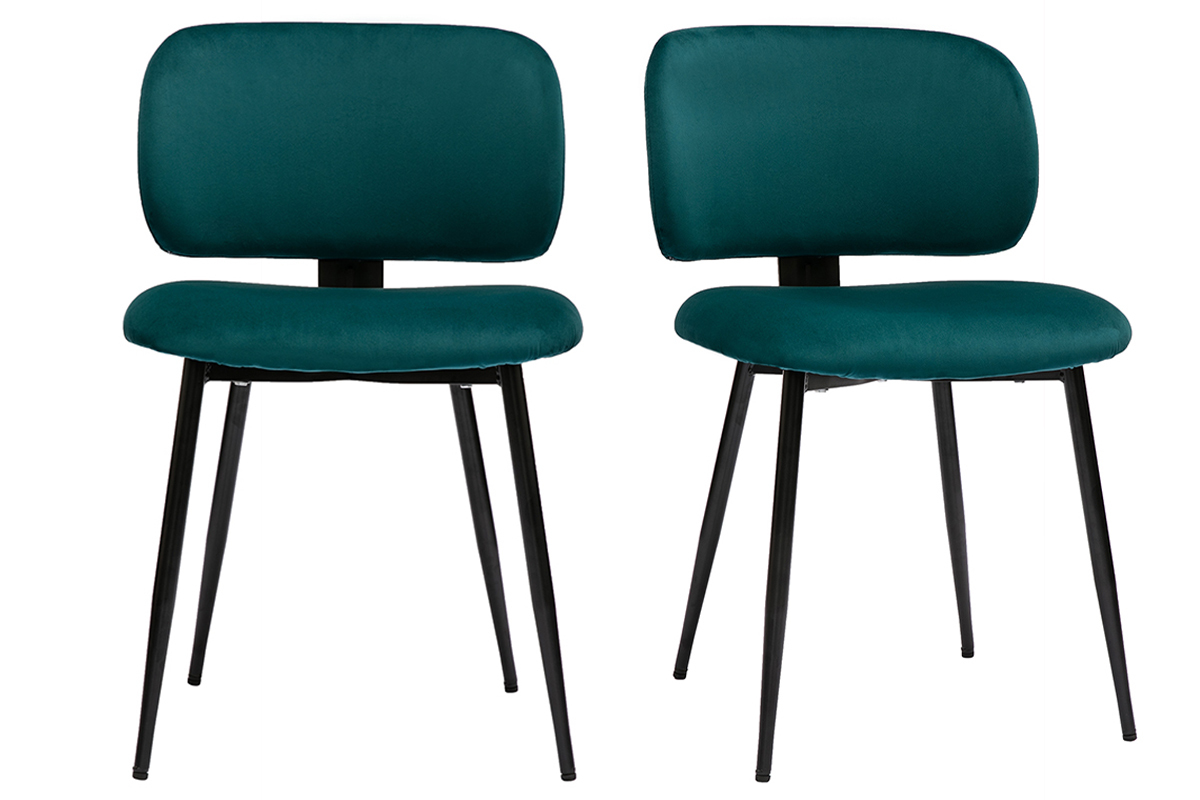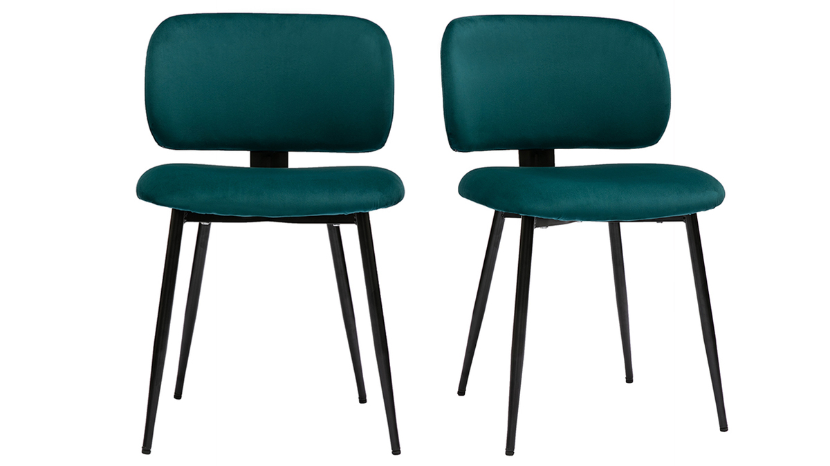 Chaises en tissu velours bleu pétrole et métal noir vendues par lot de 2 et livrées prêtes à monter. Montage simple, seuls les pieds sont à fixer.