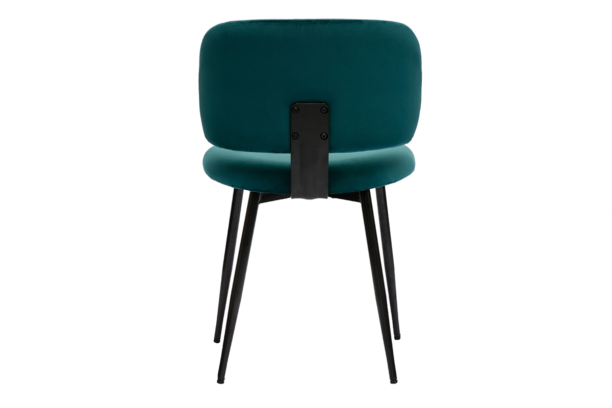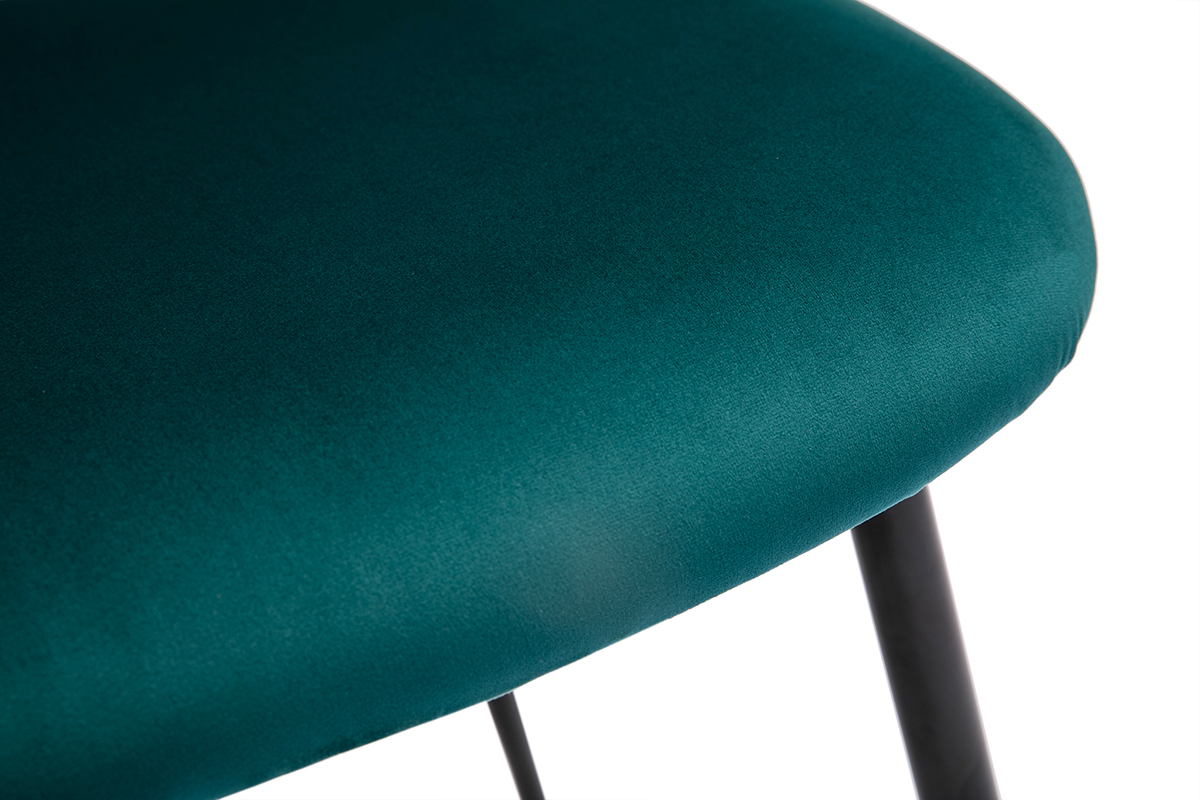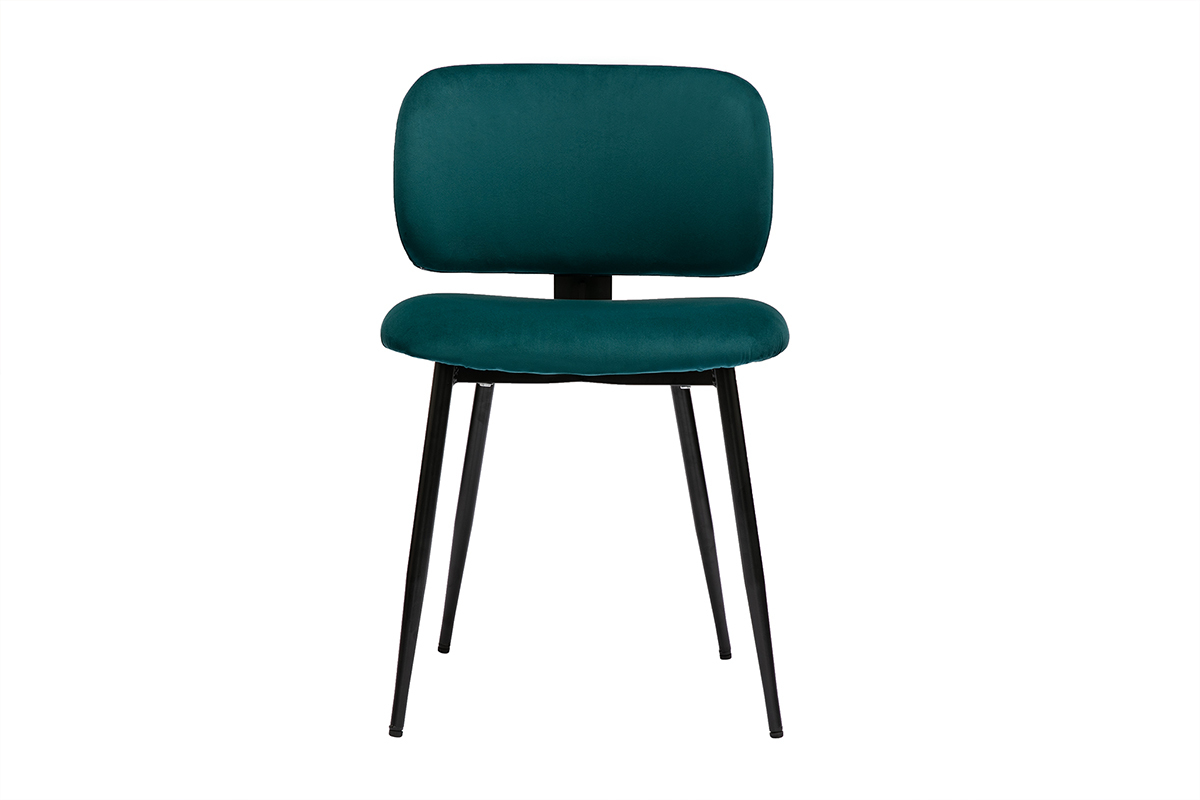 Chaises en tissu velours bleu pétrole et métal noir vendues par lot de 2 et livrées prêtes à monter. Montage simple, seuls les pieds sont à fixer.