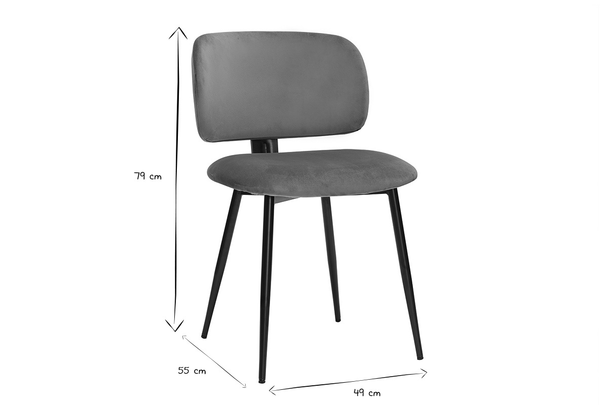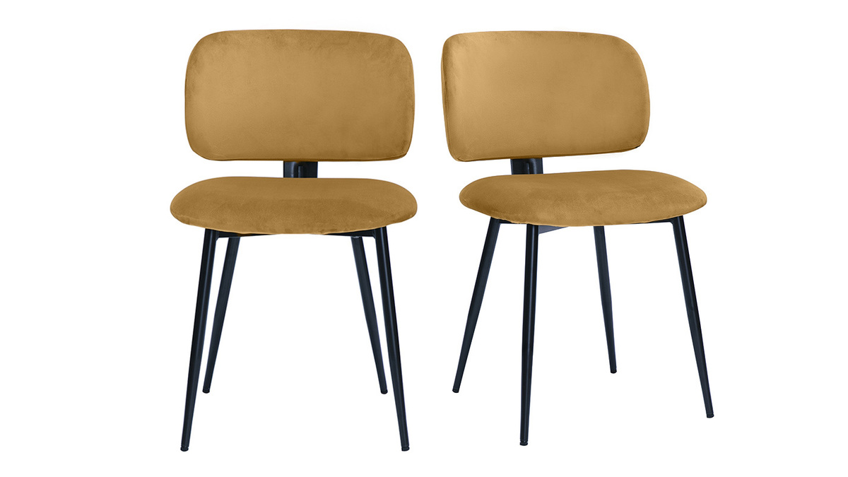 Chaises en tissu velours bronze et métal noir vendues par lot de 2 et livrées prêtes à monter. Montage simple, seuls les pieds sont à fixer.