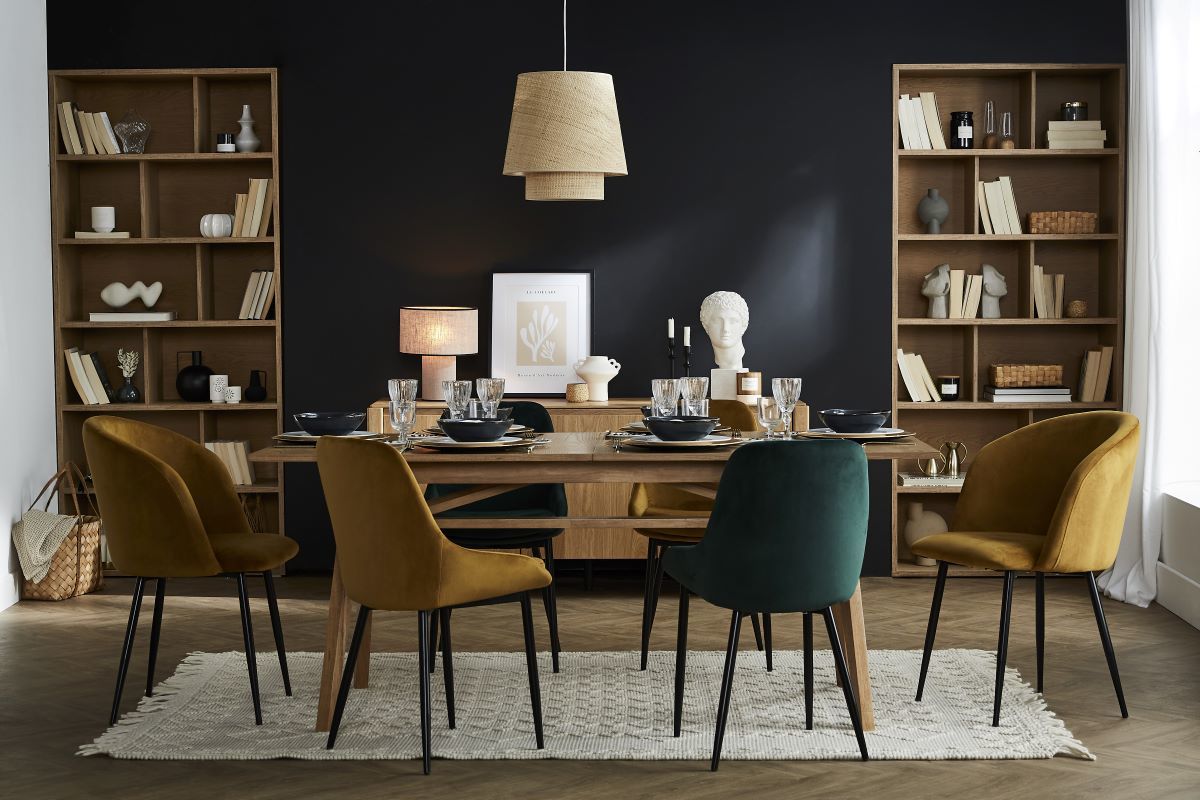 Les chaises HOLO associent l'élégance du velours à une forme englobante pour une salle à manger chic et cosy !