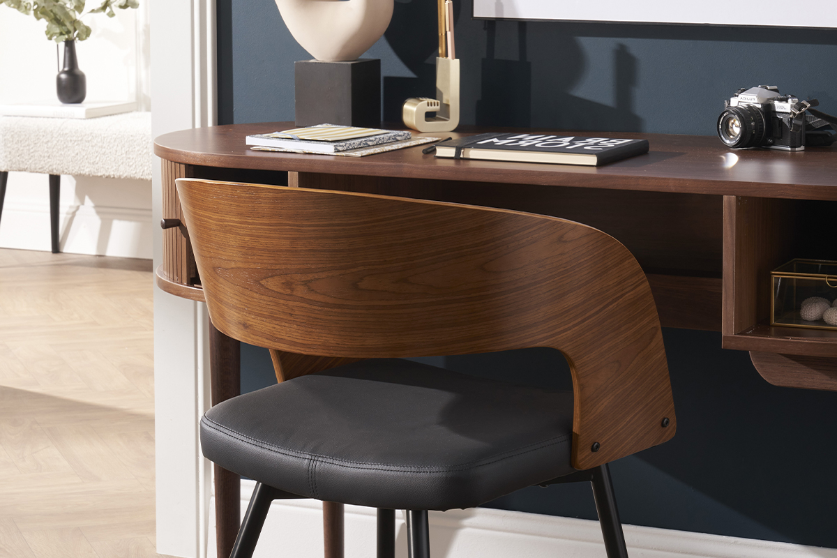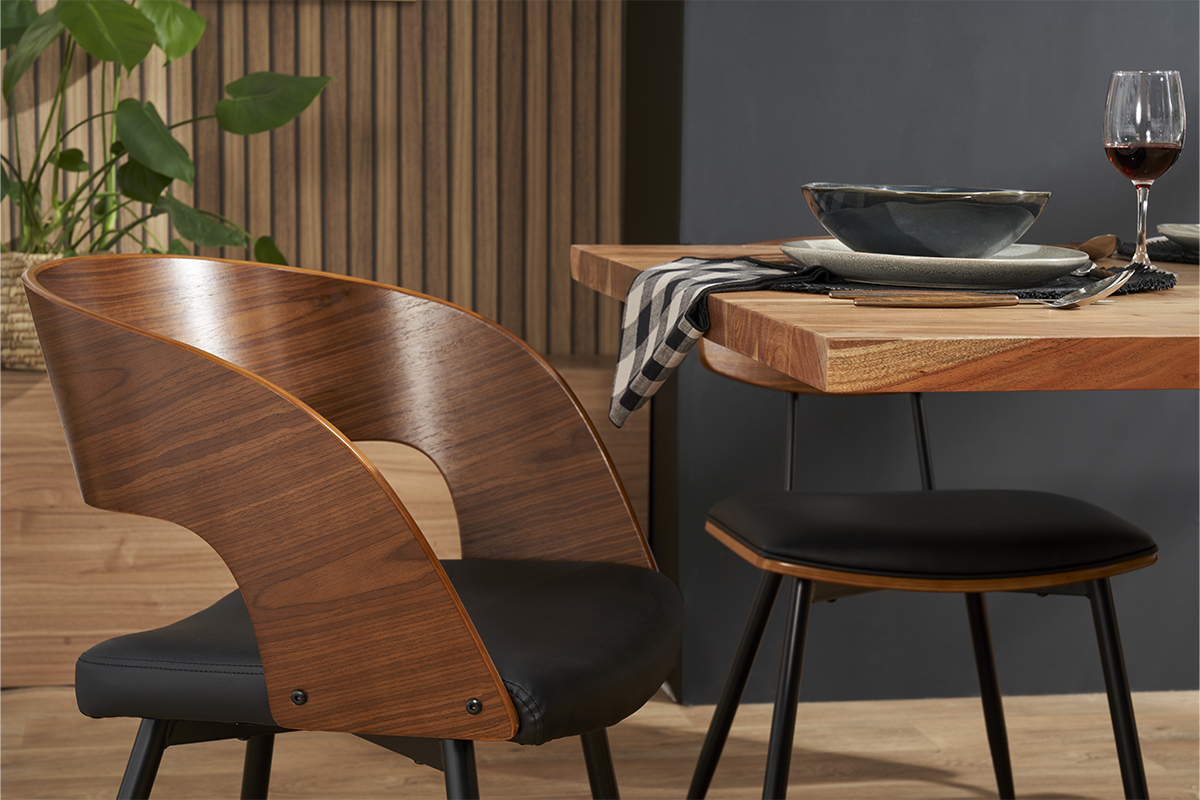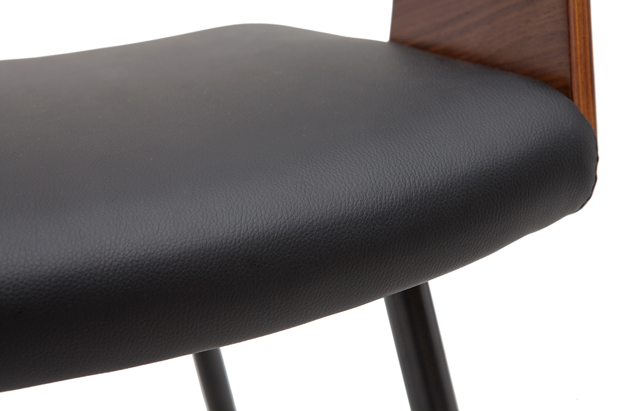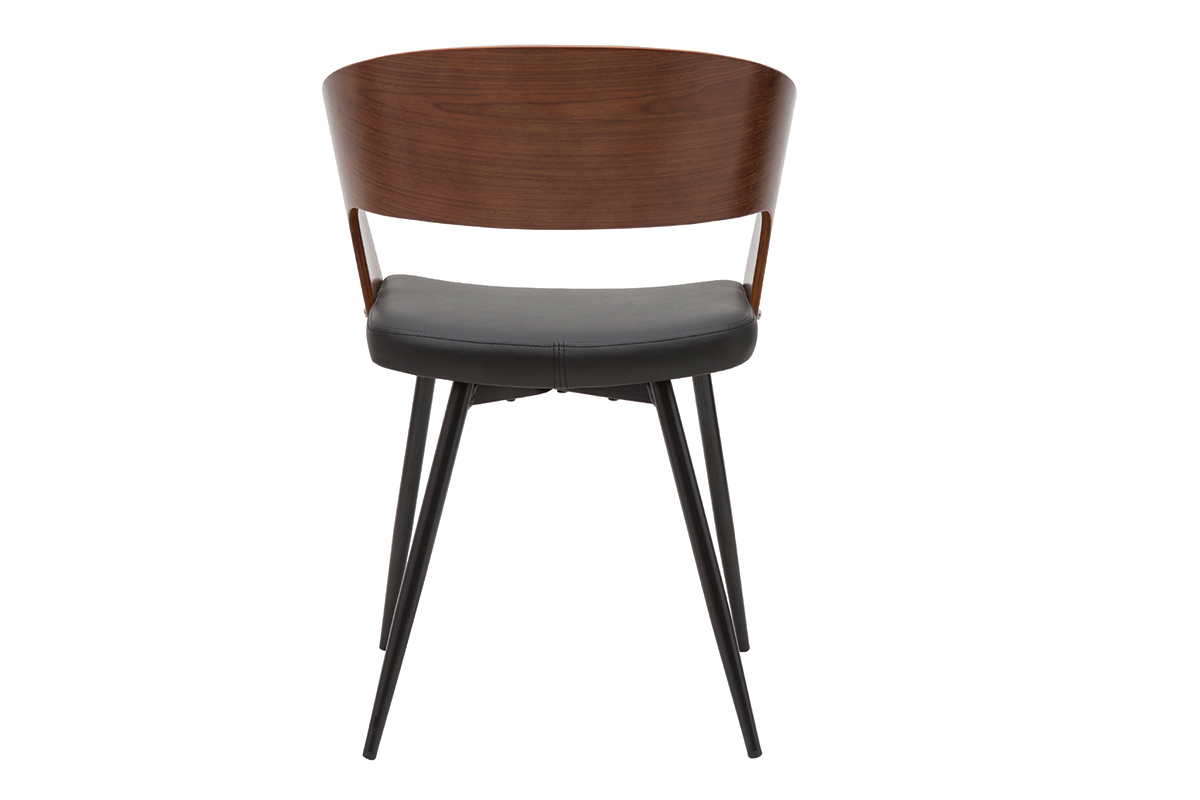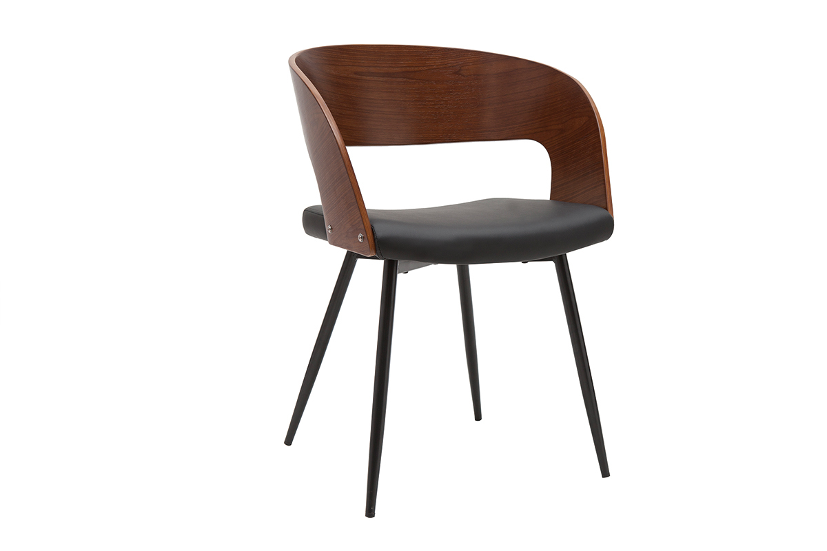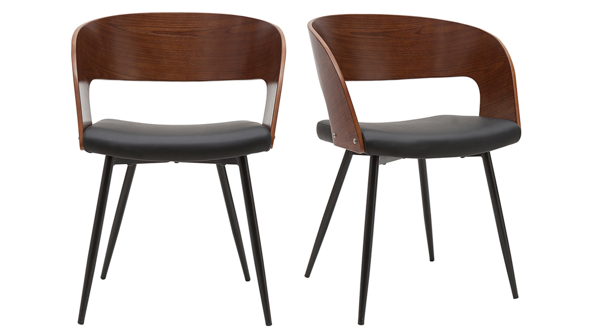 Ces chaises noires et bois foncé à la silhouette élancée se composent d'un dossier contreplaqué noyer et d'une assise rembourrée dont l'ensemble repose sur un piètement fuselé en métal noir. Le bois courbé adopte de jolies lignes fluides et dynamiques. Le bois foncé offre un superbe rendu avec son veinage contrasté et sa jolie nuance brune aux reflets dorés.
