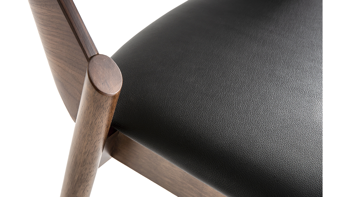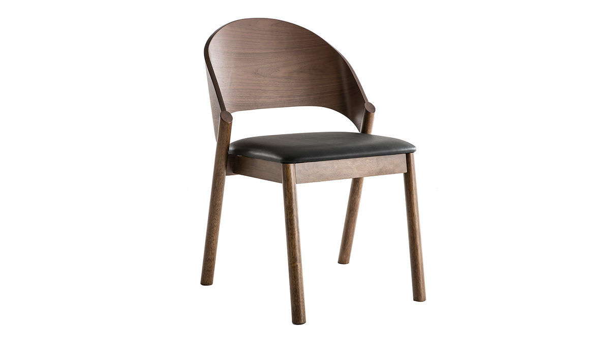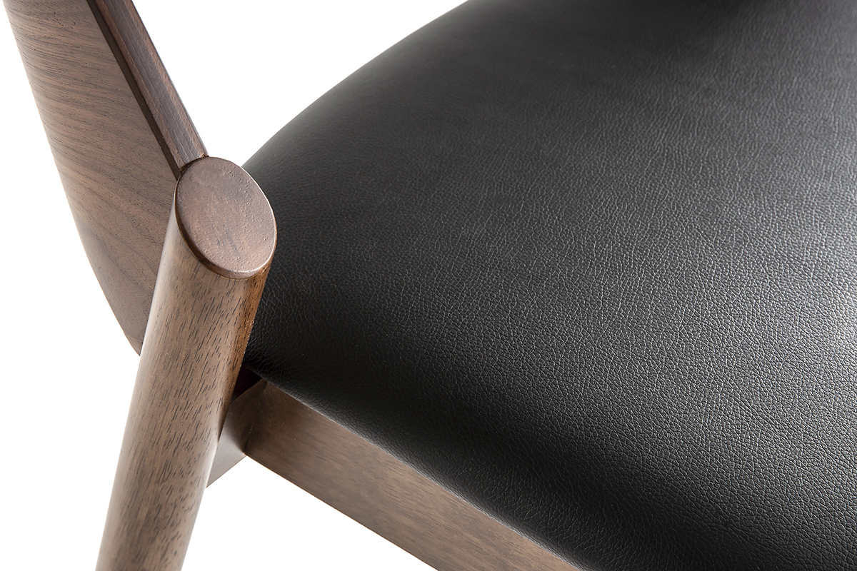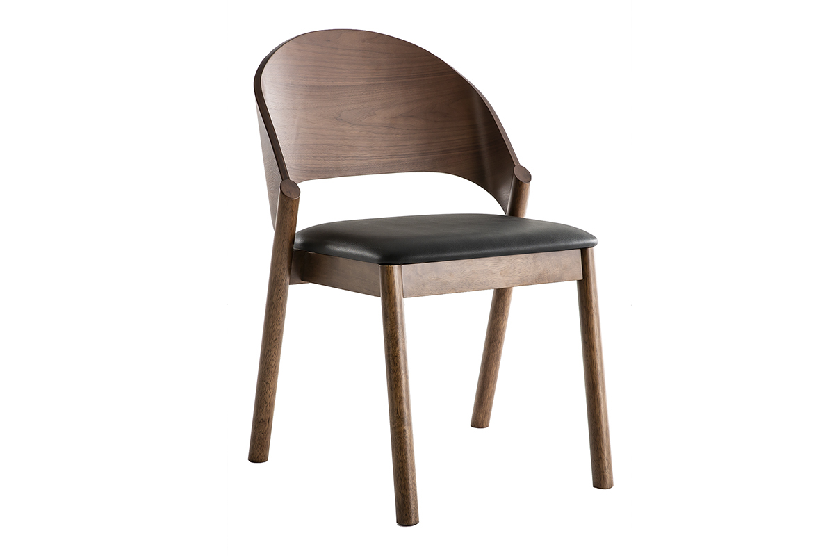 Les chaises AVALON se composent d'une structure contreplaqué noyer et d'un piètement en hévéa massif. La confortable assise est habillée d'un revêtement en polyuréthane noir qui contraste à merveille avec le noyer.