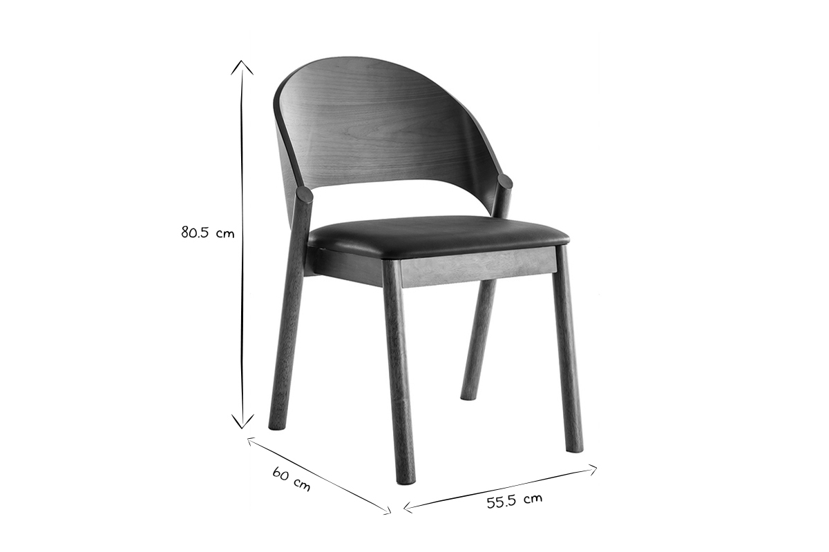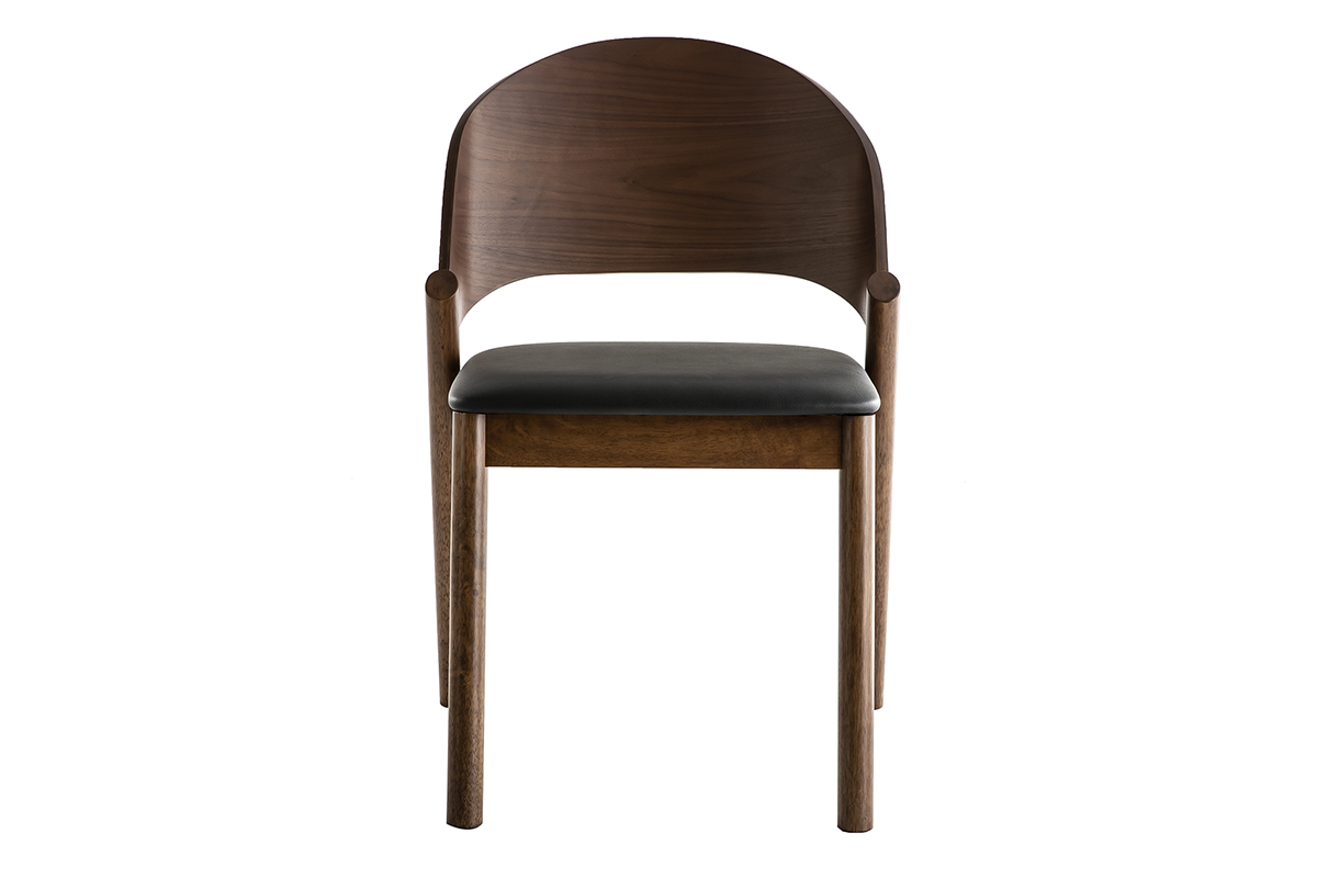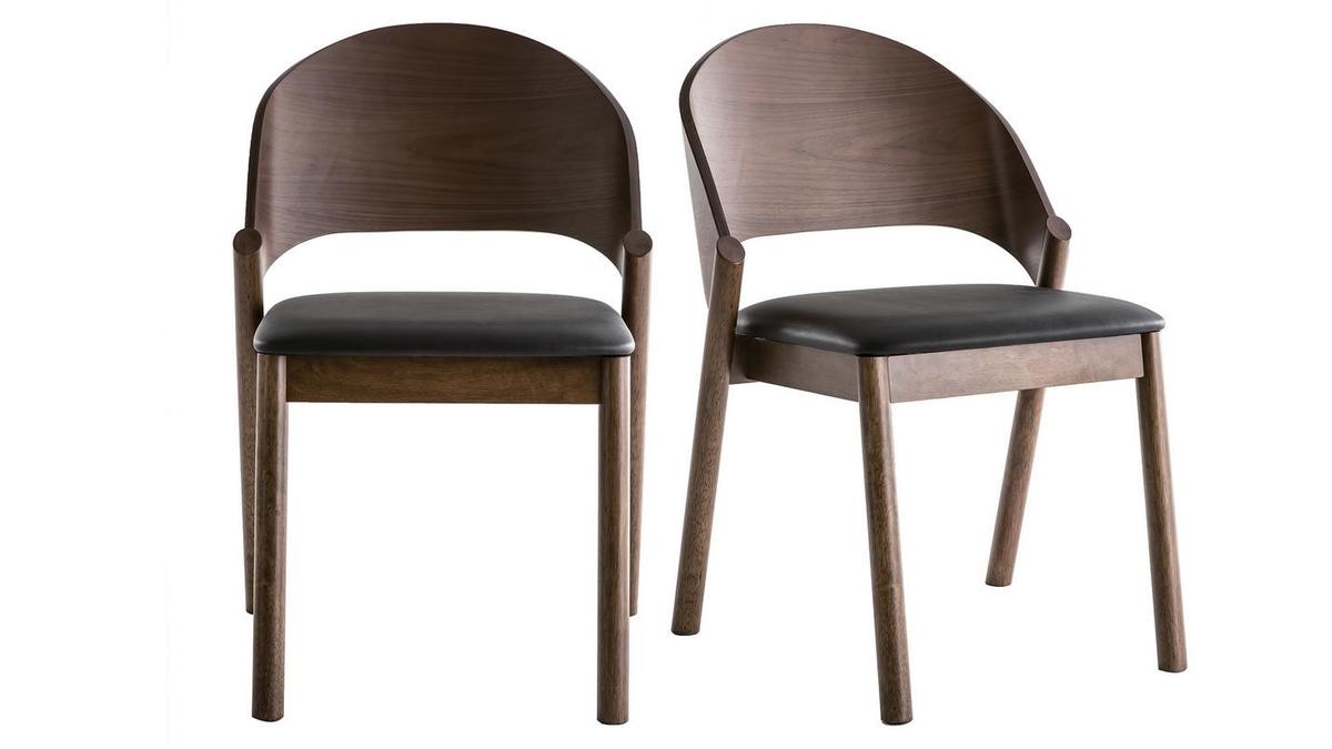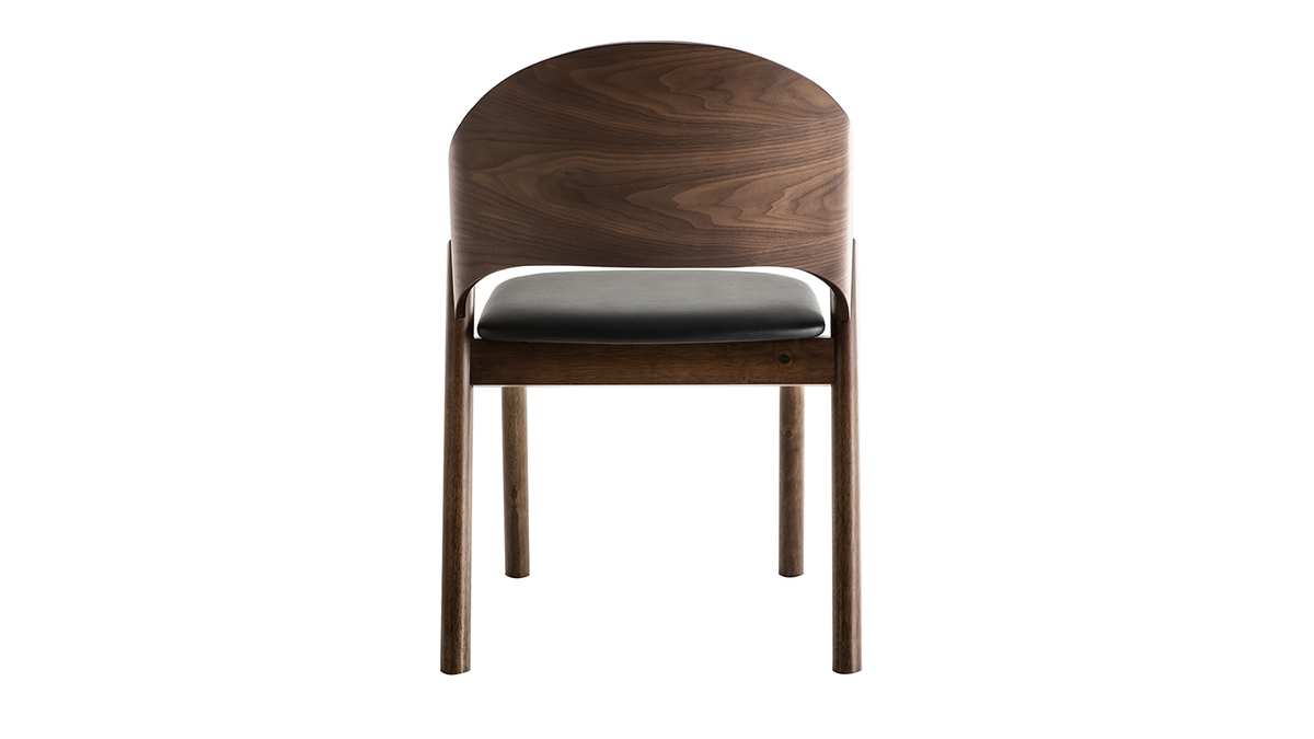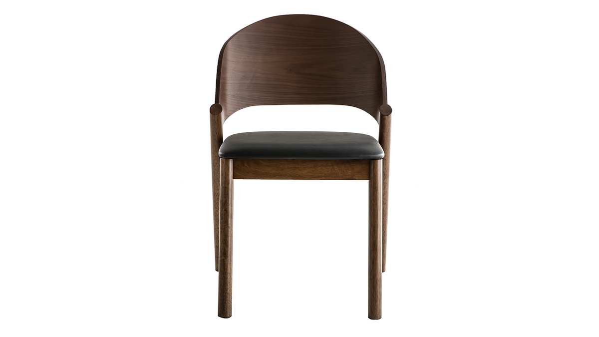 Les chaises AVALON se composent d'une structure contreplaqué noyer et d'un piètement en hévéa massif. La confortable assise est habillée d'un revêtement en polyuréthane noir qui contraste à merveille avec le noyer.