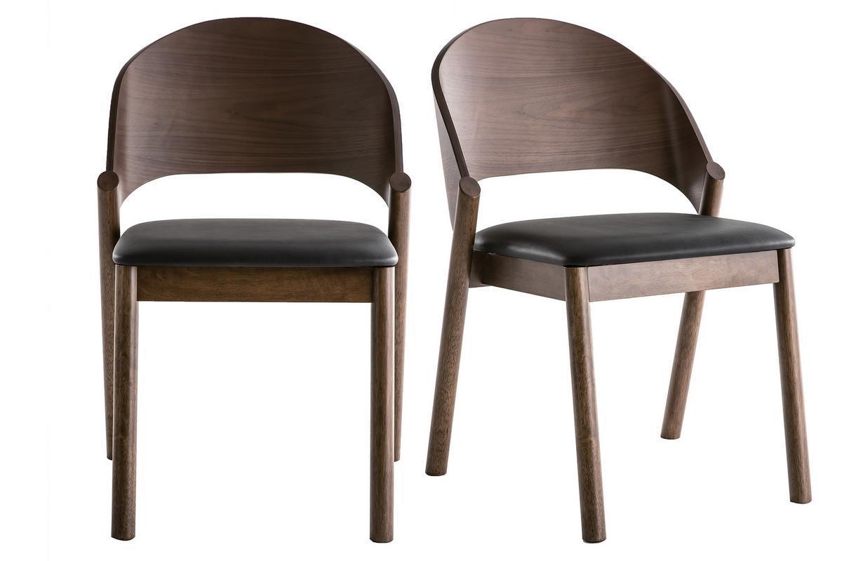 Chaises vintage en bois foncé noyer et assises noires AVALON vendues par lot de 2. Livrées prêtes à assembler.
