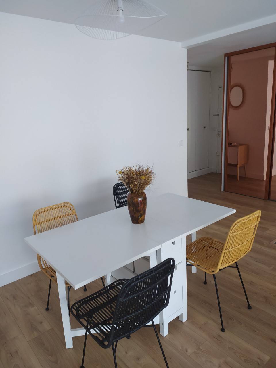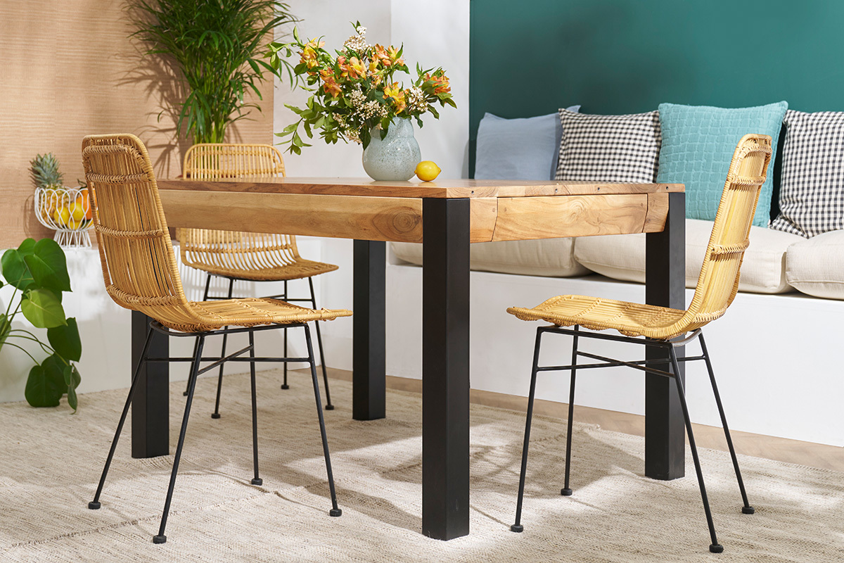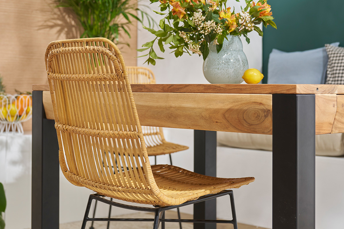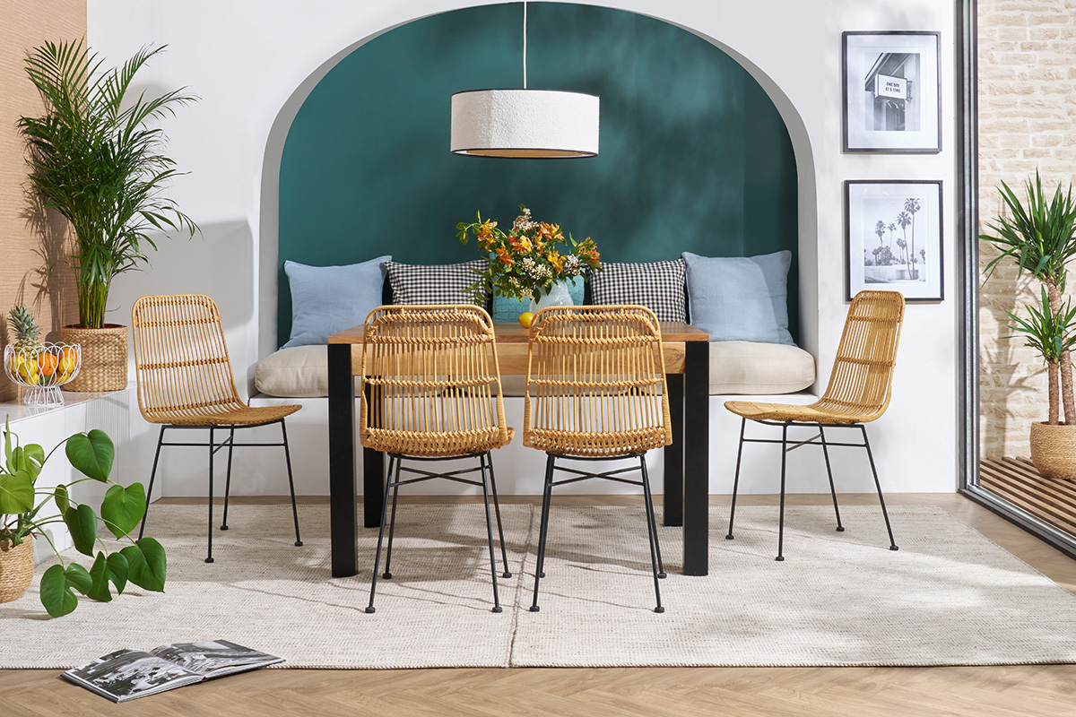 Pour une atmosphère conviviale et chaleureuse, disposez ces chaises en rotin design autour d'une table en bois.