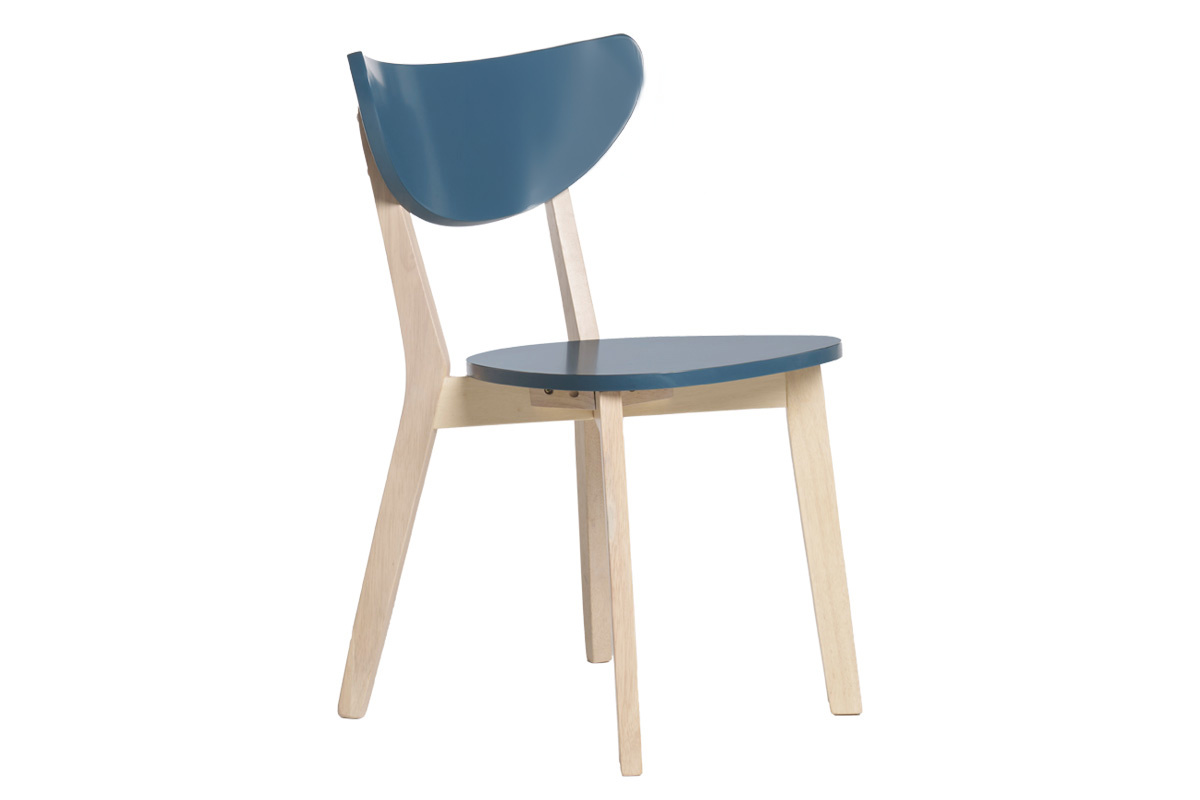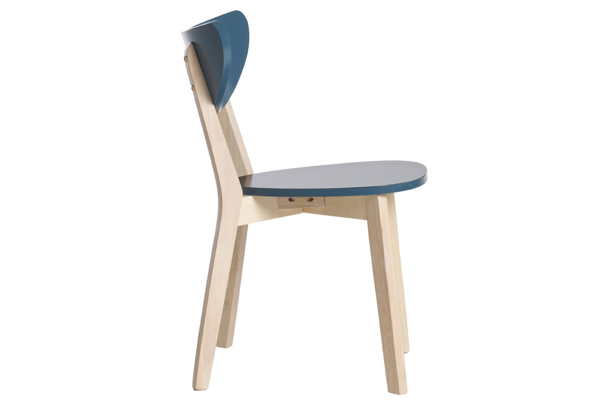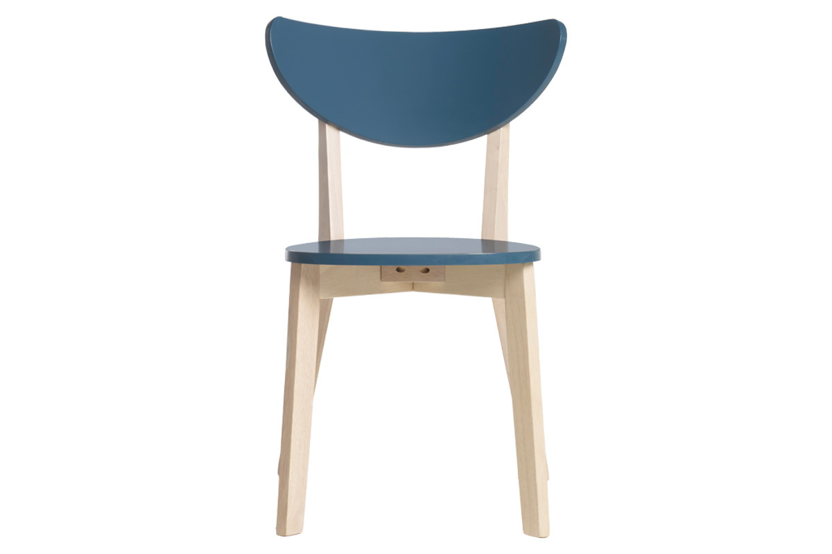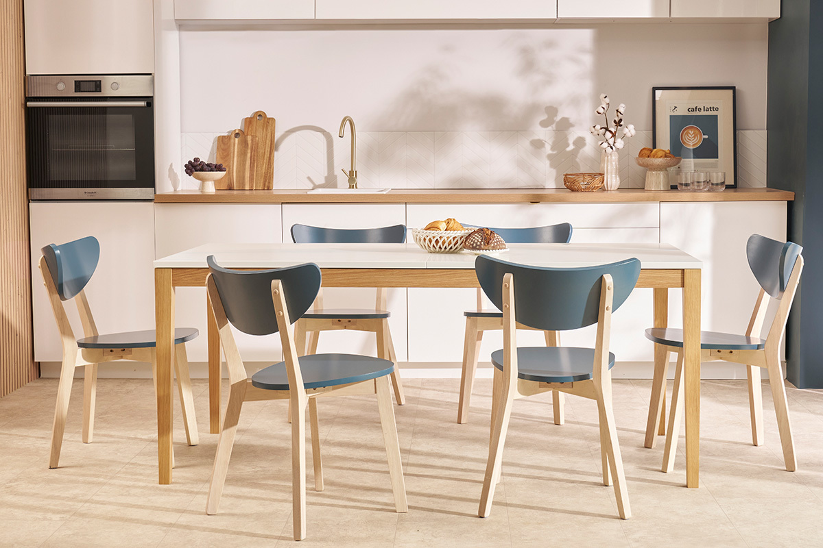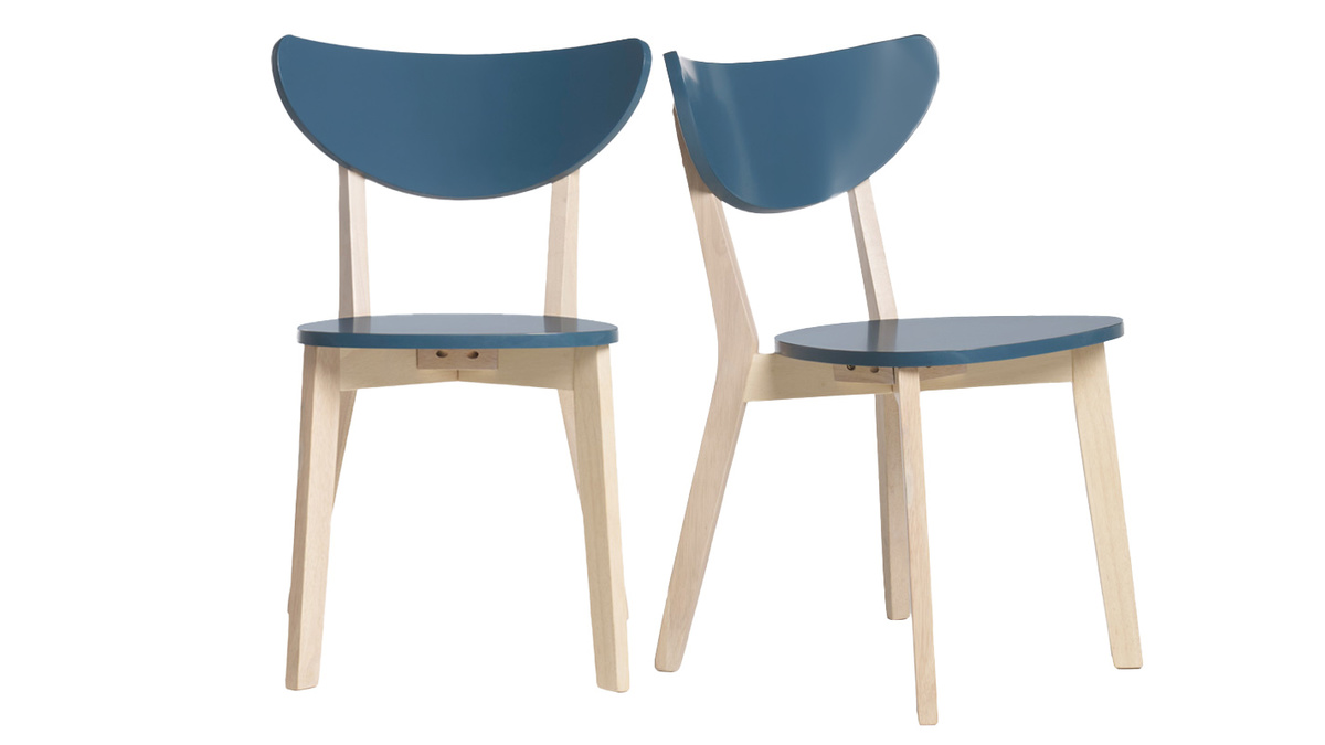 La jolie harmonie entre le bois clair et la couleur bleu de leur assise et de leur dossier fait de ces chaises de cuisine ou salle à manger de beaux sièges nordiques au style délicat. Le bleu canard est idéal pour apporter une touche chic et moderne autour de la table à manger. Le bois est un matériau apprécié dans les espaces repas pour son rendu chaleureux et convivial. Ces chaises scandinaves associent ces deux éléments à un design épuré travaillé tout en courbes pour créer un espace repas plein de douceur et de style.