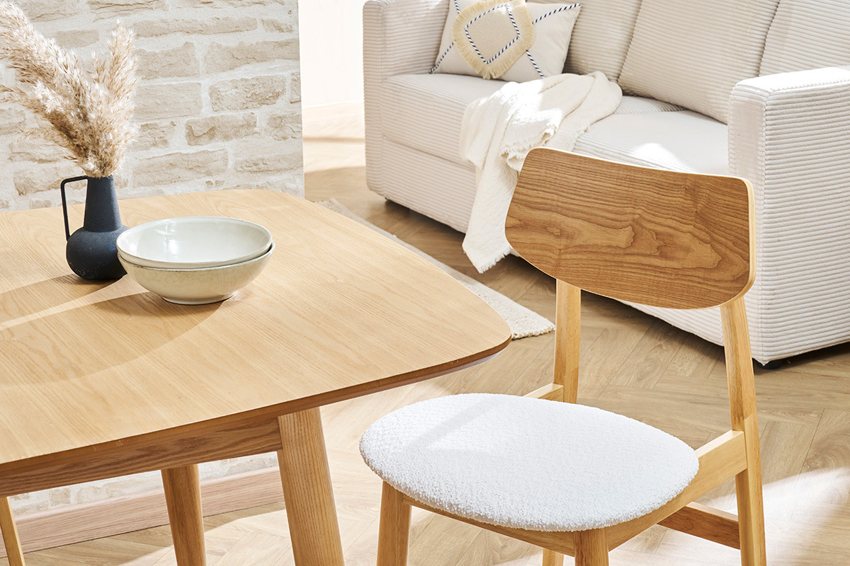 Accompagnées d'une table à manger en bois pour toujours plus d'authenticité, ces chaises en bois et tissu bouclette écru au charme intemporel définissent les contours d'un espace repas hautement inspirant.
