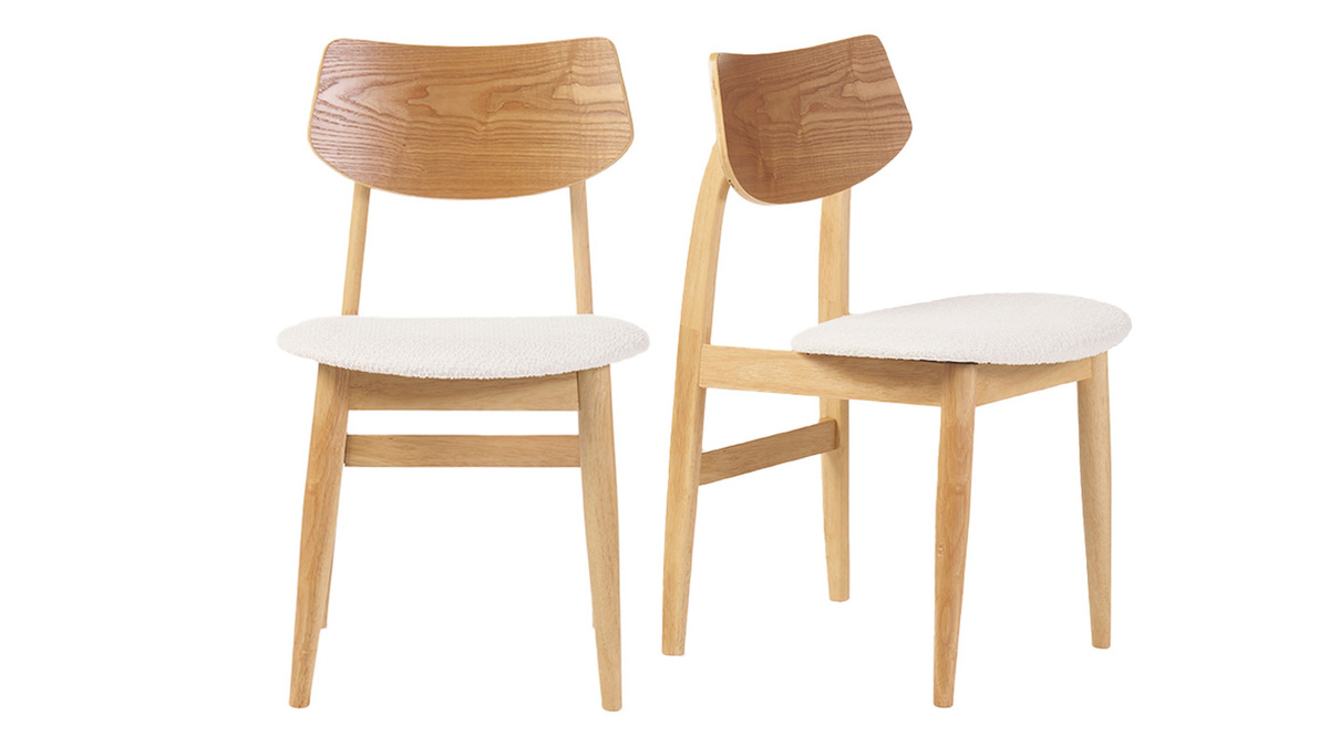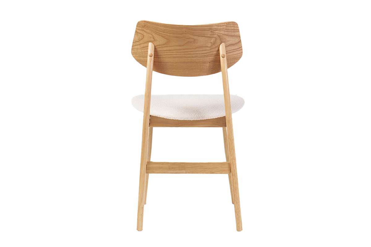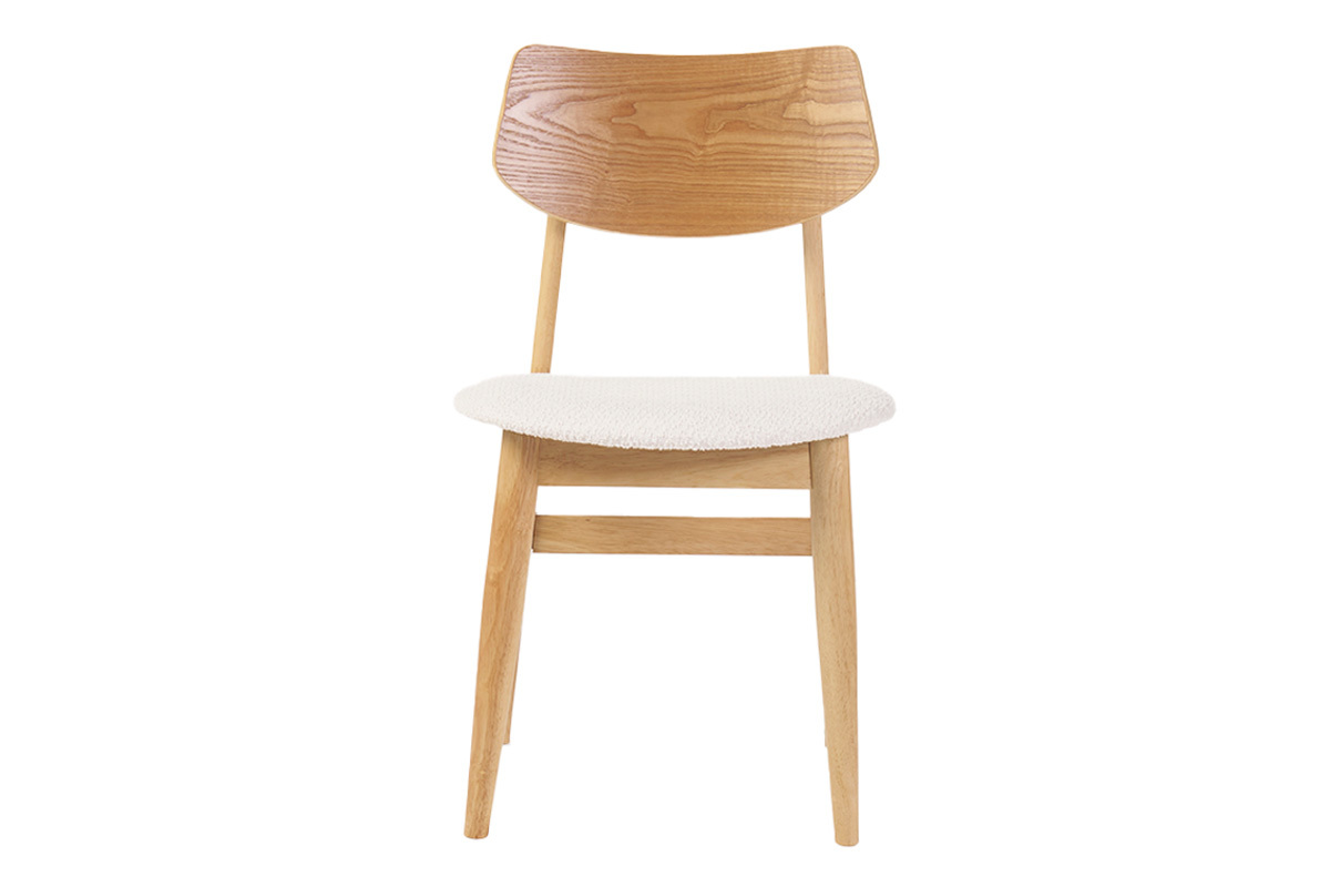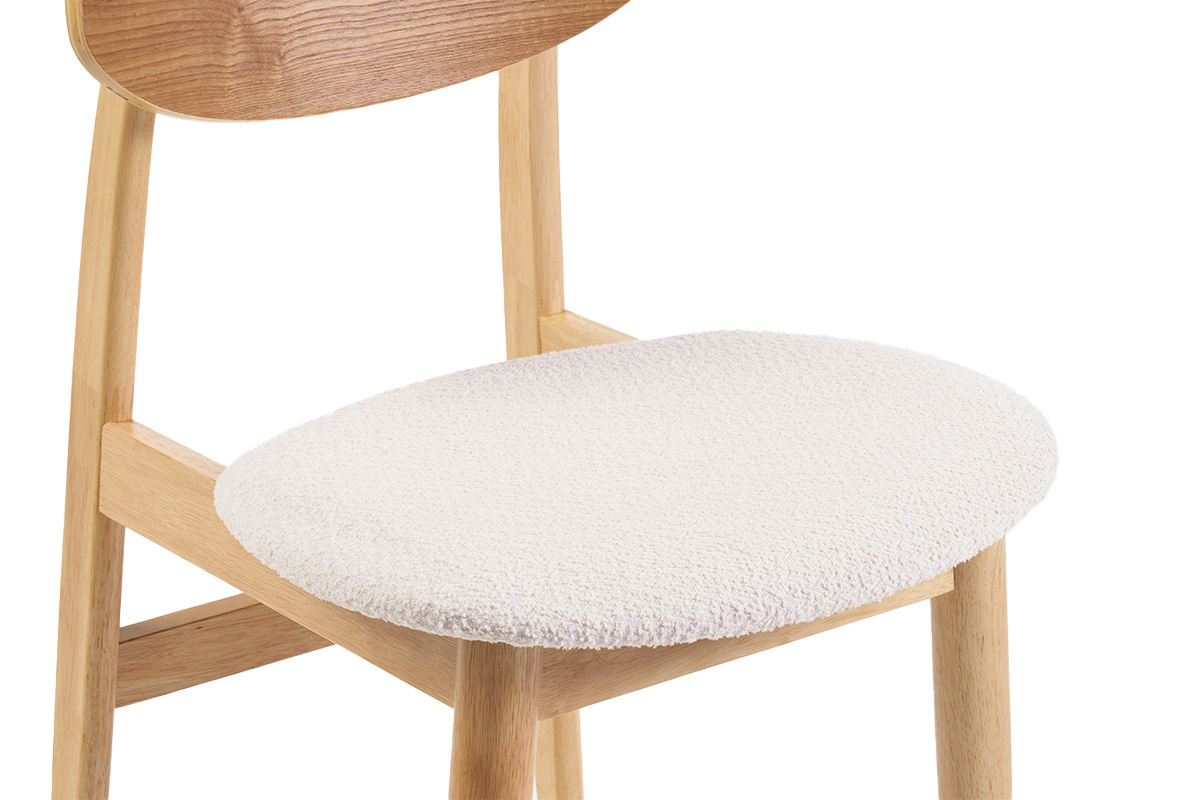 Ces chaises scandinaves à la silhouette simple et légère conjuguent confort et élégance. Réalisé à partir de contreplaqué frêne, le large dossier (L43 x H34.5 cm) peut être installé sur la structure dans les deux sens : arc de cercle orienté vers le haut ou vers le bas. Une chaise design, deux styles pour s'adapter à votre tablée ! L'accueillante assise rembourrée (L46 x P40.5 cm) scelle la promesse d'un confort durable. Habillé d'un joli tissu effet laine bouclée blanc (100% polyester), le siège s'accorde à merveille avec le bois et ses belles nuances dorées.