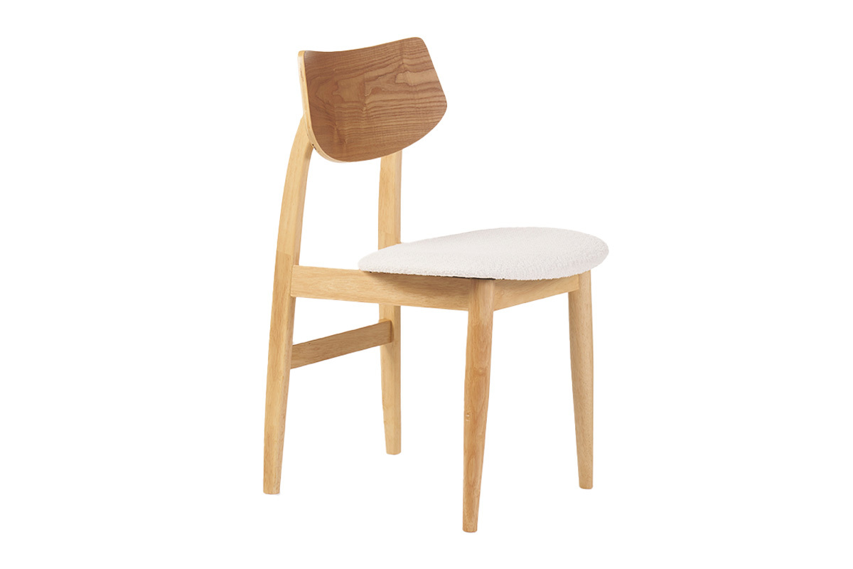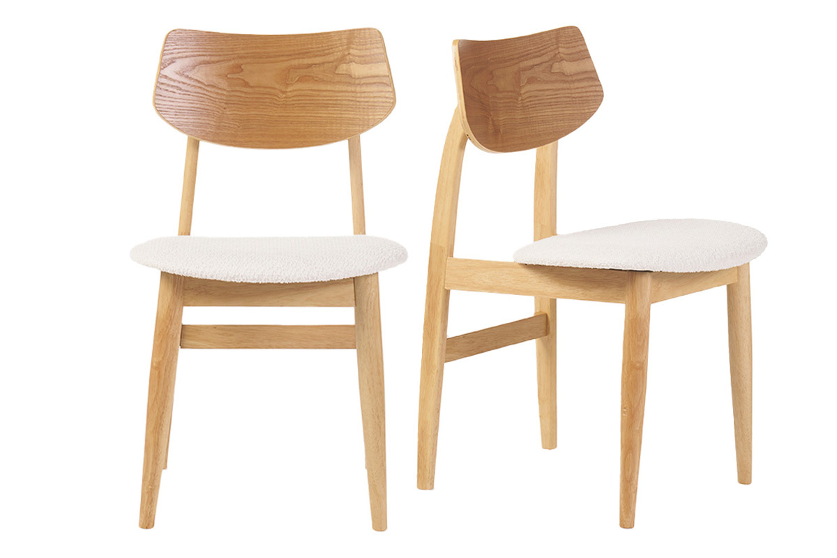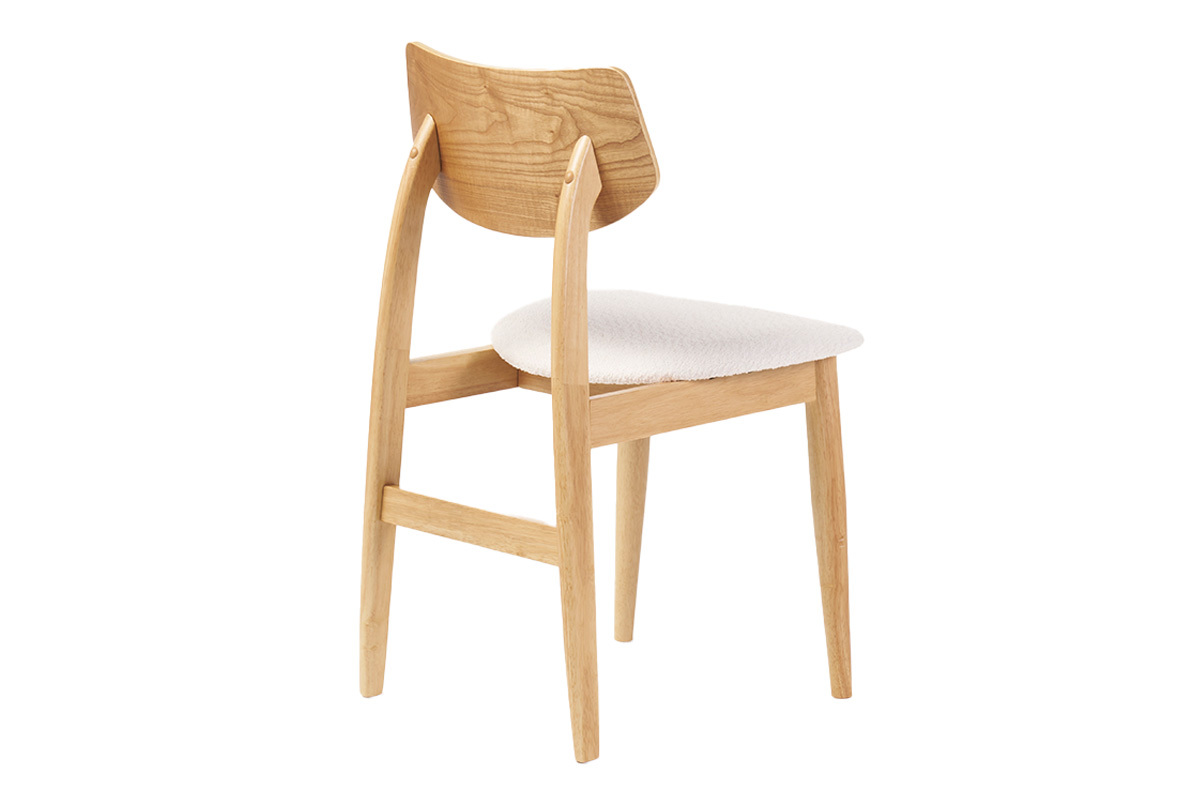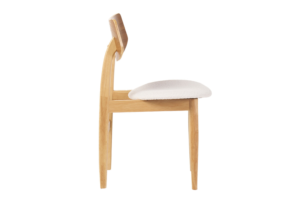 Ces chaises scandinaves à la silhouette simple et légère conjuguent confort et élégance. Réalisé à partir de contreplaqué frêne, le large dossier (L43 x H34.5 cm) peut être installé sur la structure dans les deux sens : arc de cercle orienté vers le haut ou vers le bas. Une chaise design, deux styles pour s'adapter à votre tablée ! L'accueillante assise rembourrée (L46 x P40.5 cm) scelle la promesse d'un confort durable. Habillé d'un joli tissu effet laine bouclée blanc (100% polyester), le siège s'accorde à merveille avec le bois et ses belles nuances dorées.