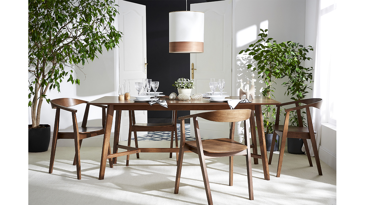 Pour un espace repas harmonieux, accompagnez les BAHIA d'une table à manger en bois massif. Une suspension en fibres viendra parfaire le décor et réchauffer d'autant plus l'atmosphère !